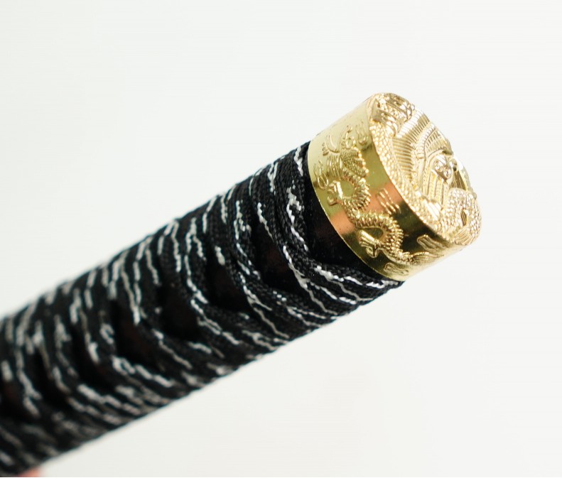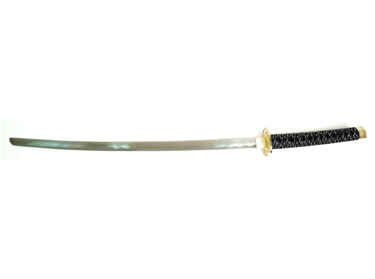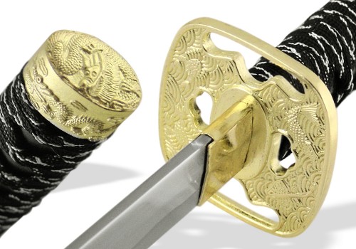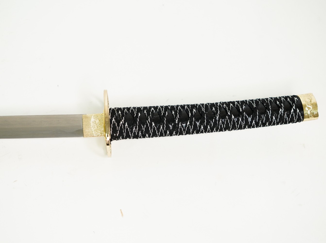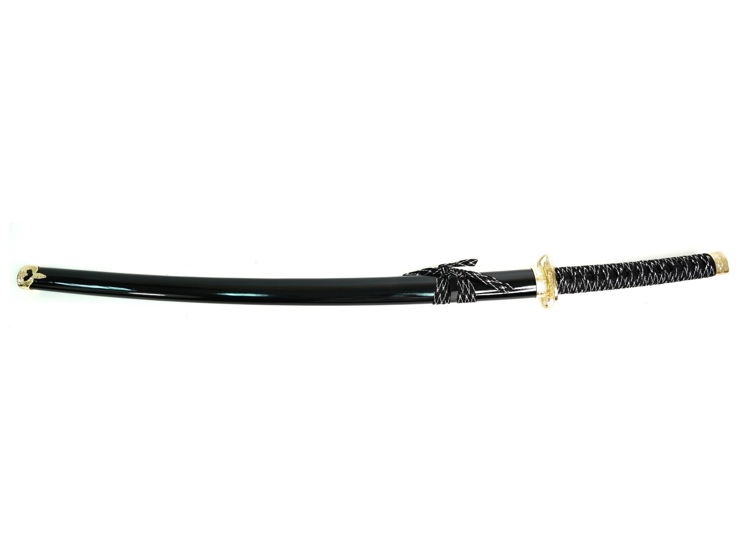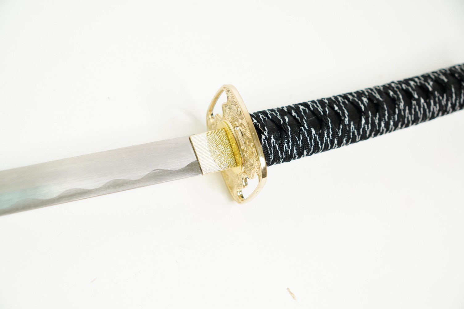 Недорогой самурайский меч Катана с цубой окрашенной под золото и классическими черными ножнами. Великолепно подходит для оформления интерьера в японском стиле. Настольная подставка в комплекте.