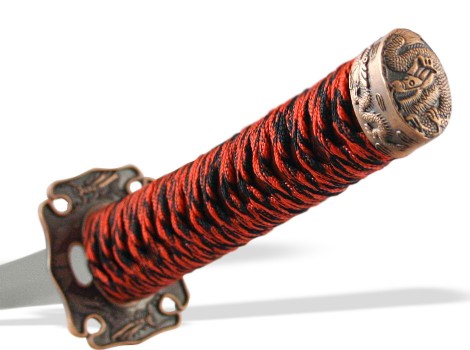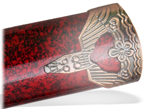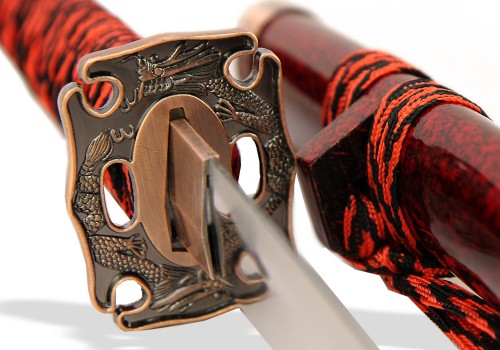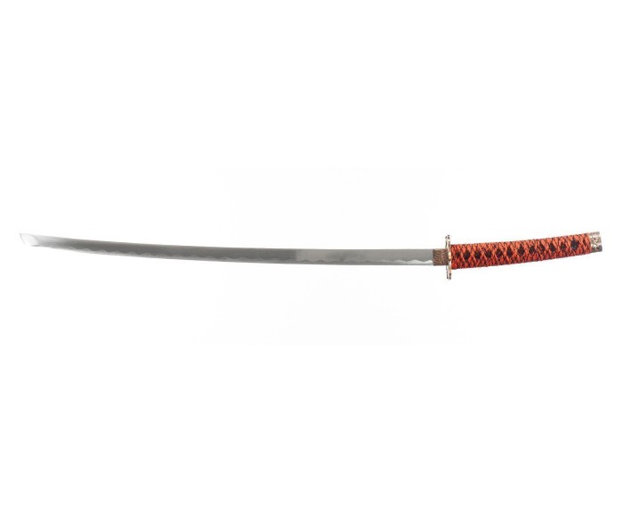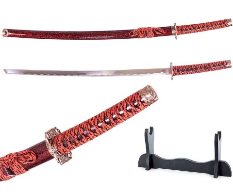 Яркая и эффектная японская Катана с великолепными ножнами в цвете бордовый мрамор и рукоятью черно-красного цвета. Бесподобный подарок поклонникам японской культуры и интерьера в японском стиле. Настольная подставка в комплекте.