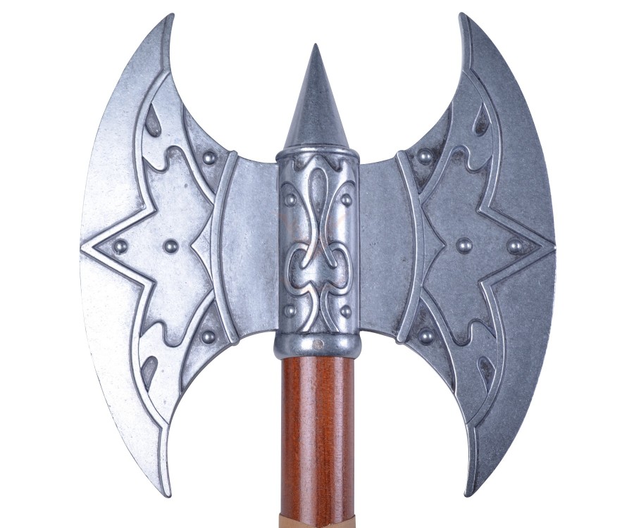 Секира валькирий выполнена в точном соответствии с историческим оригиналом. Древко этого оружия имеет имитацию обмотки, препятствующей скольжению оружия в руке воина. Лезвие выглядит острым, однако на самом деле оно не заточено и в принципе его заточка невозможна, поэтому такой экземпляр будет совершенно безопасным приобретением. На лезвие с двух сторон нанесен незамысловатый выпуклый рисунок. Длина оружия с топорищем составляет 71 см, вес – 1,38 кг.