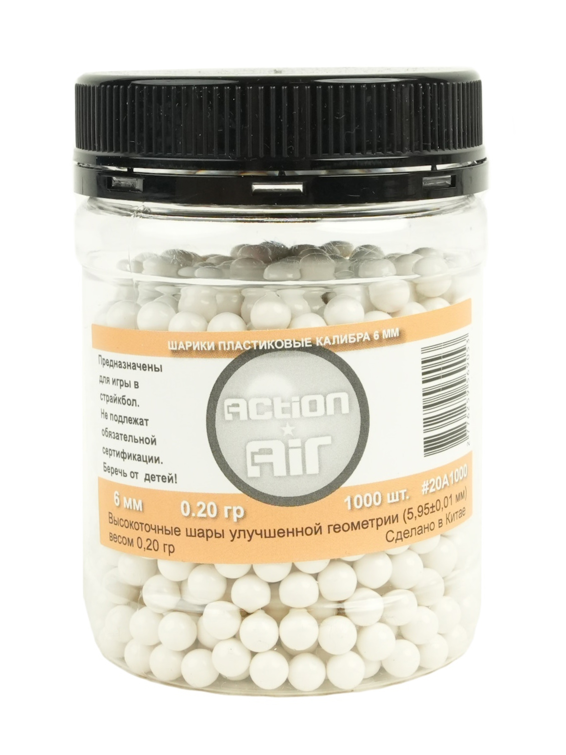 Шарики Action Air представляют собой пластиковые шарики весом 0,20 грамм, используемые для стрельбы из страйкбольных пистолетов калибра 6 мм. В упаковке 1000 шариков.