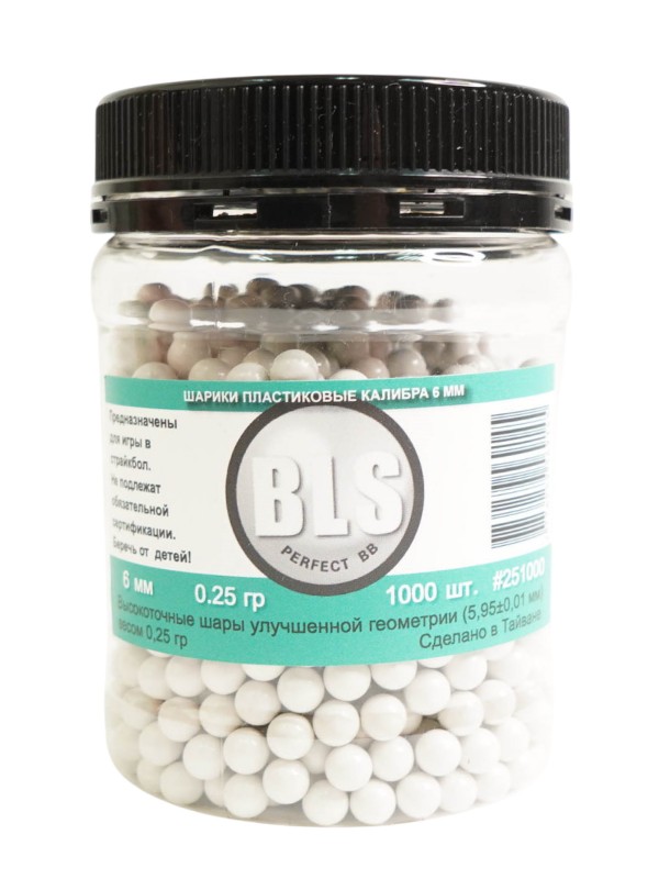 Пластиковые шарики калибром 6 мм BLS весом 0,25 грамм предназначены для стрельбы из страйкбольных пистолетов и винтовок. Количество в баночке - 1000 штук. Диаметр 5,95 мм, погрешность в диаметре этих шариков составляет всего 0,01 мм.