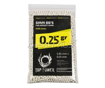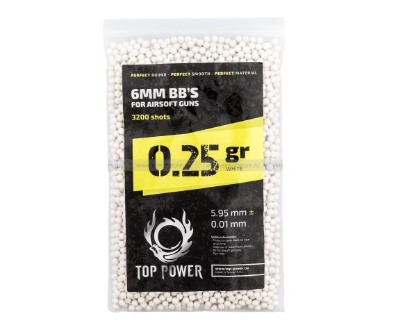Легкие шары Top Power калибра 6 мм, белого цвета, с массой 0,25 грамм отлично подходят для стрельбы из страйкбольных пистолетов и приводов. В упаковке примерно 3200 штук. Диаметр 5,95 мм, погрешность в диаметре этих шариков составляет всего 0,01 мм.