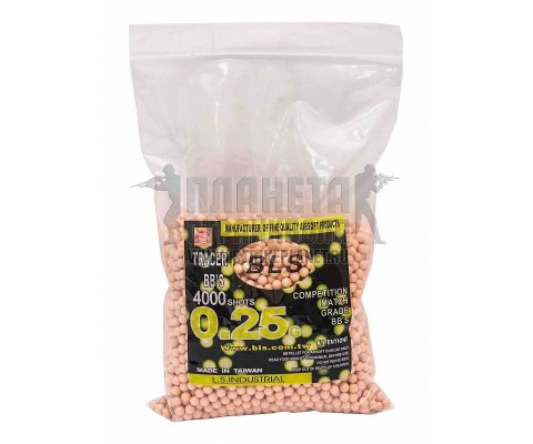 Пластиковые трассирующие шарики калибром 6 мм BLS Tracer весом 0,25 граммов предназначены для стрельбы из страйкбольных пистолетов и винтовок. В упаковке - 4000 штук, 1 килограмм. Диаметр 5,95 мм, погрешность в диаметре этих шариков составляет всего 0,01 мм.