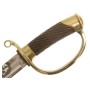 Рукоять деревянная, с продольными наклонными желобками. На верхней части рукояти фигурная металлическая втулка, на которую сверху насажена овальная выпуклая головка. Гарда образована передней дужкой, отходящей от верхней части рукояти и плавно переходящей в крестовину. Конец крестовины имеет отверстие, слегка загнут вниз и закруглен.