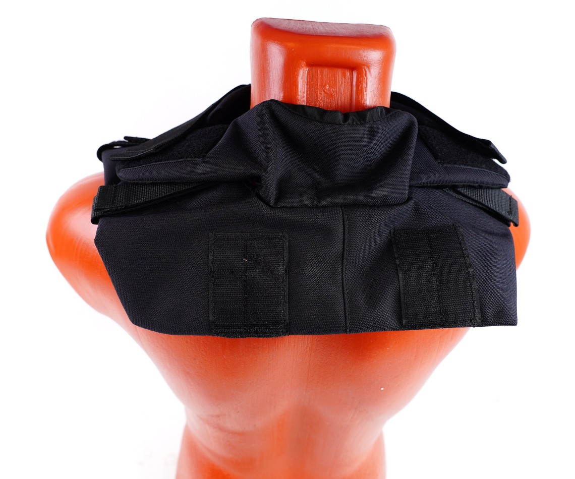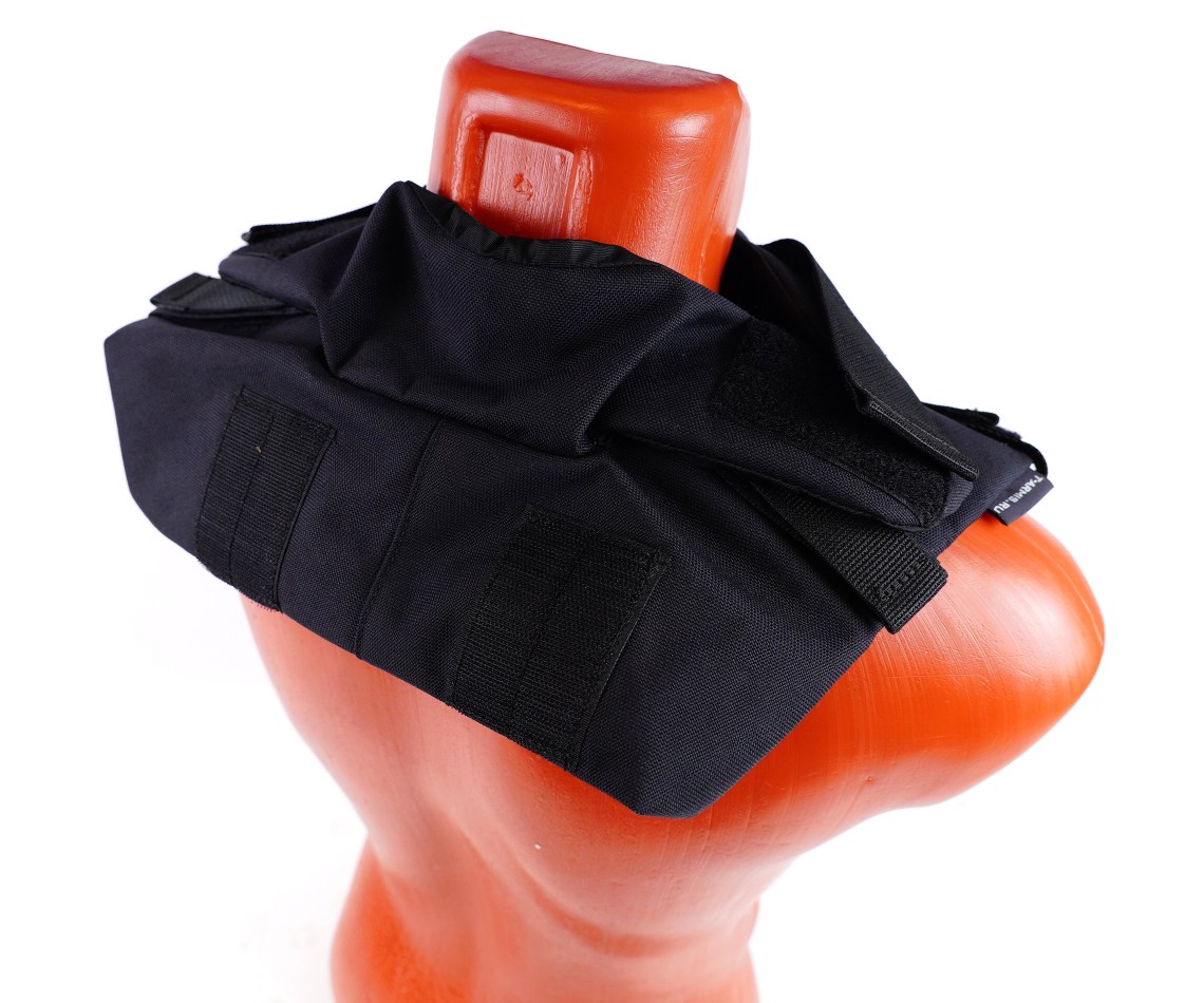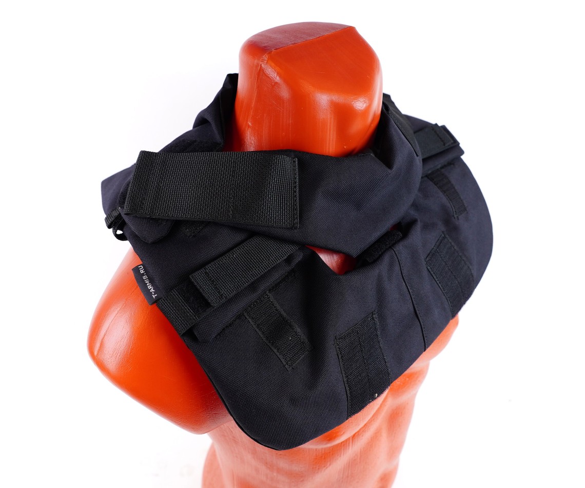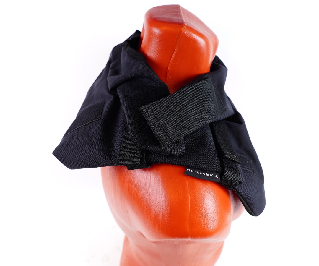 Шейно-плечевой защитный модуль предназначен для защиты шейной области от первичных (прямые осколки) и вторичных (разлетающиеся фрагменты пули при попадании в нательный бронеэлемент) поражающих элементов. Регулировка воротника обеспечивает как максимальное прилегание к шее, так в стороны от нее, что обеспечивает свободу движений головы. Основной внутренний объем накладки соединен с полостью воротника, что позволяет устанавливать шейный бронеэлемент под нахлест плечевого