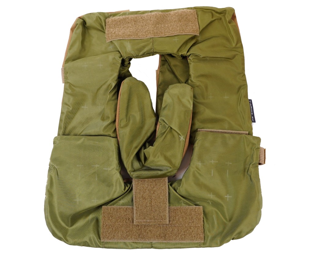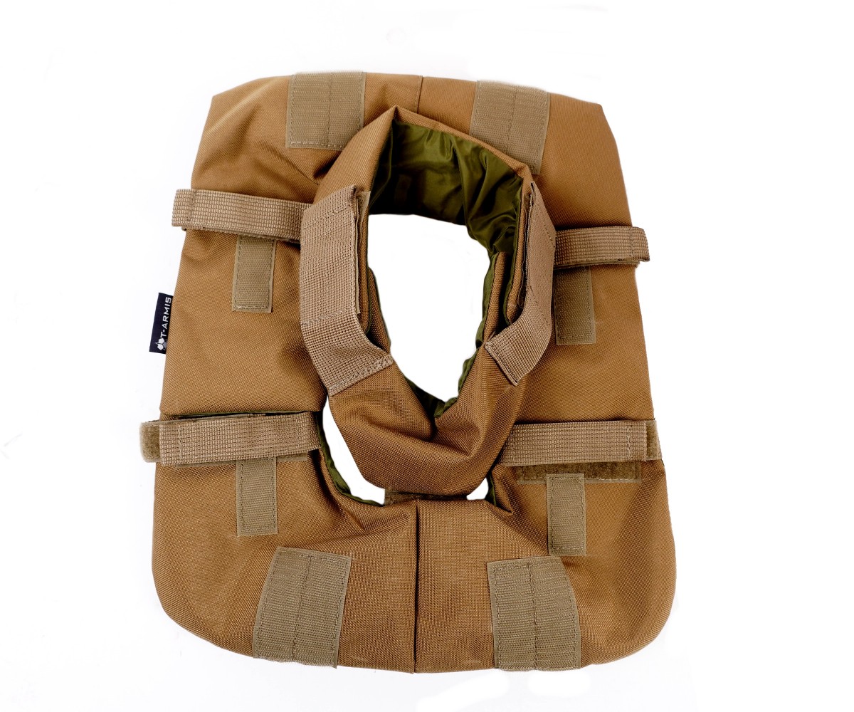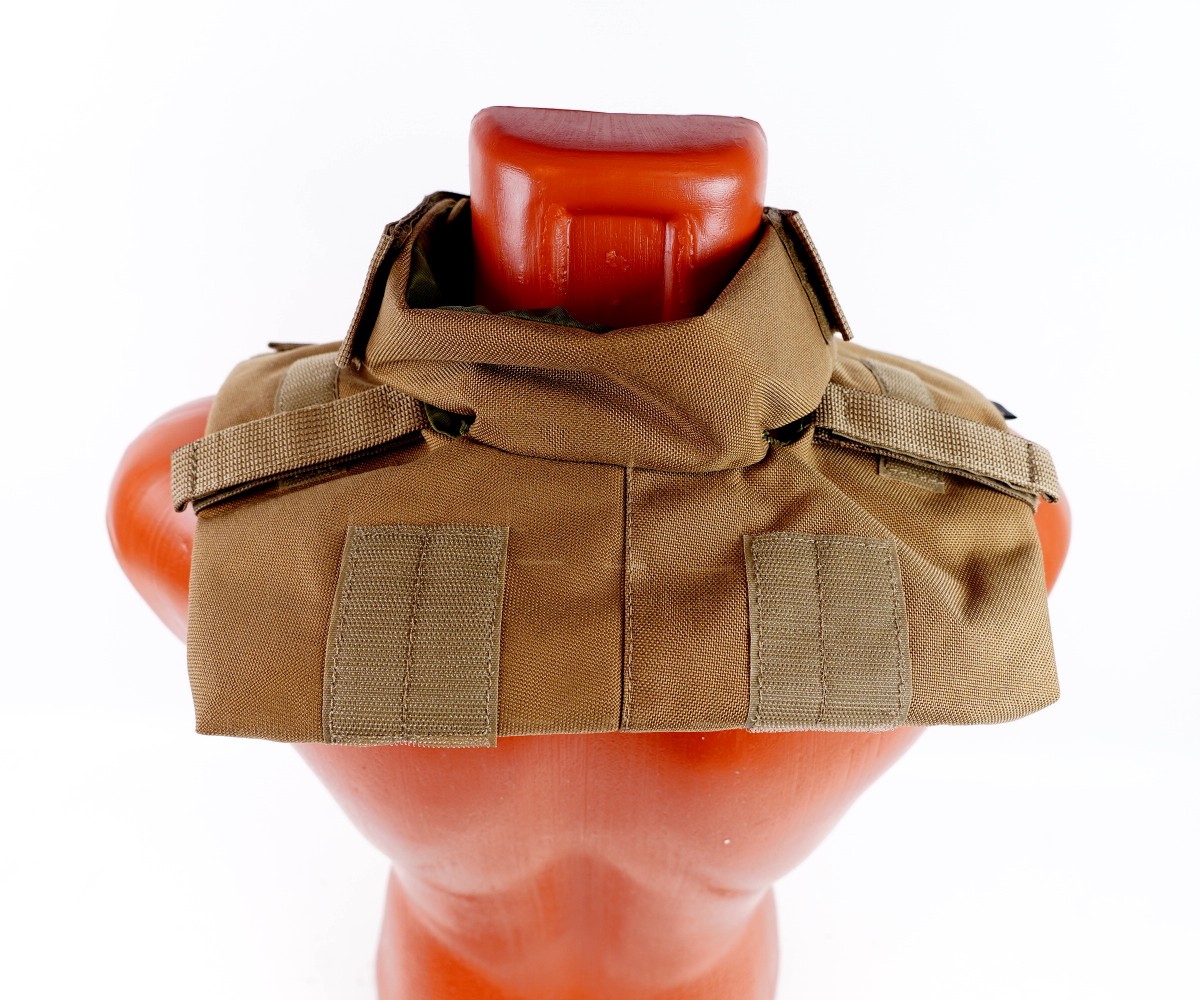 Шейно-плечевой защитный модуль предназначен для защиты шейной области от первичных (прямые осколки) и вторичных (разлетающиеся фрагменты пули при попадании в нательный бронеэлемент) поражающих элементов. Регулировка воротника обеспечивает как максимальное прилегание к шее, так в стороны от нее, что обеспечивает свободу движений головы. Основной внутренний объем накладки соединен с полостью воротника, что позволяет устанавливать шейный бронеэлемент под нахлест плечевого