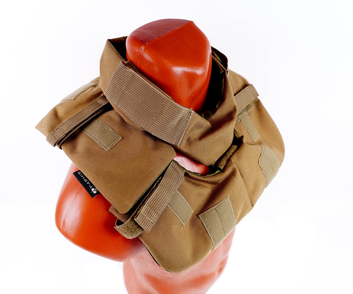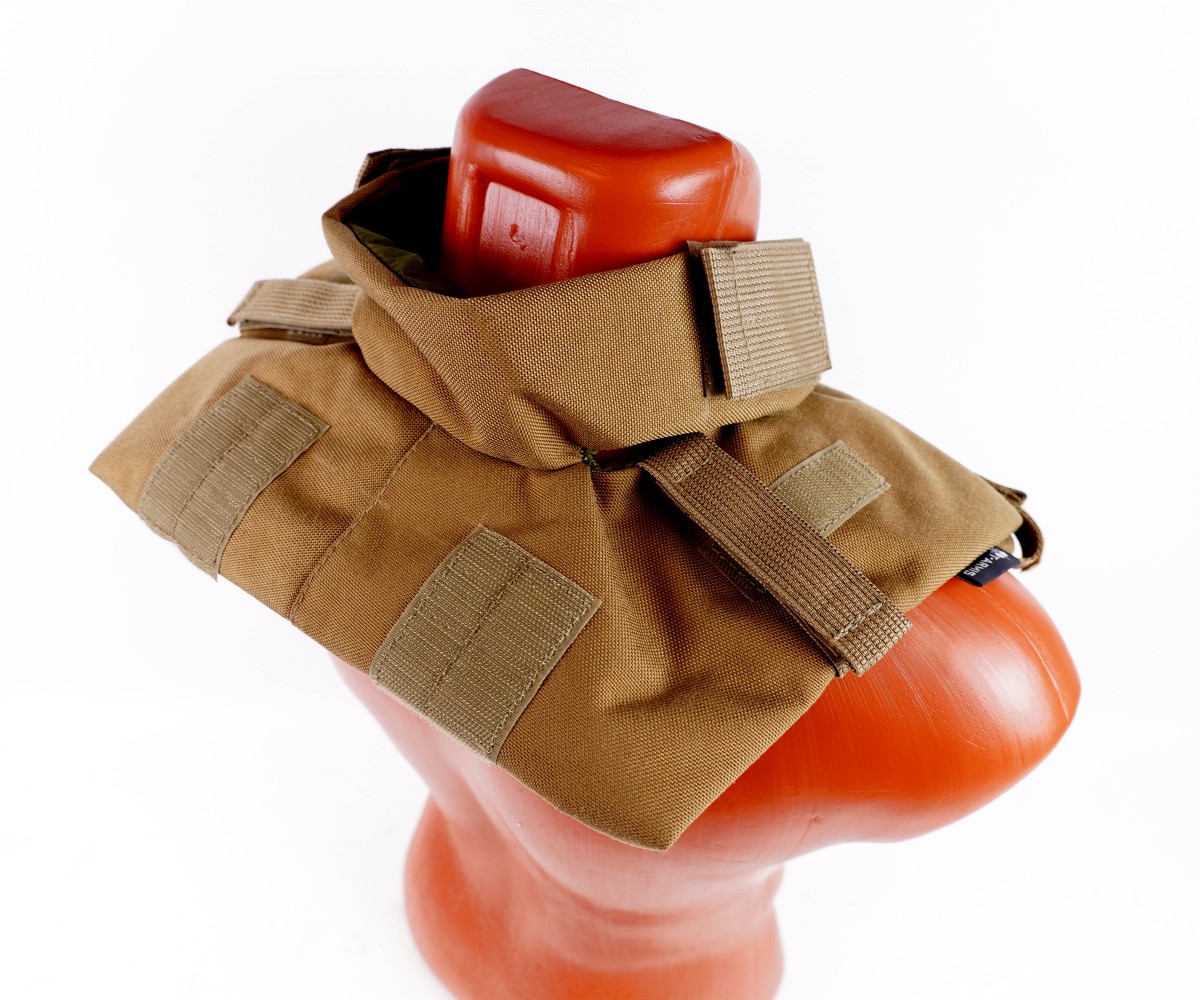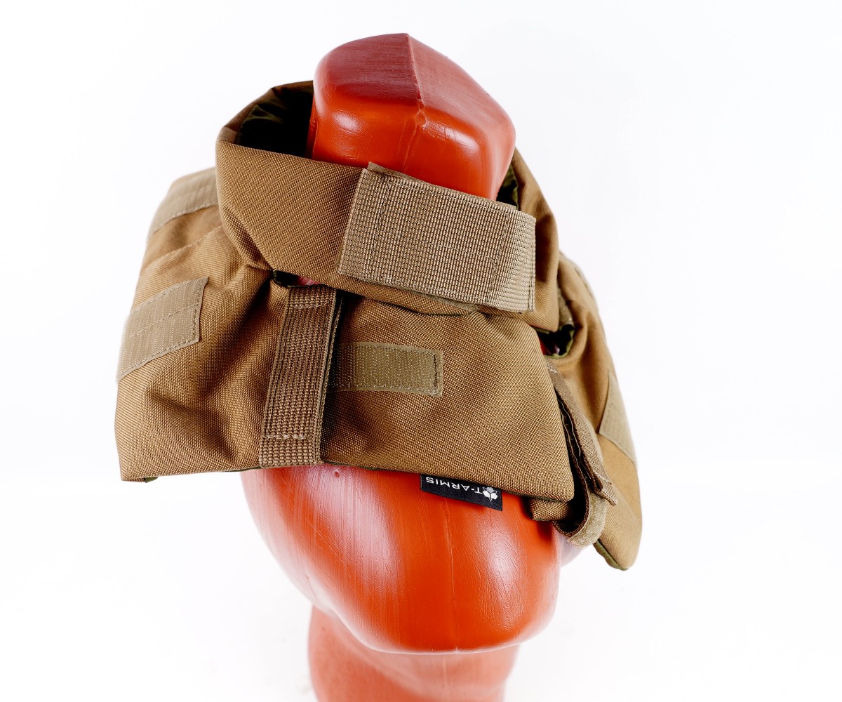 Шейно-плечевой защитный модуль предназначен для защиты шейной области от первичных (прямые осколки) и вторичных (разлетающиеся фрагменты пули при попадании в нательный бронеэлемент) поражающих элементов. Регулировка воротника обеспечивает как максимальное прилегание к шее, так в стороны от нее, что обеспечивает свободу движений головы. Основной внутренний объем накладки соединен с полостью воротника, что позволяет устанавливать шейный бронеэлемент под нахлест плечевого