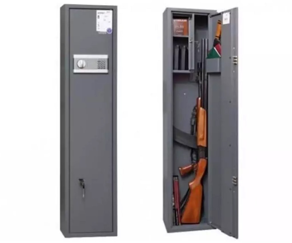 Прочный стальной оружейный шкаф с двумя замками (ключевой и электронный). На двери установлен отдельный карман для хранения документов, что очень удобно. Для хранения боеприпасов, в шкафу есть трейзер, который закрывается на отдельный замок. Также для хранения ружья установлены ложементы в количестве - 3 штук.