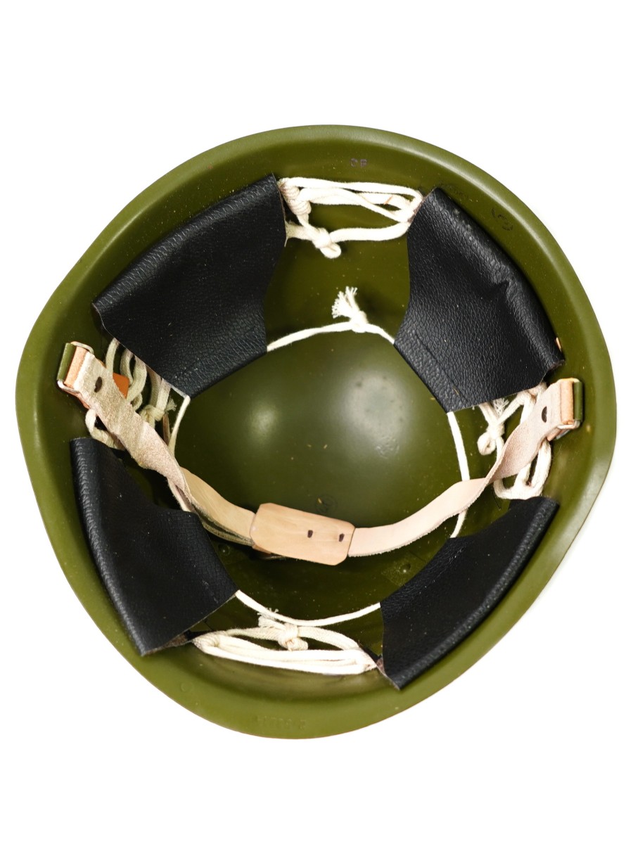 Оснащен качественным регулируемым подтулейным устройством, а также кожаным ремешком для фиксации на голове. Шлем окрашен в зеленую «защитную» расцветку.