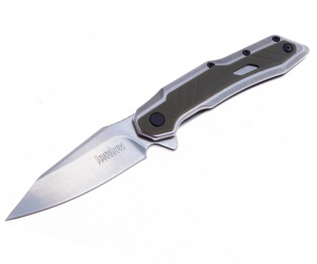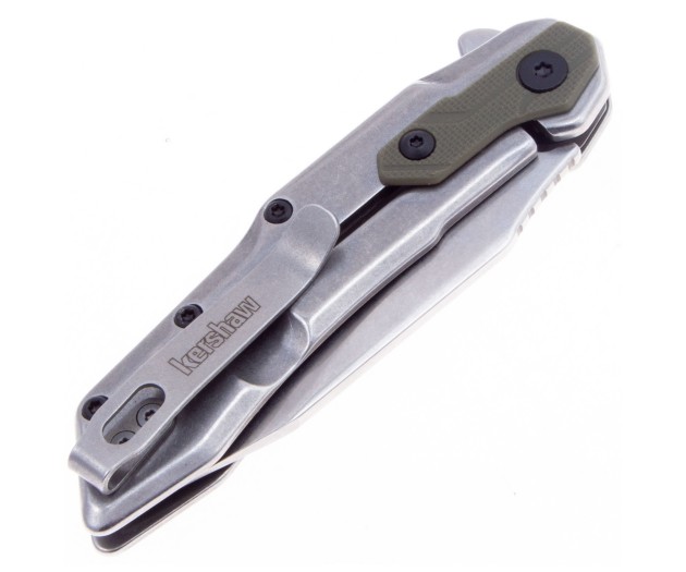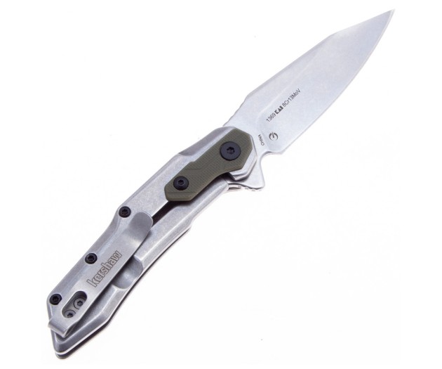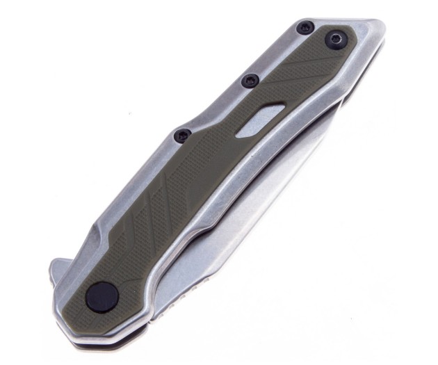 Salvage — многофункциональный EDC нож с клинком типа 'обратный танто', выполненным из ;стали 8Cr13MoV. Рукоять выполнена из стали и имеет оливковую накладку из нейлона. Замок типа Frame-lock придаёт ножу еще большую надежность.