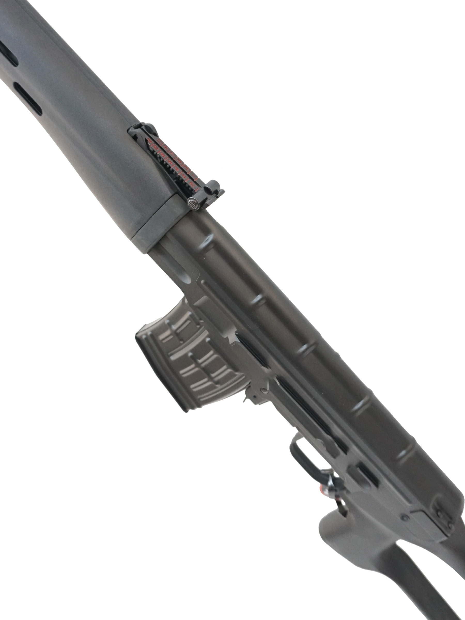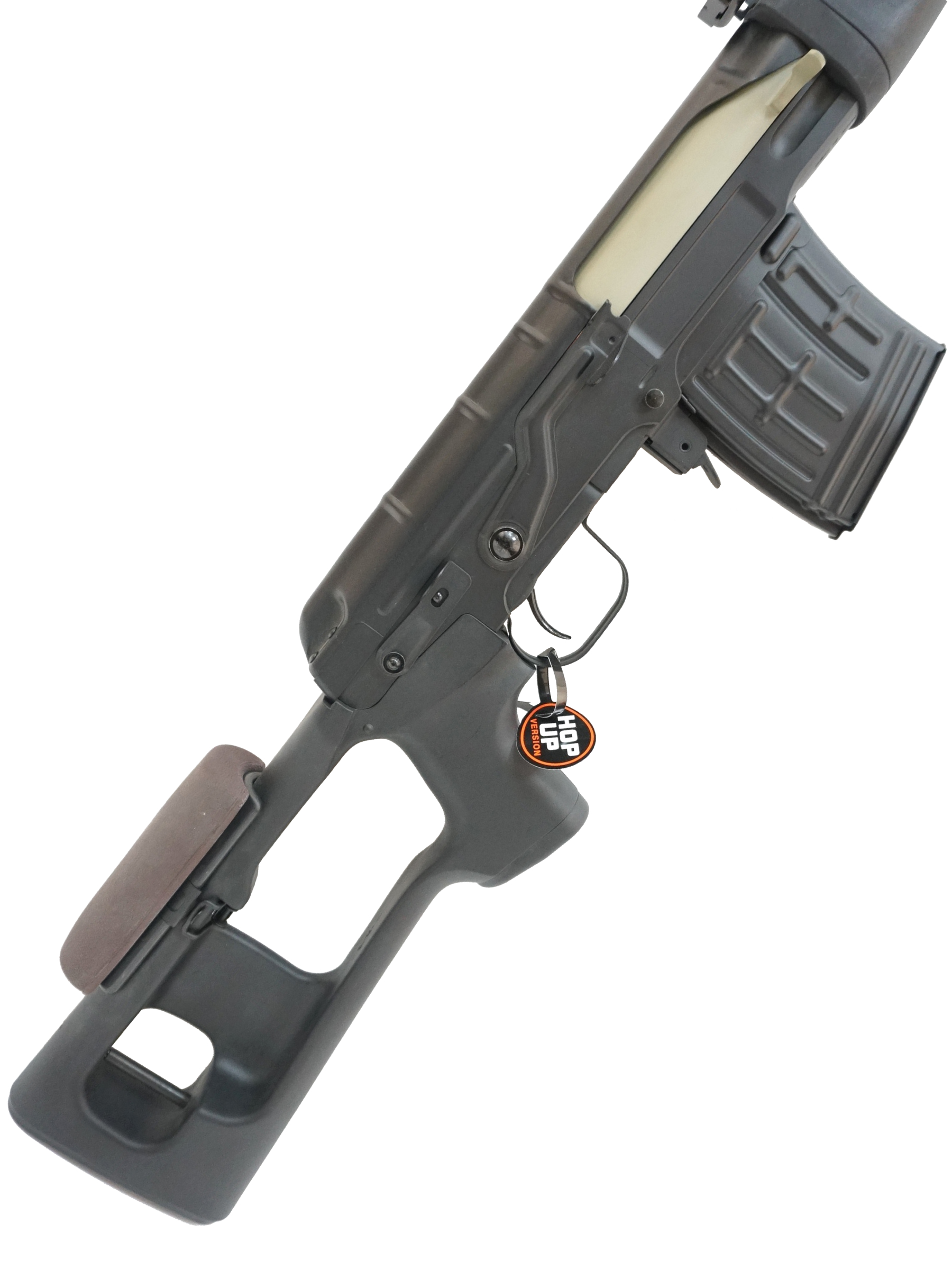 Страйкбольная винтовка Cyma SVD AEG для страйкбола представляет собой электропневматическое оружие, для производства выстрела используется кастомный гирбокс CVD type. Энергию винтовке сообщает никель-металл-гидридный аккумулятор емкостью 1100 мАч, который размещается в полости цевья. Боеприпасы – шарики 6 мм, в бункерный магазин помещается 200 шариков. Винтовка стреляет в полуавтоматическом режиме, скорость шариков – 125 м/с. Переключатель огня имеет два положения – предохранитель и полуавтомат. Винтовка имеет регулируемый хоп-ап, что позволяет улучшать показатели кучности, точности и дальности стрельбы.