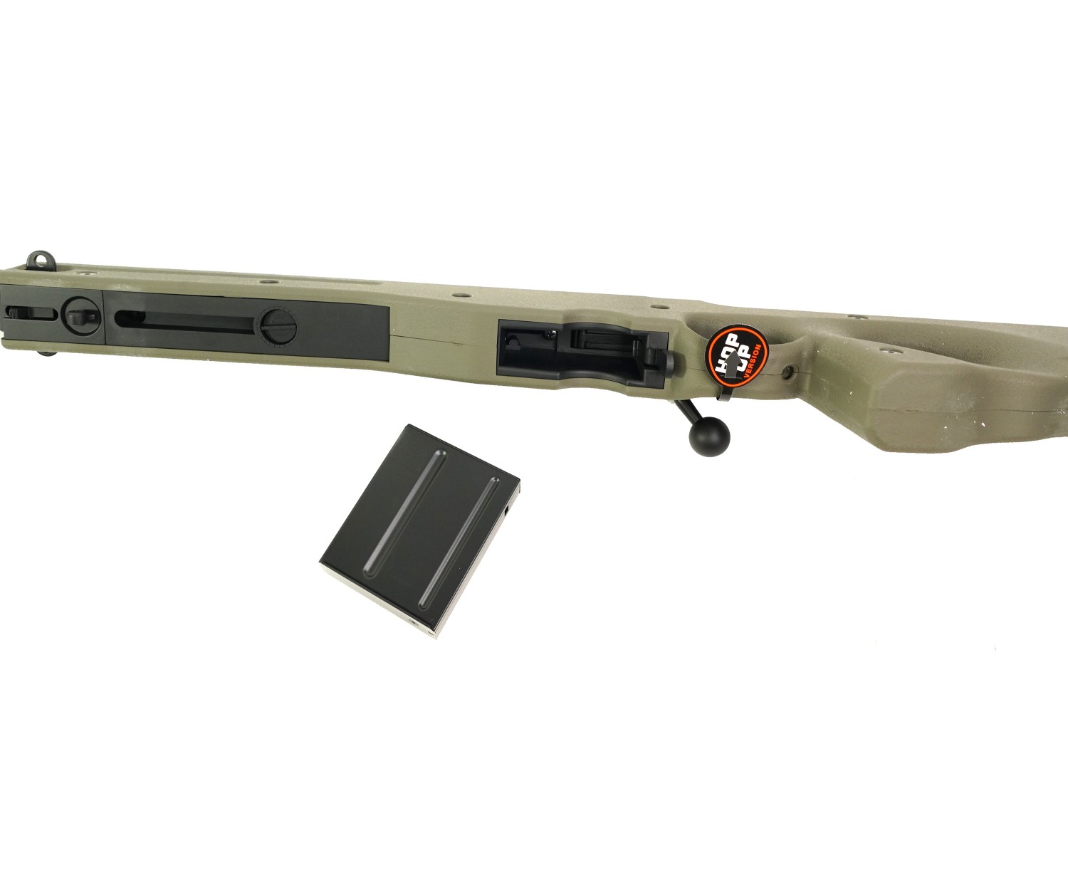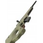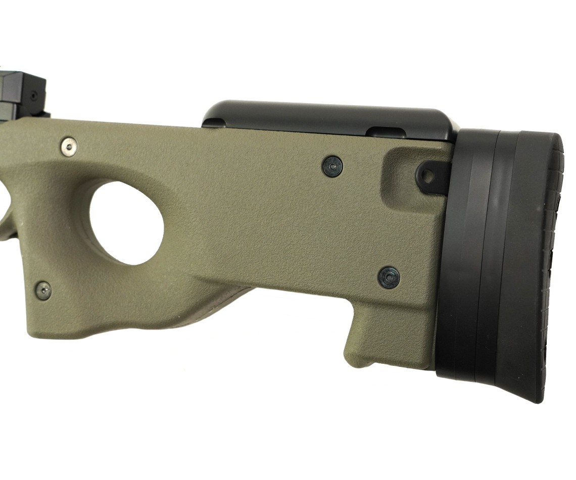 Модель выполнена в основном из алюминиевого сплава, приклад и ложе винтовки изготовлены из пластика ABS – прочного и стойкого материала. Особенностью винтовки является возможность регулировки приклада как по длине, так и в ширину, за счет специальных вставок и подщечника. Тыльник приклада прорезиненный, чтобы снизить силу отдачи выстрела. На ресивере расположена направляющая, позволяющая установить коллиматор или оптический прицел.