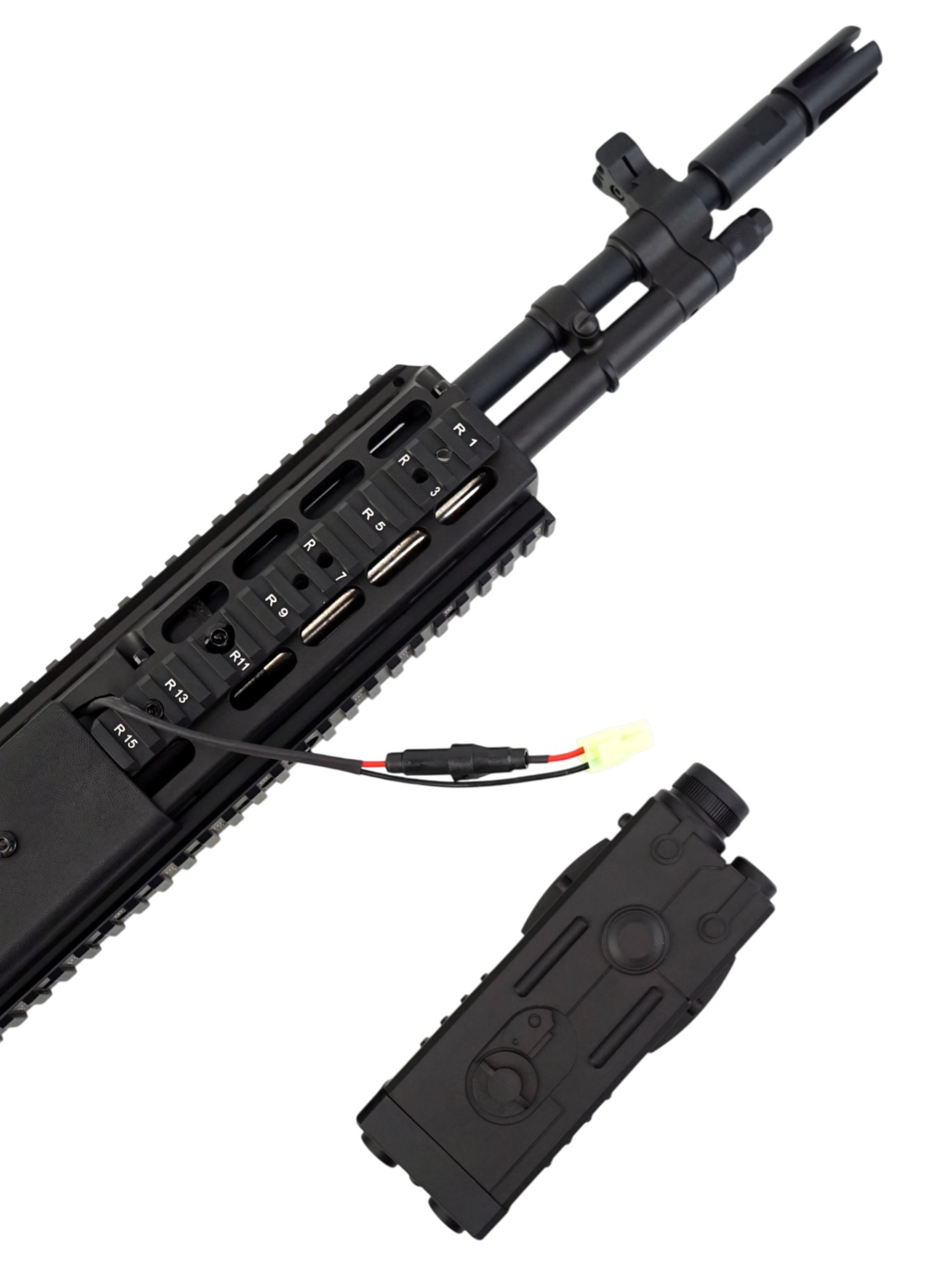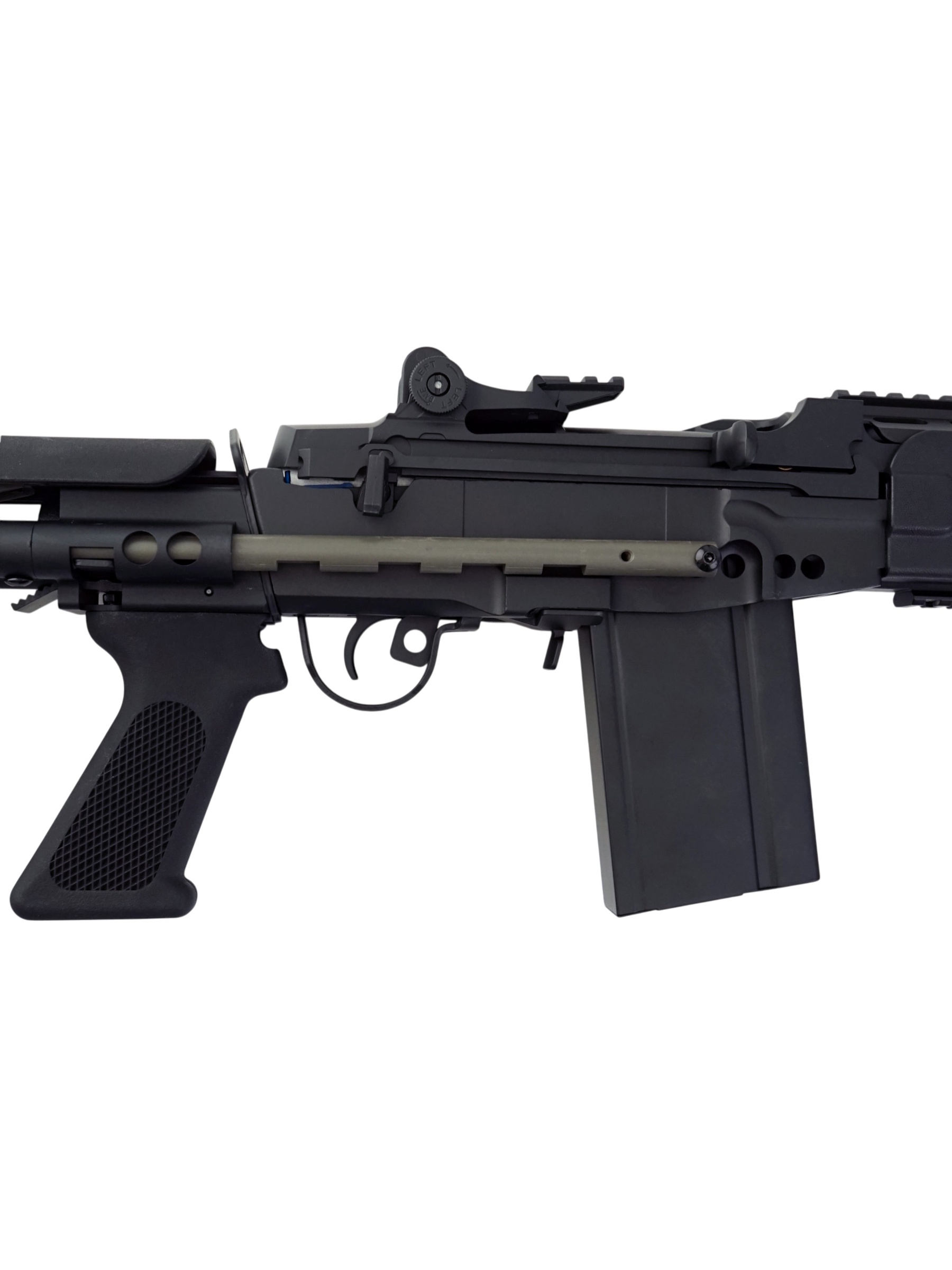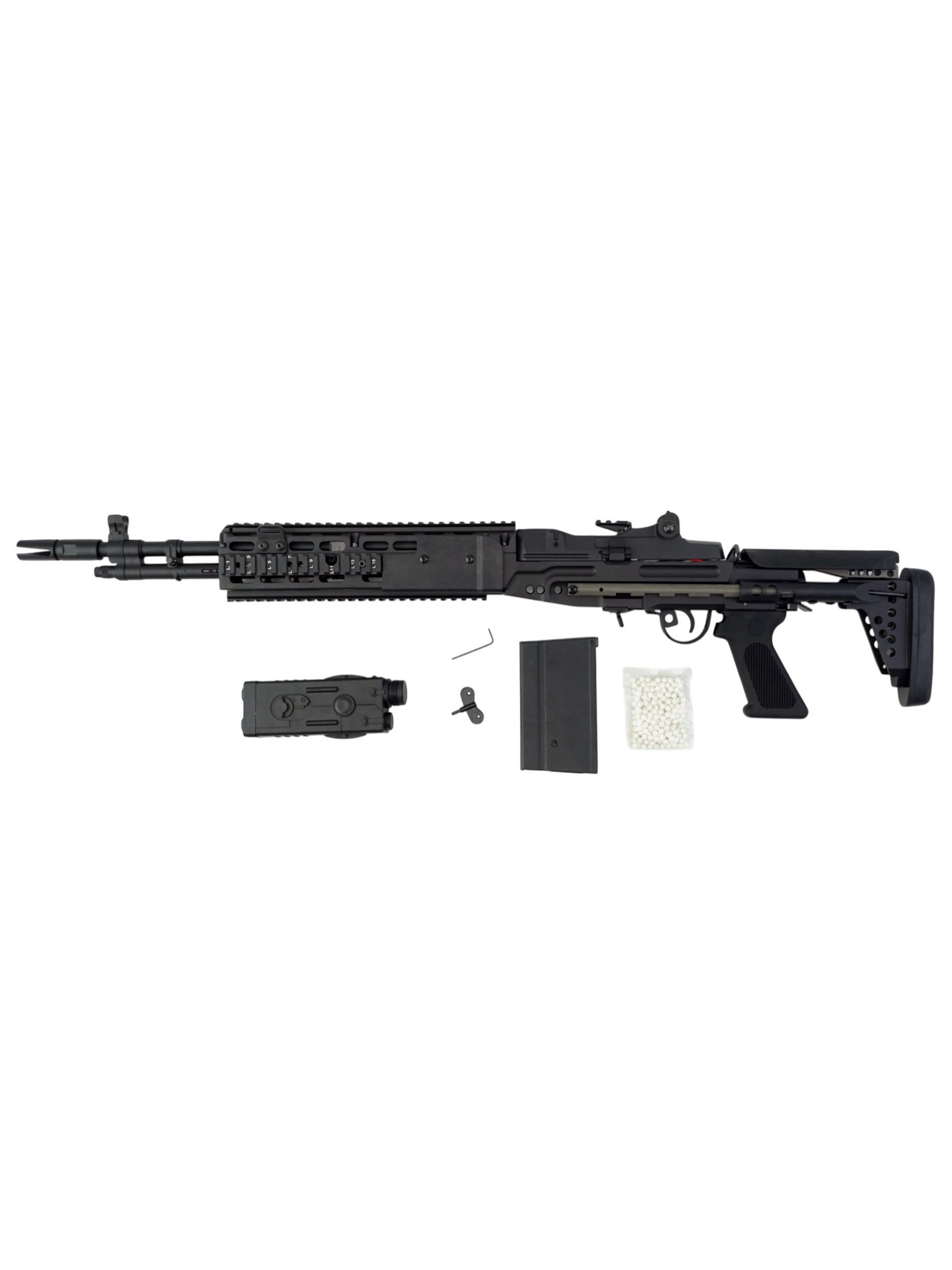 Снайперская винтовка Cyma M14 (CM.032G BK) – это электромеханическая пневматическая модификация, разработанная на базе штурмовой автоматической винтовки М14. Электрический мотор винтовки питается от аккумулятора NiMH-типа 8,4 V емкостью 1100mAh. В конструкции используется современный гирбокс 7-го поколения, внутри которого создается давление воздуха, необходимое для полета боеприпасов.