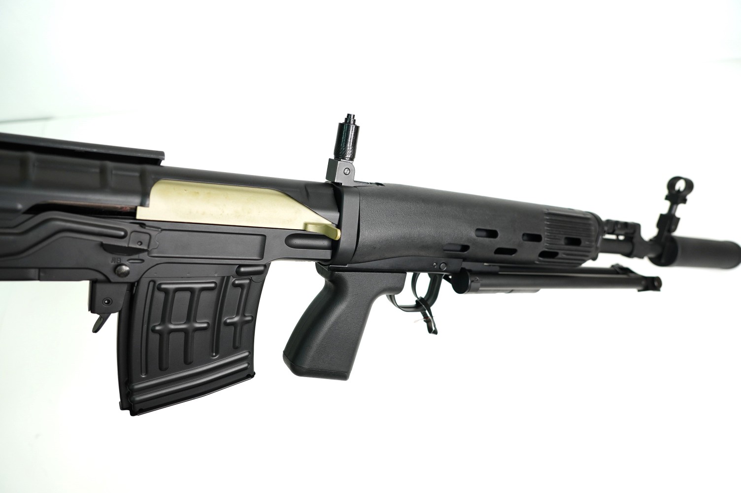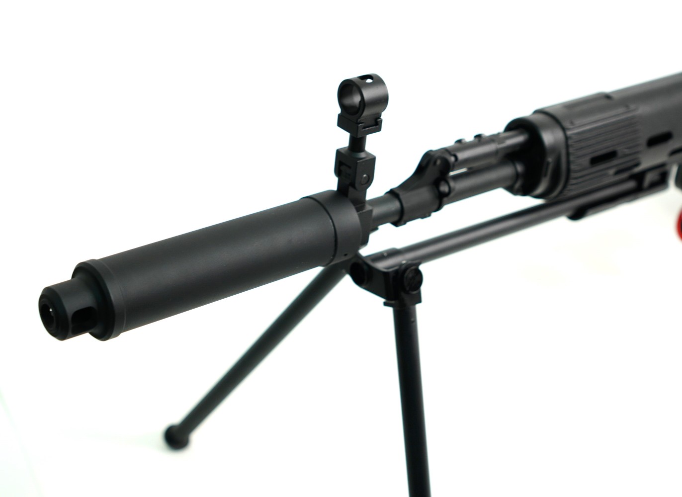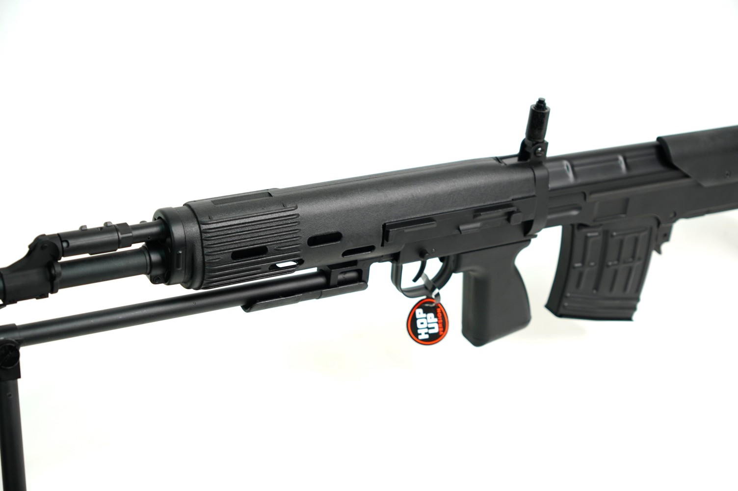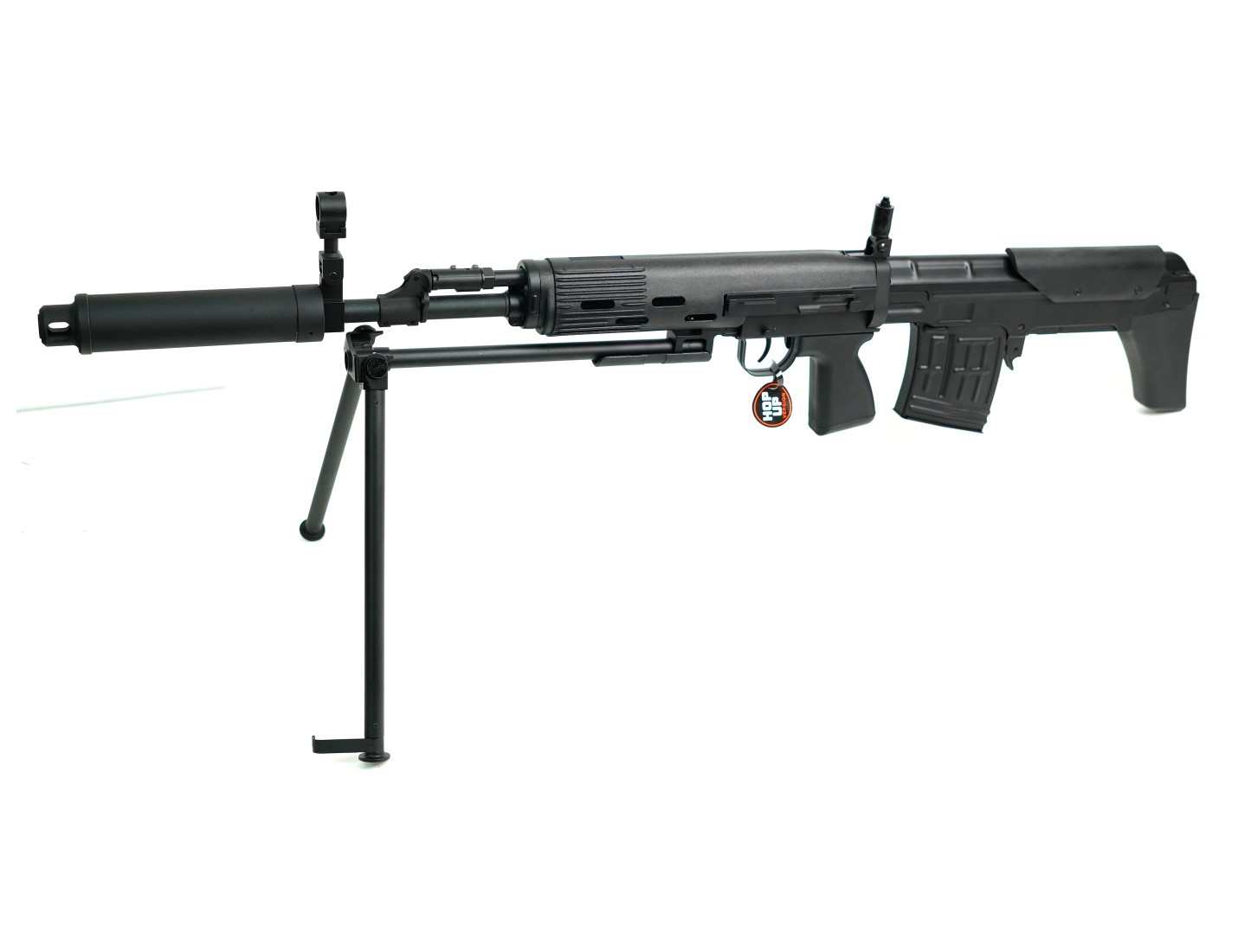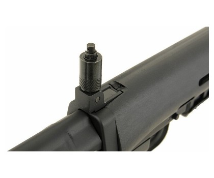 Для установки на винтовку прицела предусмотрена планка «ласточкин хвост». Прицельные приспособления винтовки Цима СВД АЕГ аналогичны боевому прототипу – это мушка и регулируемый целик. Основной материал – металл, некоторые элементы выполнены их пластика ABS. Общий вес изделия 3,845 кг, длина 0,9 м. Комплектность включает источник питания, шомпол, ЗУ, магазин и руководство пользователя.