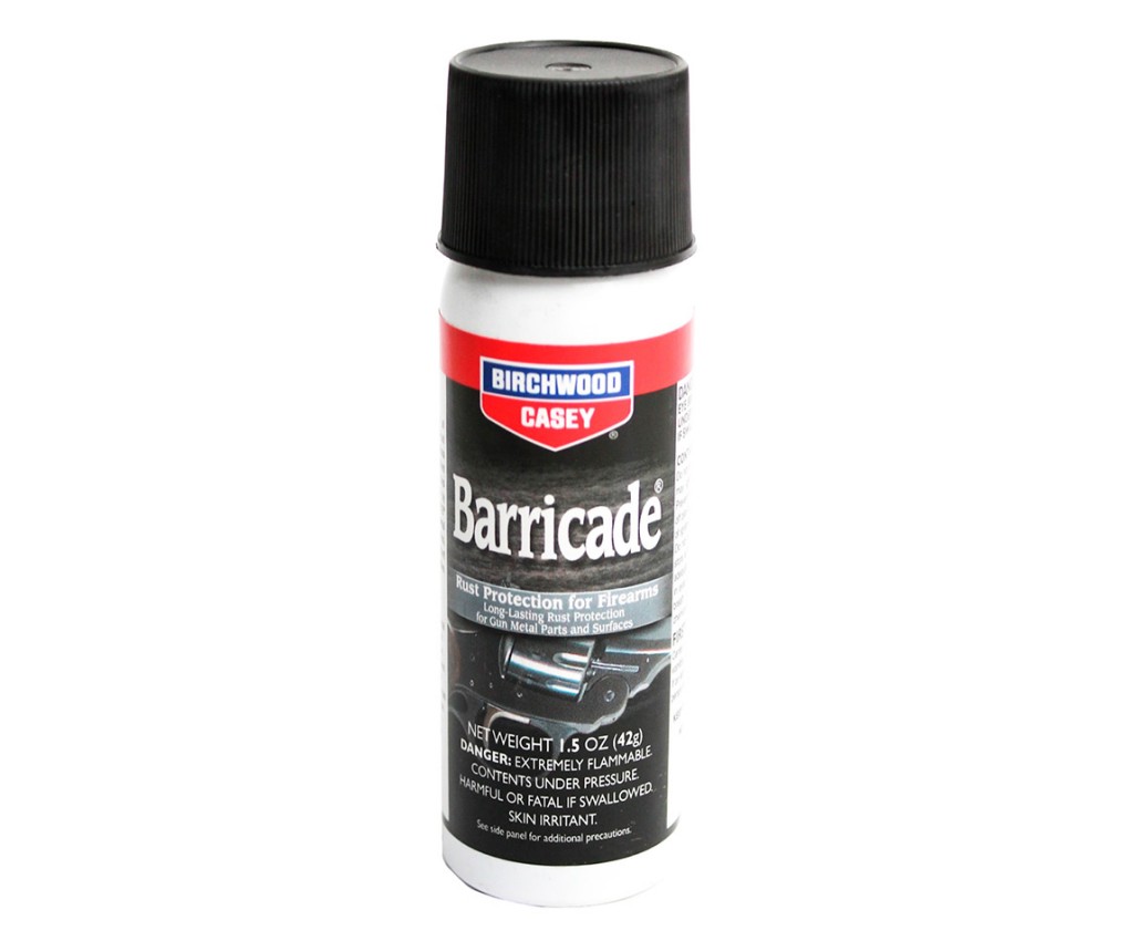 Средство Birchwood Casey Barricade Rust Protection защищает стальные части оружия от ржавчины и коррозии даже во влажном климате, вытесняет влагу из металлических пор, образует прозрачное защитное покрытие. Согласно проведённым испытаниям, выдерживает до 500 часов при повышенной влажности и до 96 часов при испытаниях в солевом тумане. Может использоваться в качестве растворителя ржавчины и средством для очистки отверстий и резьб.