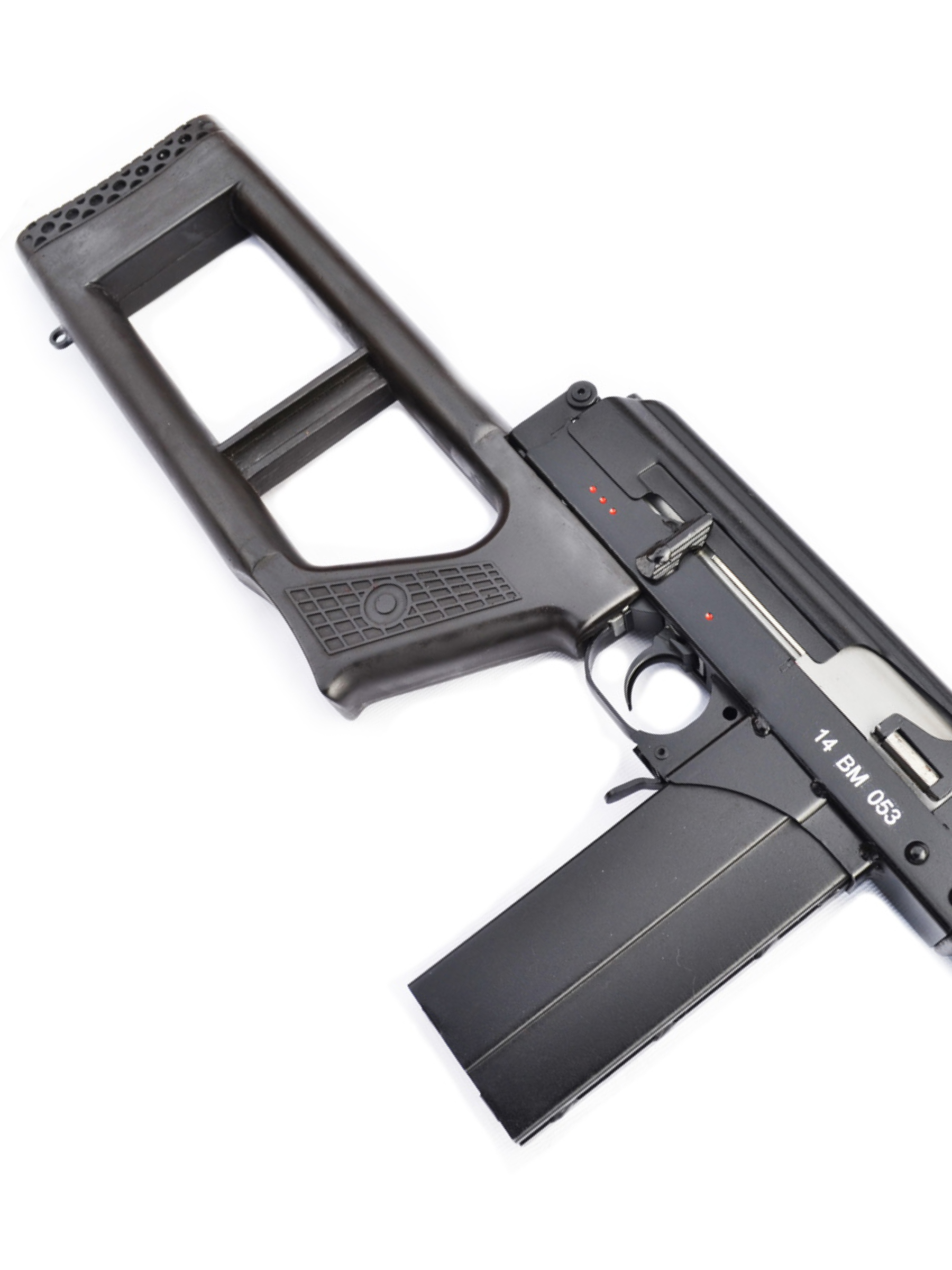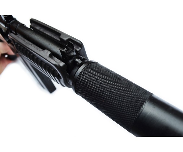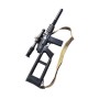 Модель отличается безупречной сборкой, люфтов нет. Корпус прочный, выполнен из легированной стали. Приклад винтовки – стальной, складной, магазин и цевье пластиковые. Корпус с левой стороны оснащен креплением «ласточкин хвост», аналогично боевому прототипу, и позволит установить оптику или коллиматор.