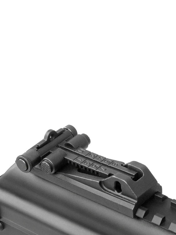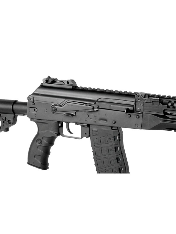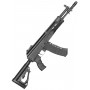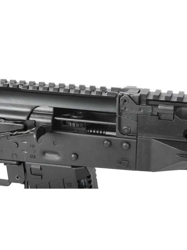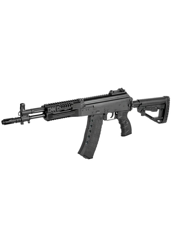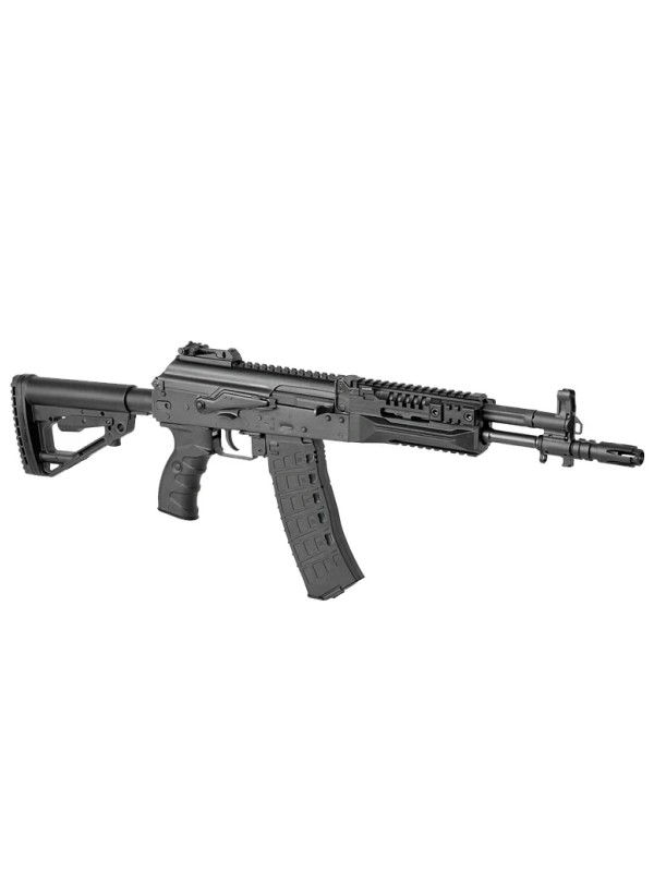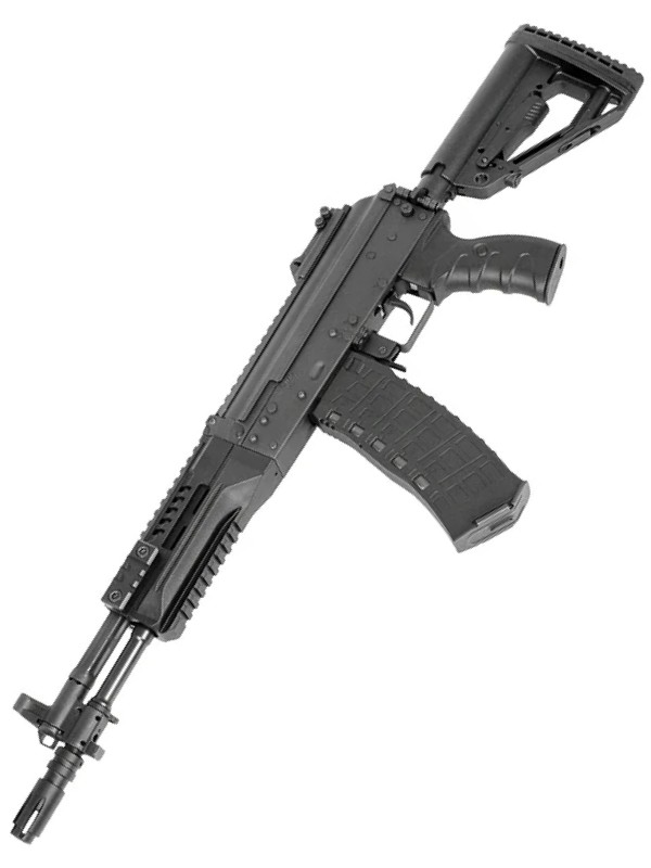 Эта модель – укороченная версия АК-12. Стальные детали: ствольная коробка, крышка ствольной коробки, имитация затвора, механизм фиксации приклада, переводчик огня, предохранительная скоба, клавиша отмыкания магазина, стойка мушки, газовая трубка и мушка. Ствол, ДТК и труба приклада изготовлены из алюминия для снижения веса.