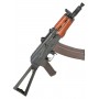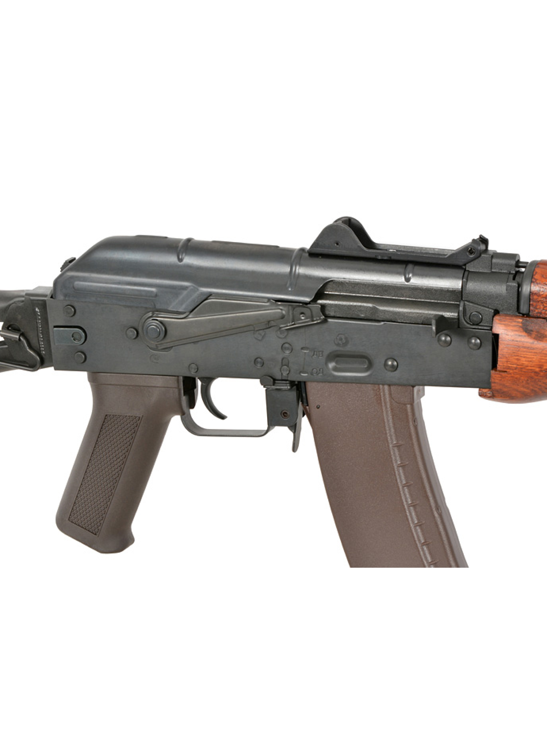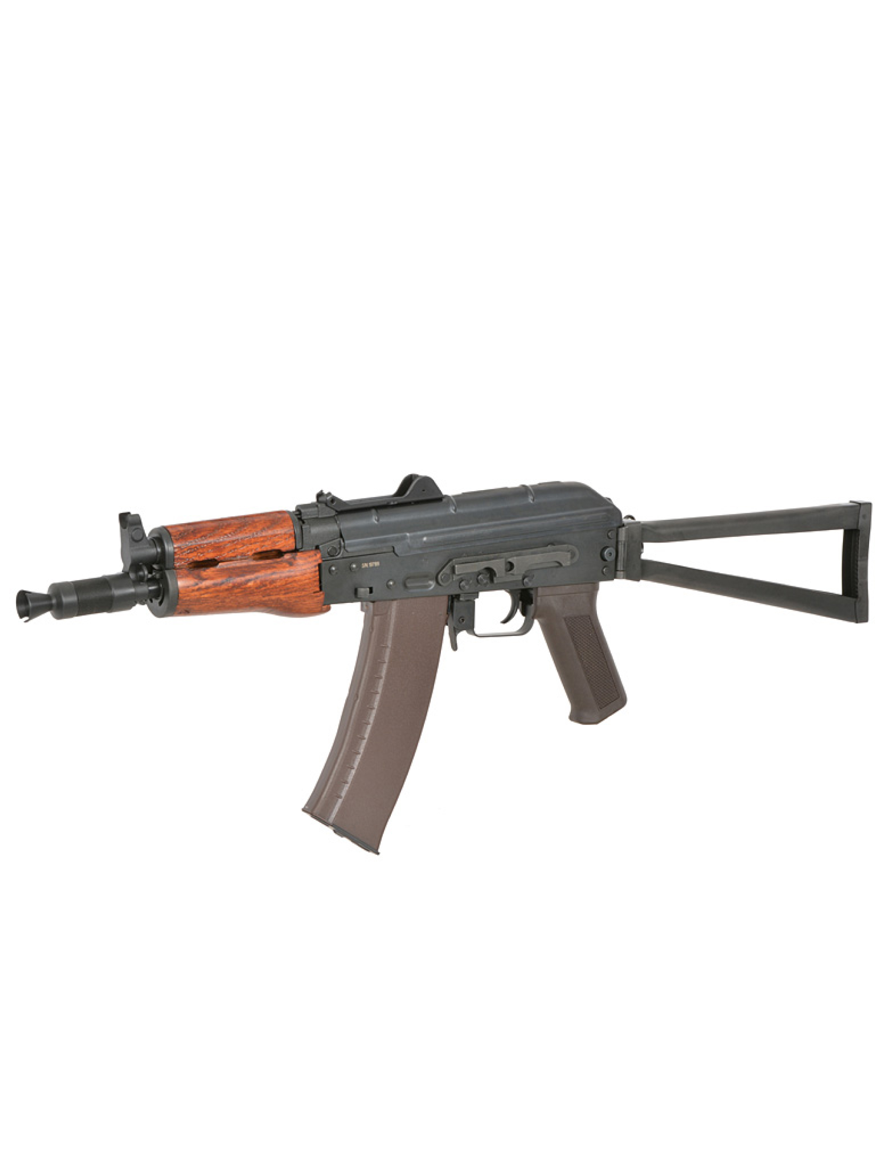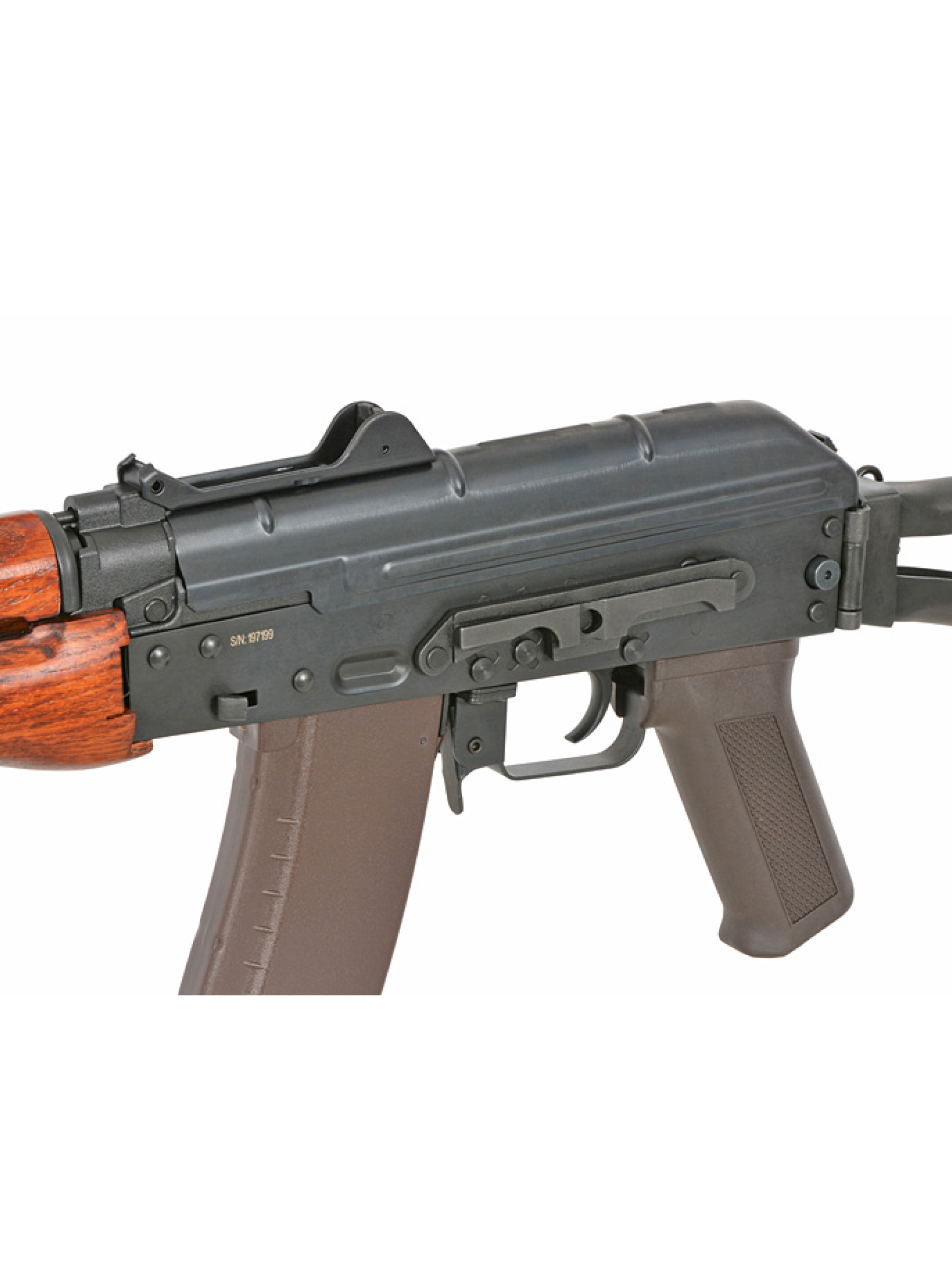 Страйкбольный автомат Cyma AK-74U Platinum со складным прикладом и деревянным цевьём — это стильное и функциональное оружие, созданное для тех, кто ценит аутентичность и современные технические решения. Вдохновлённый легендарным автоматом Калашникова АК-47 и АКС-47, этот моделит великолепно передает классический дизайн, но при этом обладает рядом современных преимуществ, делающих его отличным выбором для игр и тренировок. Общая длина автоматической модели составляет 730 мм, а длина ствола — 310 мм, что делает его компактным и удобным для транспортировки, а вес — около 2900 г — ощущается как у боевого оружия.