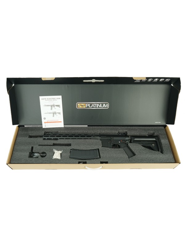 Cyma M4 M-LOK 14.5 custom (CM.097) – это AEG автомат калибра 6,0 мм (.236), работающий от аккумулятора NiMH 8,4 V 1100mAh (mini type) с разъемом mini-Tamiya. Дульная энергия автомата достигает до 3 Дж, а скорость выстрела составляет 115 м/с. Для стрельбы используются шарики 6 мм.