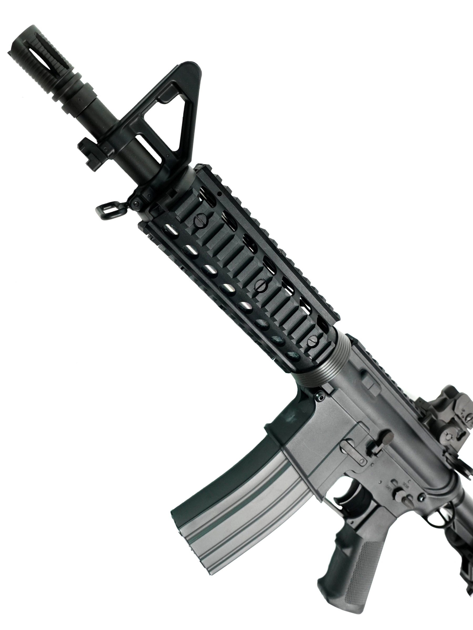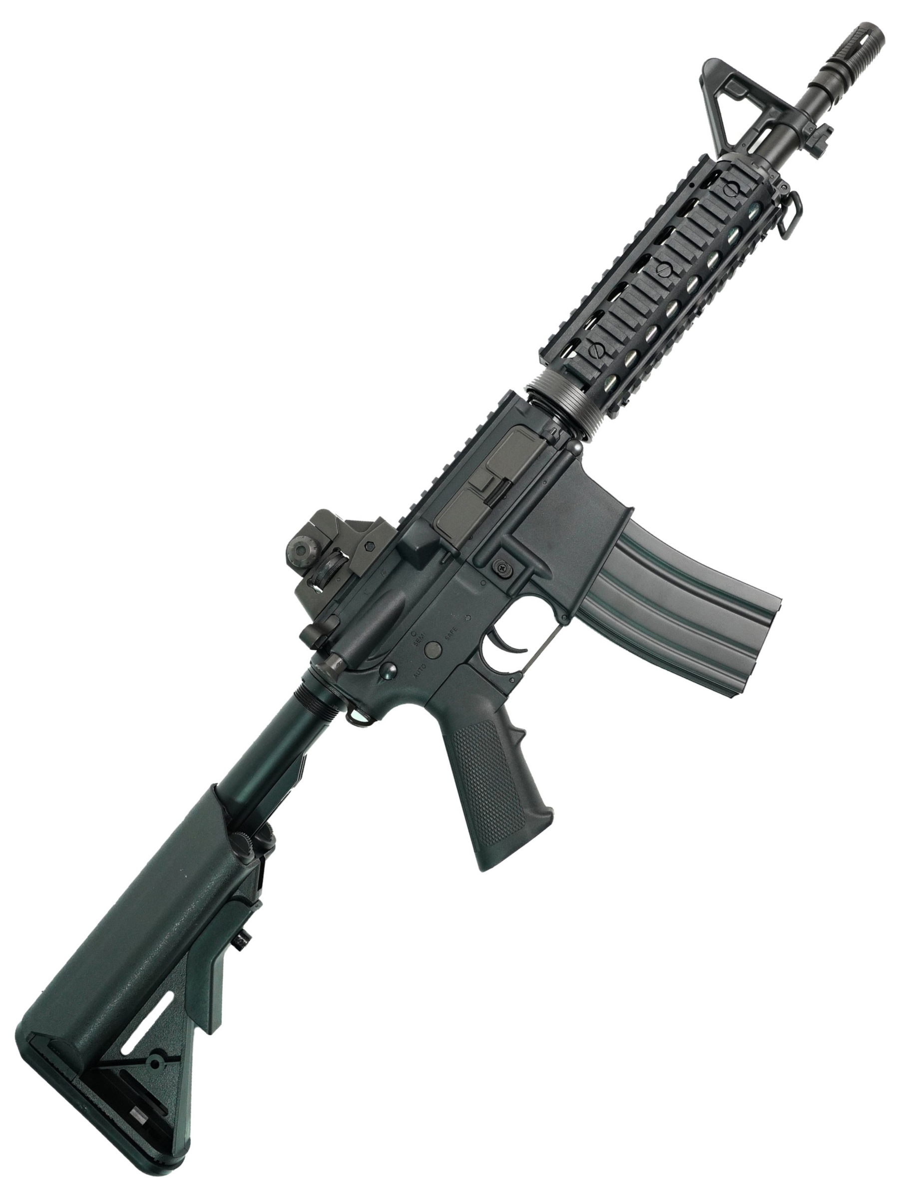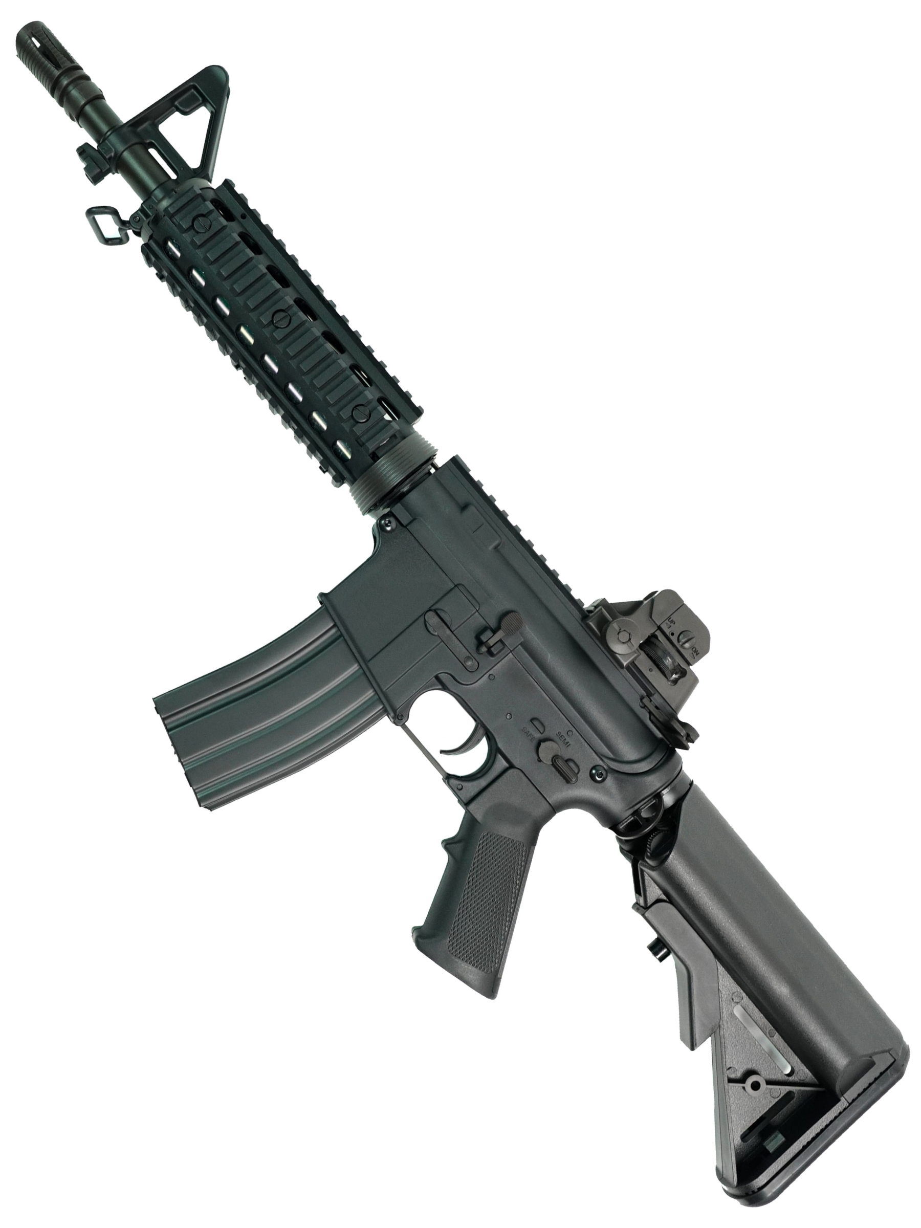 Бюджетная страйкбольная модель автомата CM606 M4 CQB RIS от известного китайского производителя CYMA - электропневматический привод (AEG) с гирбоксом версии 2, сконструированный на базе одной из модификаций американской штурмовой винтовки М4А1. Источником энергии для привода служит аккумулятор, размещаемый в отсеке внутри приклада (для доступа необходимо снять затыльник) и подключаемый через разъем типа mini-Tamiya. Режимы стрельбы - одиночный и автоматический; также переключатель режимов огня имеет положение, соответствующее предохранителю. Есть возможность регулировки хоп-апа, доступ к регулятору открывается после взведения затвора.