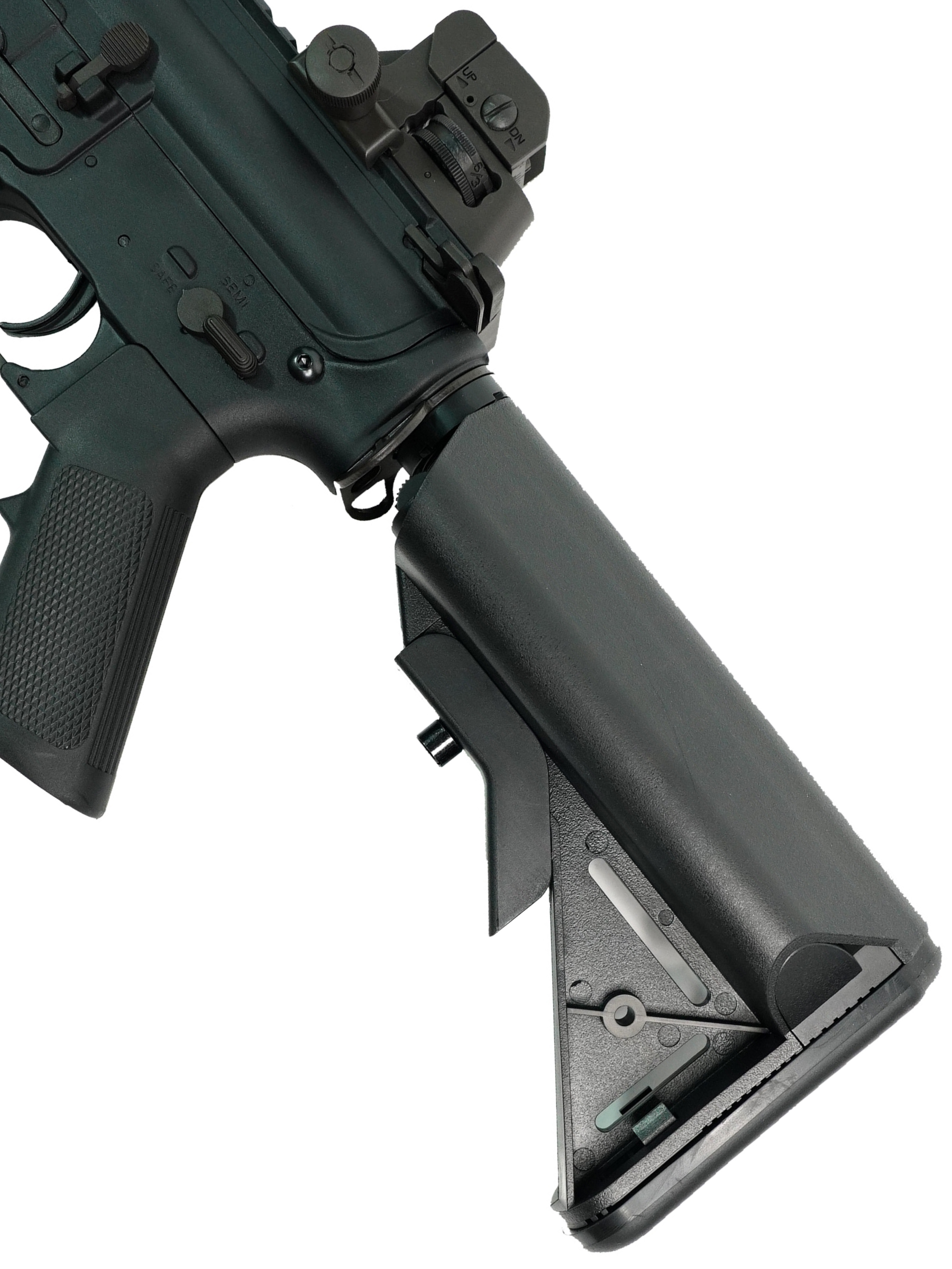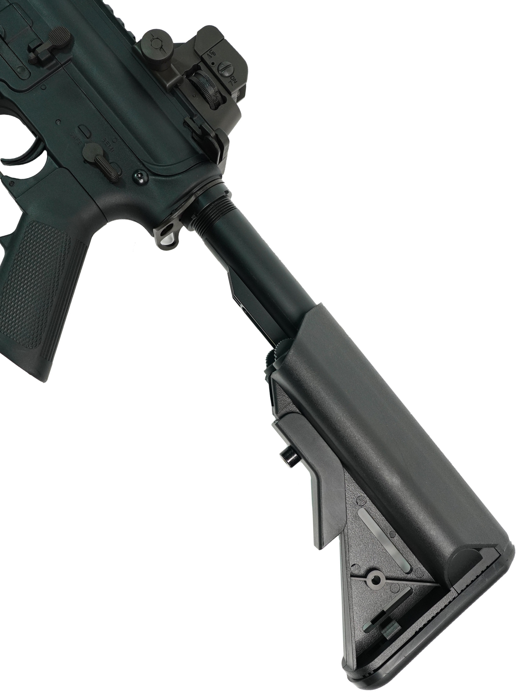 Привод Cyma M4 CQB RIS оснащен телескопическим прикладом с настраиваемой длиной (шесть фиксированных позиций). Штатные прицельные приспособления - складной съемный диоптр (регулируемый) и мушка; для крепления иных прицельных приспособлений и дополнительных аксессуаров предусмотрены планки Пикатинни на верхнем ресивере и на цевье. Для установкидульных насадок (пламегасителей, глушителей, трассеров и т.п.) и удлиннителей ствола имеется резьба M14- (CCW). Штатно на ней установлен имитатор пламегасителя.