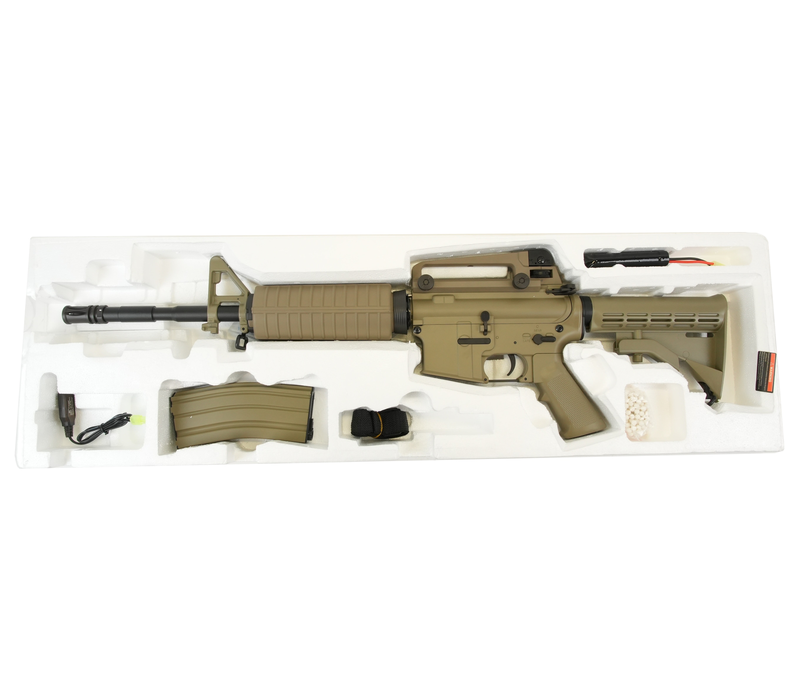 Страйкбольный карабин M4A1 от китайской компании Cyma представляет собой точную копию оригинального карабина M4. Корпус привода изготовлен из прочного ABS-пластика. Внутри карабина находится гирбокс второй версии, выполненный из алюминиевого сплава. Все компоненты гирбокса стандартные и могут быть заменены на запчасти от других производителей, что обеспечивает высокую ремонтопригодность и возможности для тюнинга. Штатные прицельные приспособления выполнены в виде мушки и диоптра