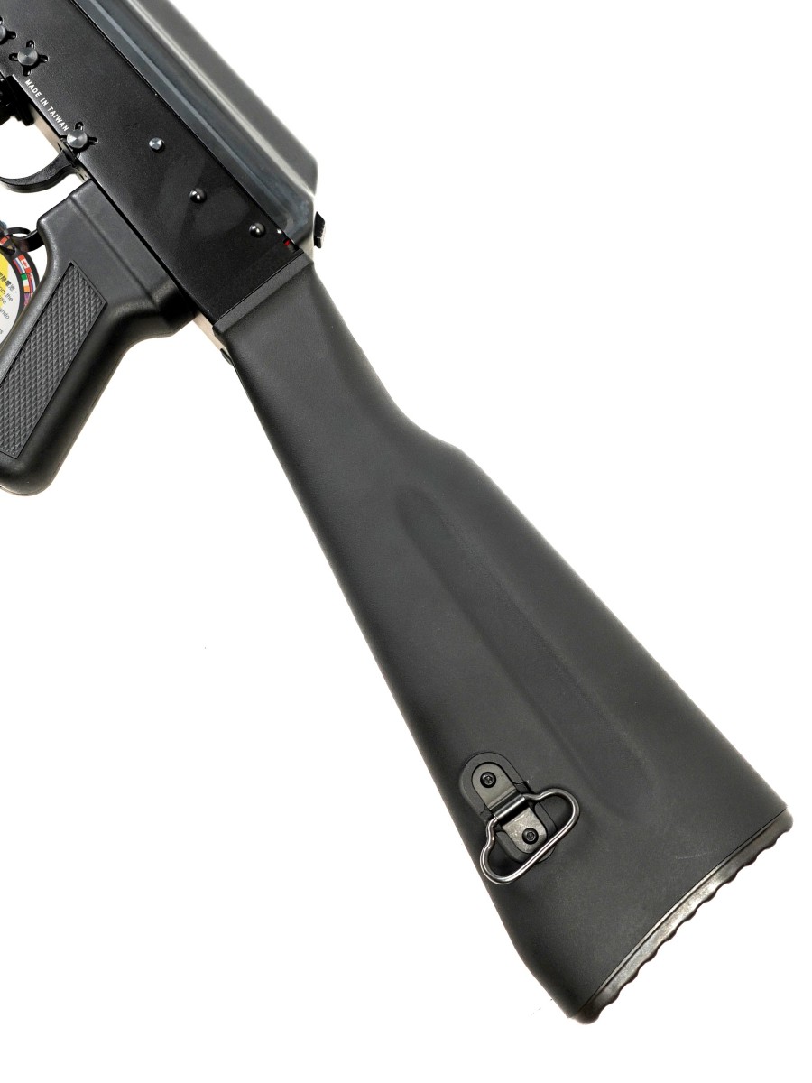 На дульной части ствола установлен имитатор пламегасителя. Прицельные приспособления - регулируемый по вертикали и горизонтали целик и мушка. Ствольная коробка, ствол и пламегаситель выполнены из алюминиевого сплава, приклад и пистолетная рукоять пластиковая. В комплекте с приводом поставляется бункерный магазин вместимостью 600 шаров. Проводка для подключения аккумуляторов выведена в приклад; для подключения используется разъем Mini Tamiya.