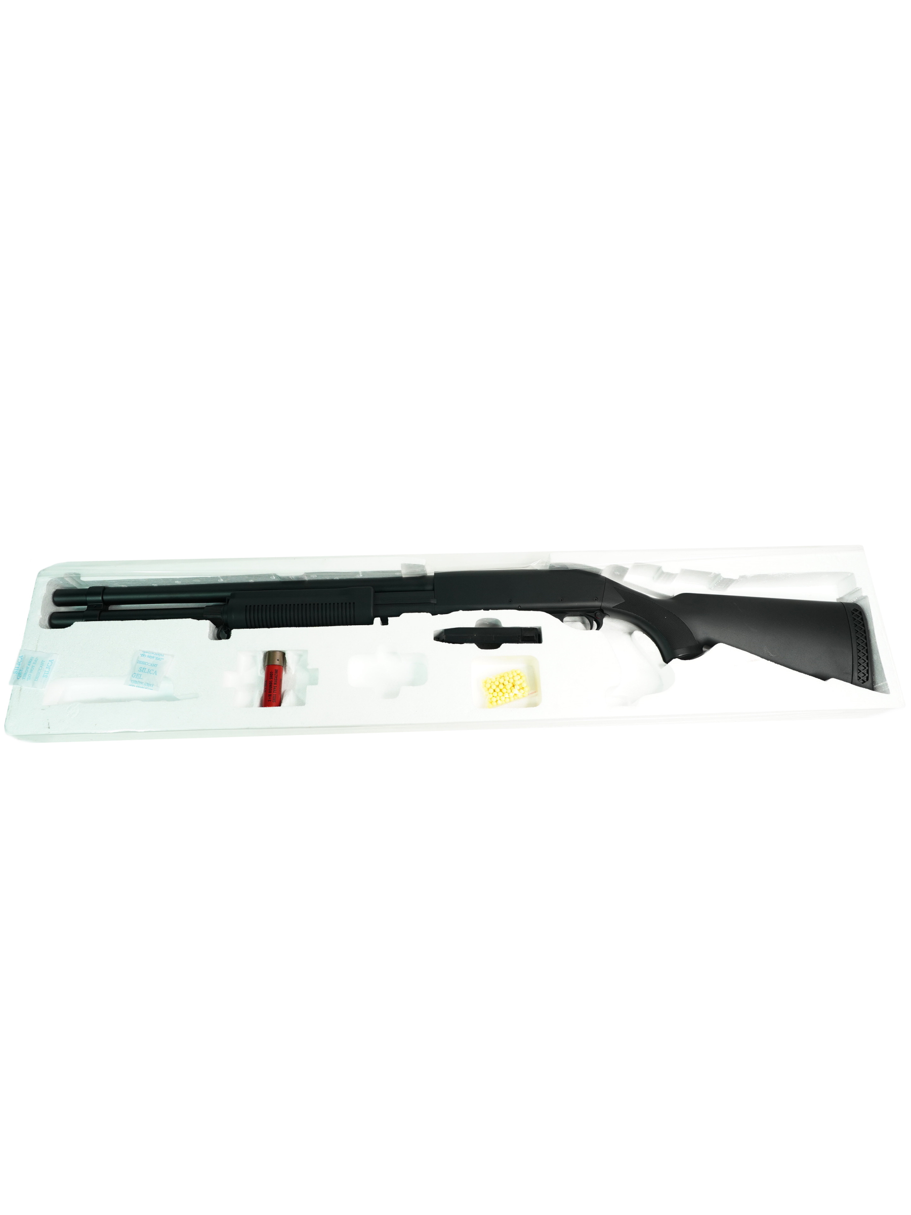 В комплект поставки входит сам дробовик, привода, один шелл, лоадер, шарики, шомпол и подробная инструкция, что позволяет быстро подготовить его к бою и начать играть.