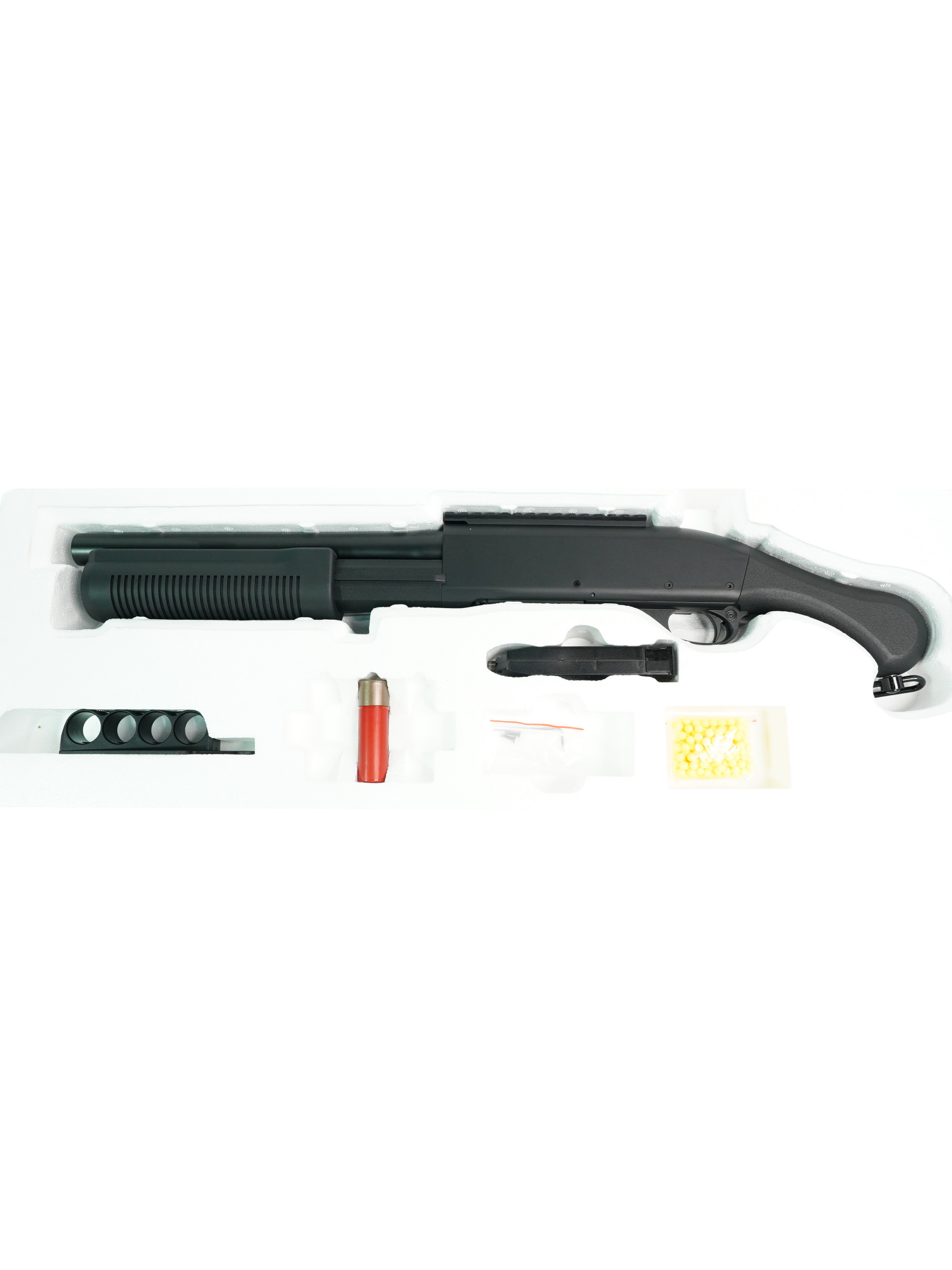 Внутри расположен шелл-тип магазина емкостью 30 шариков диаметром 6 мм, что позволяет производить эффектные серии выстрелов без постоянной перезарядки. Стрельба идет по 3 шара за один выстрел, что добавляет динамики и реализма в игровой процесс. Для повышения универсальности и настройки прицельные планки Weaver/Picatinny позволяют установить дополнительные оптические приспособления.
