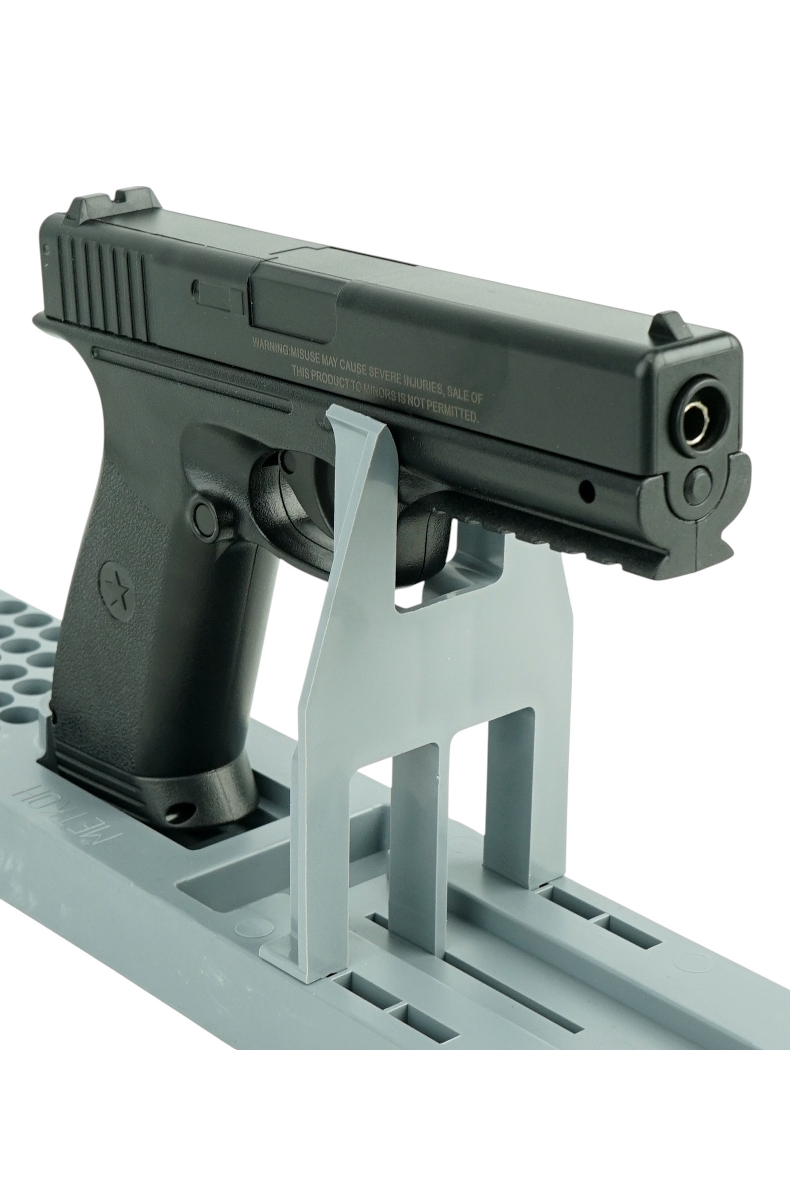 Затвор пистолета неподвижный, блоубэк отсутствует. Прицельные приспособления – целик и мушка без возможности регулировки. Имеется подствольная планка Пикатинни для крепления ЛЦУ, фонарика и т.п. аксессуаров. Затвор и рамка пистолета выполнены из пластика. В целях обеспечения безопасности пистолет оснащен кнопочным предохранителем (размещен на спусковом крючке).
