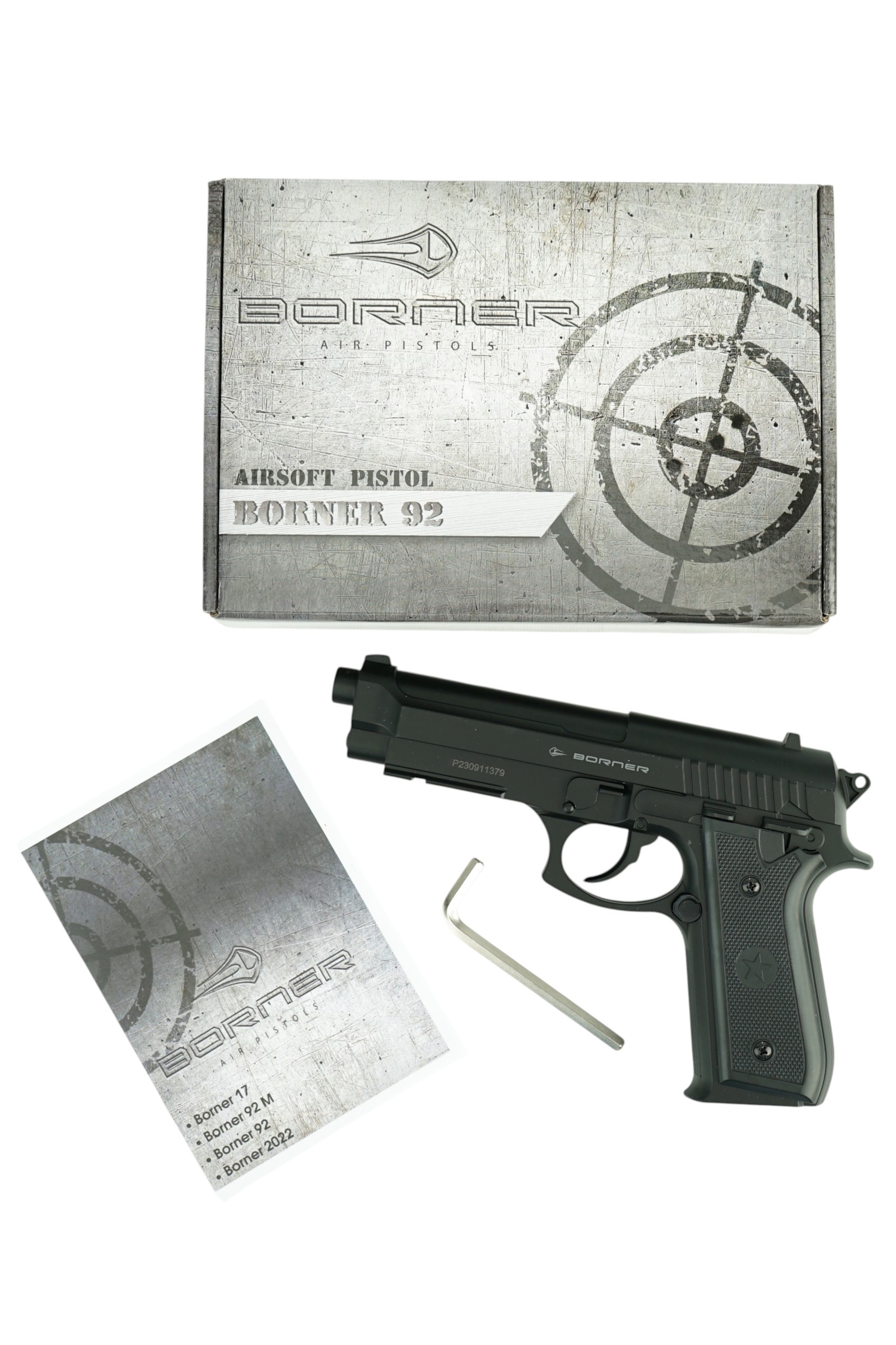 Borner 92 (Beretta) – это CO₂-пистолет калибра 6,0 мм (.236), работающий от 12-граммовых баллончиков с газом CO2 и обеспечивающий дульную энергию до 1,7 Дж. Пистолет оснащен магазином емкостью 20 шариков. Для стрельбы используются пластиковые шары 6 мм. Скорость выстрела достигает 110 м/с.