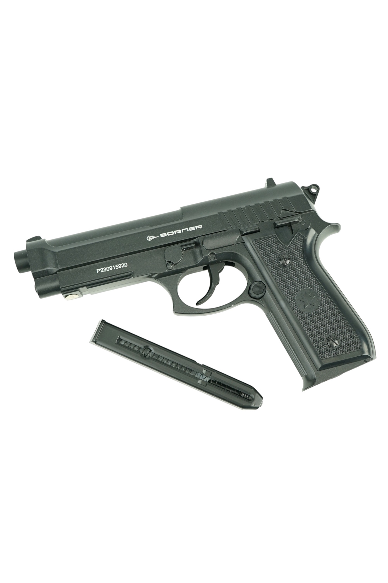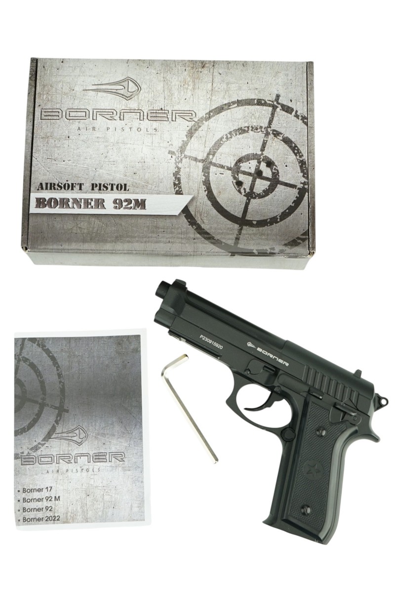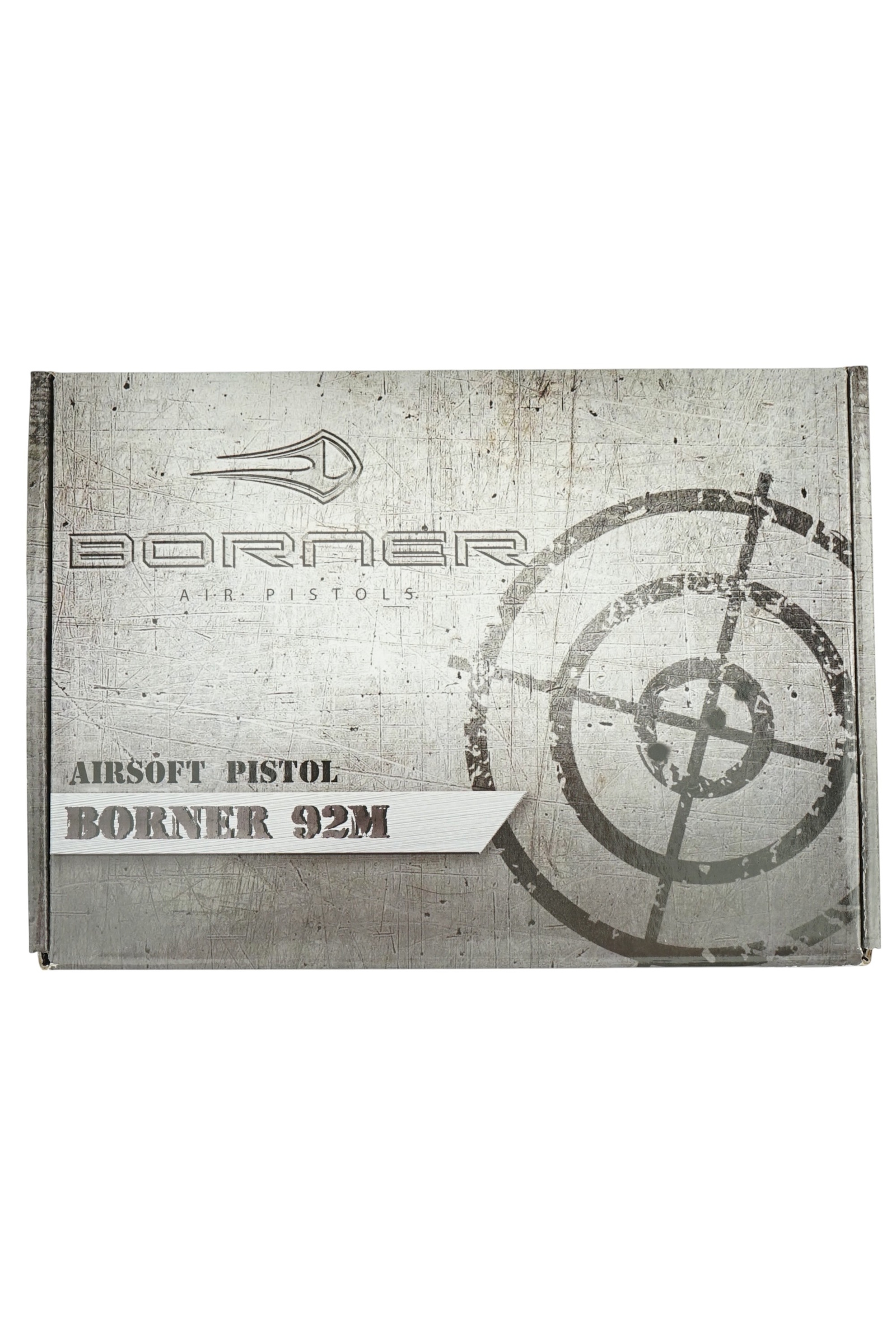 Страйкбольный пистолет Borner 92М копирует одну из модификаций, созданных на базе модели Beretta 92. В исполнении М затвор и рамка пистолета выполнены из металла. В качестве источника энергии используются 12-граммовые баллончики с углекислым газом. Ударно-спусковой механизм – только двойного действия.