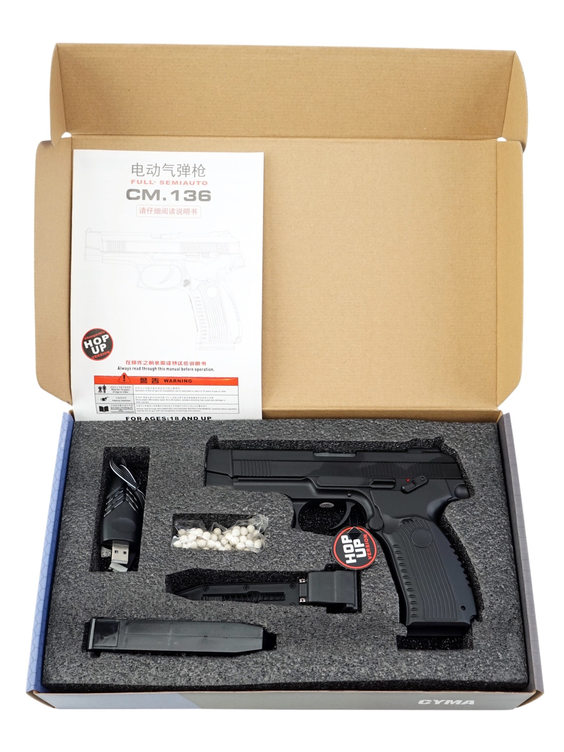 Cyma Grach EBB (CM.136) использует источник энергии – аккумулятор, который можно зарядить через удобный USB-порт, обеспечивая простоту и удобство использования. Пистолет выдает дульную энергию 1,7 Дж, обеспечивая при этом скорость выстрела 60 — 70 м/с. Для стрельбы используются стандартные шарики калибра 6 мм.