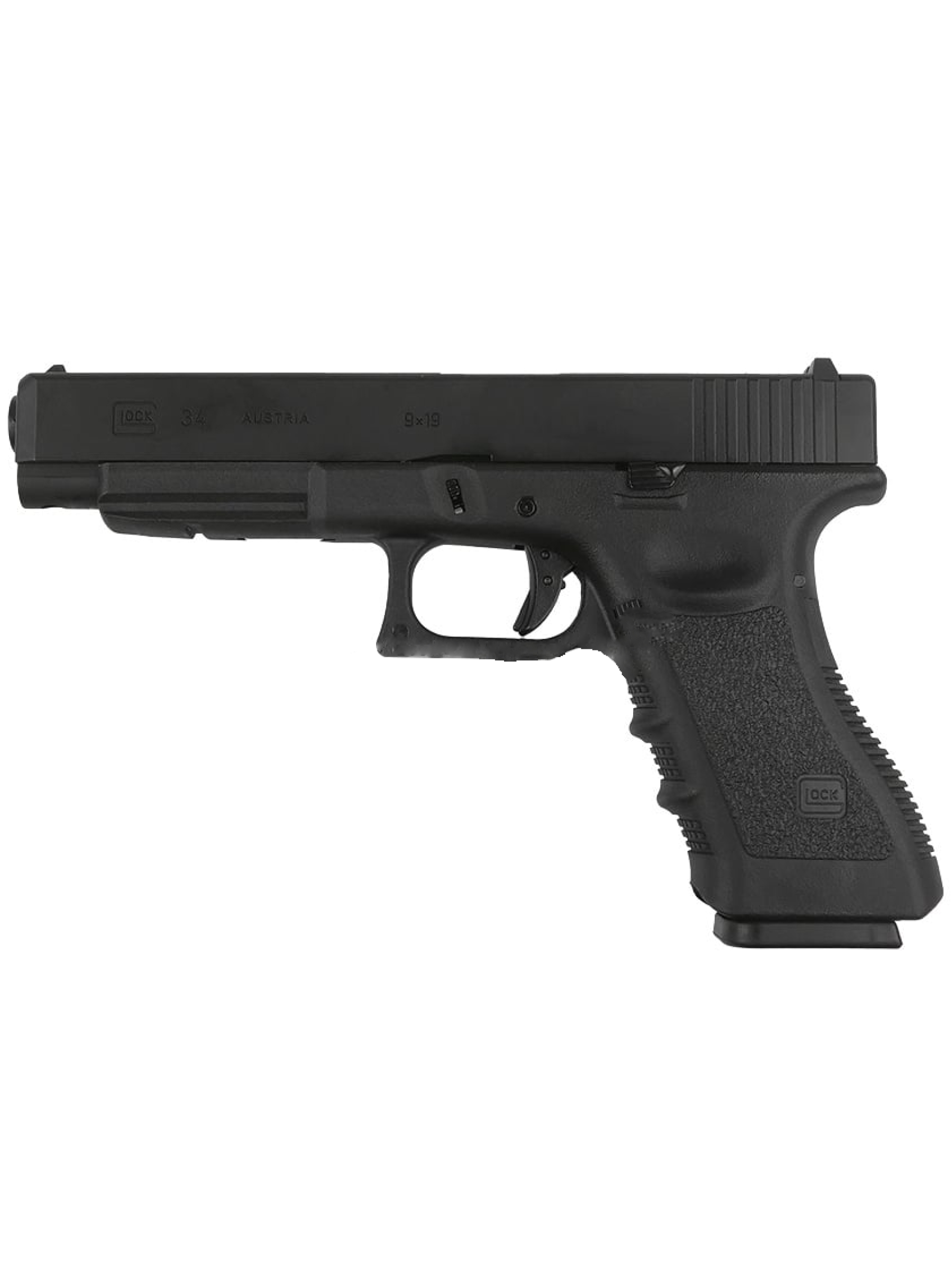 Glock 34 — это более длинная версия Glock 17, выпускаемая с 1998 года. Основные отличия — длина ствола (135 мм против 114 мм у Glock 17), наличие выреза в верхней передней части кожуха-затвора, что повышает баланс и точность. Общая длина составляет 224 мм (против 204 мм у Glock 17), вес — 650 г (против 625 г). Эта модификация предназначена для профессиональных стрелков и строгих дисциплин благодаря увеличенной длине и улучшенной точности.