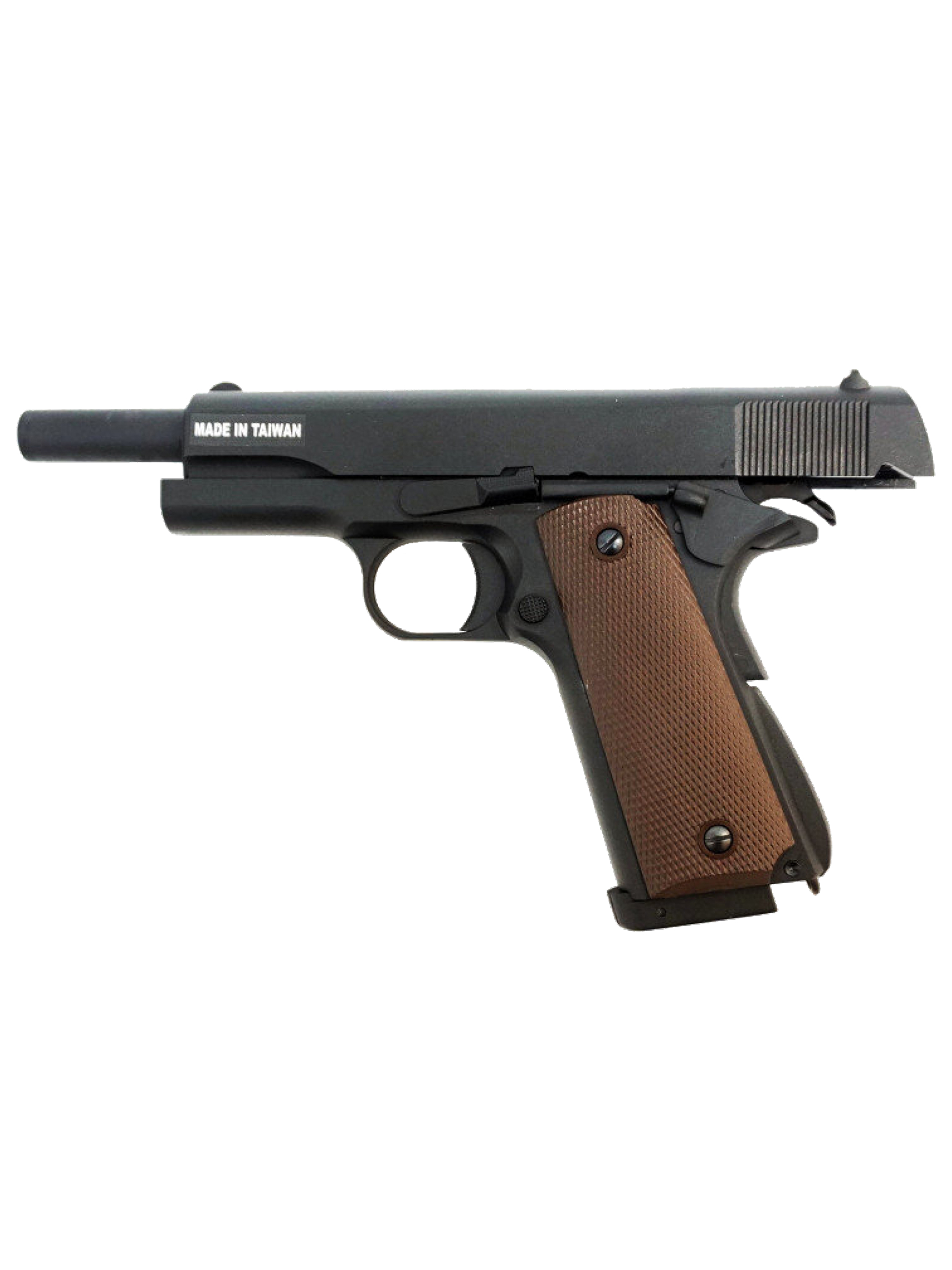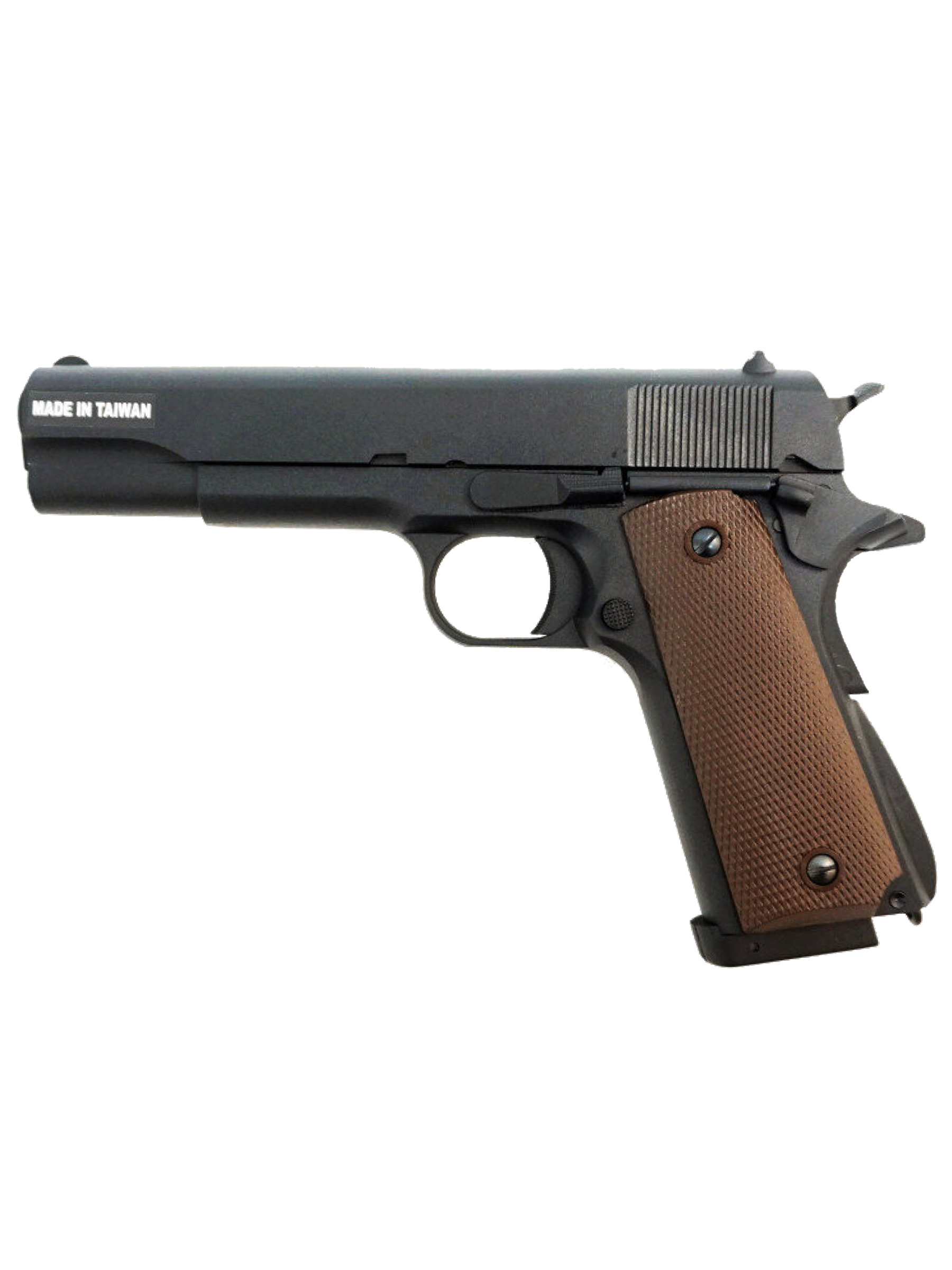 Рамка и затворная рама страйкбольного пистолета Colt 1911 СО₂ выполнены из металла, накладки на рукоять - из коричневого пластика с рифлением; цвет корпуса - черный. В качестве источника энергии используются 12-граммовые баллончики с углекислым газом (СО₂). Хоп-ап - регулируемый.