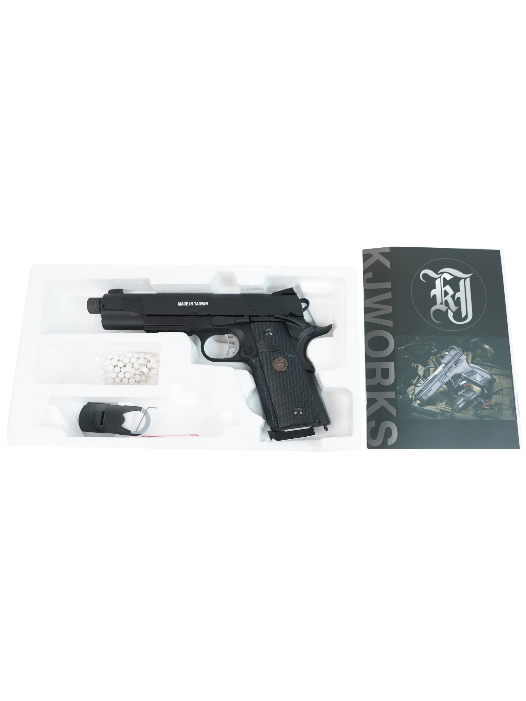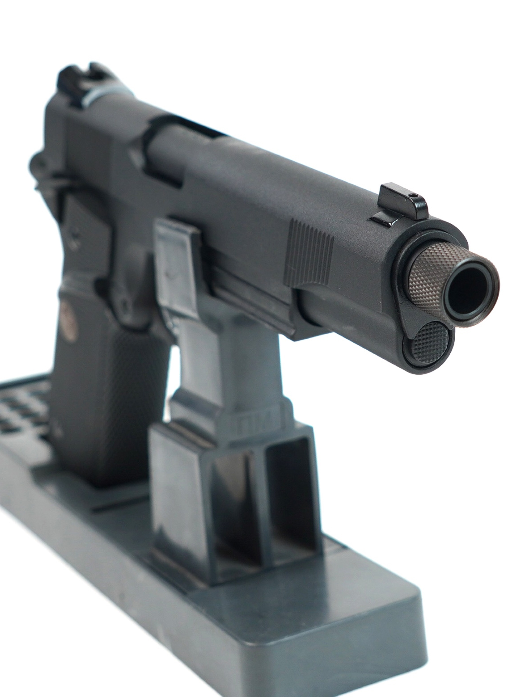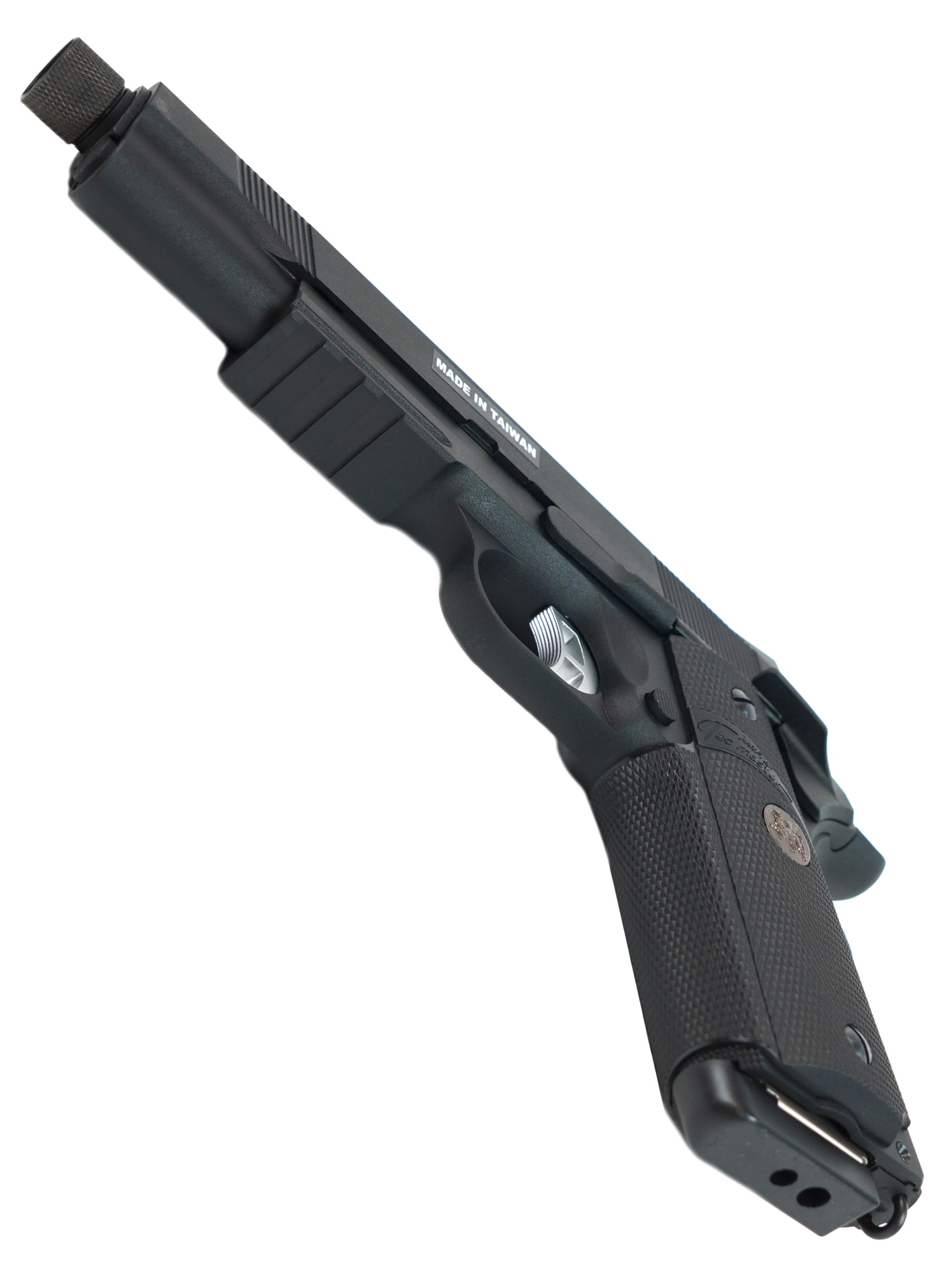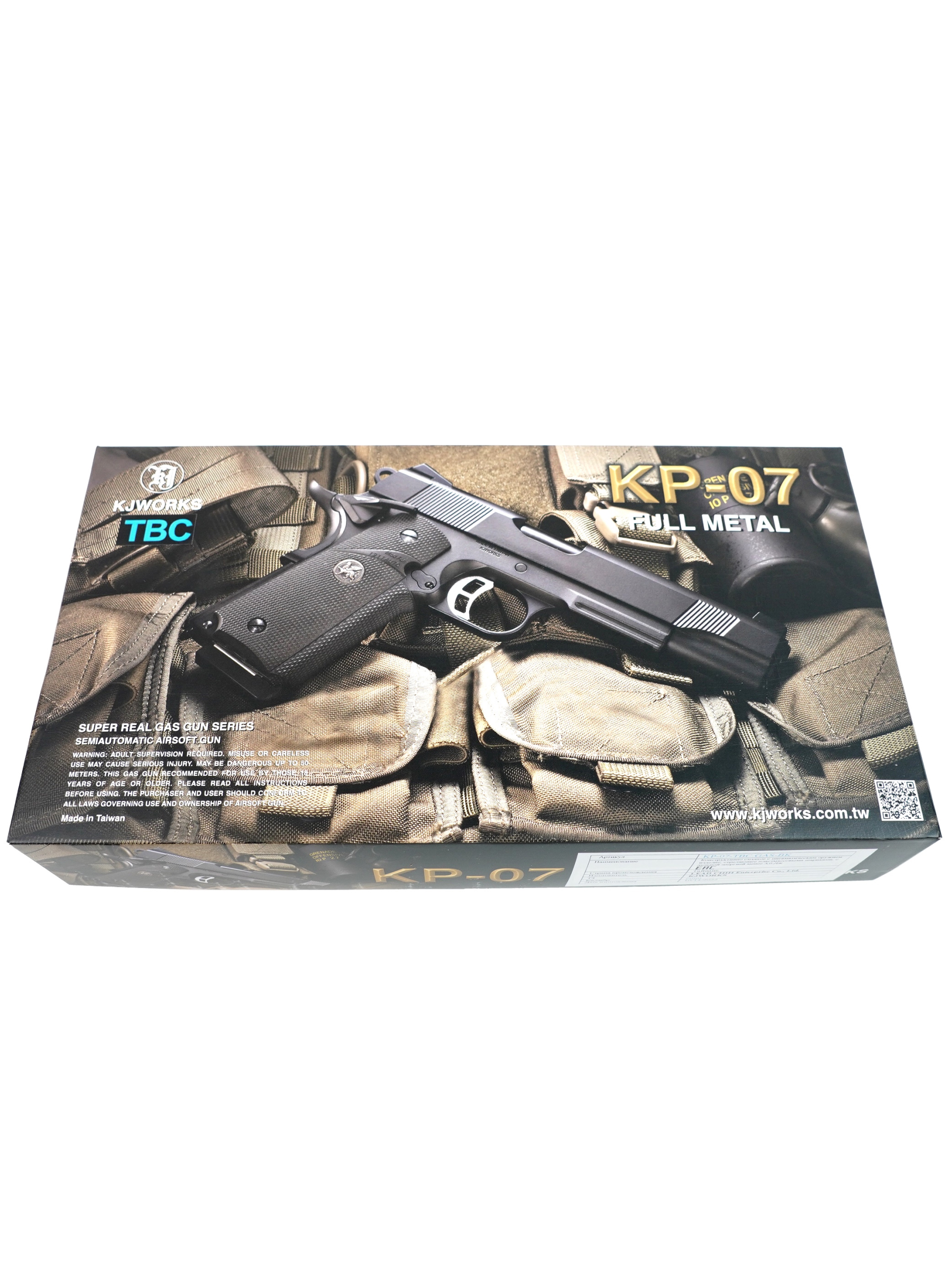 Страйкбольная модель KP-07 от фирмы KJWorks внешне копирует известный пистолет M45 MEU(SOC), разработанный для вооружения подразделений специальных операций США на базе пистолета Colt M1911A1. Предлагаемое исполнение TBC (Thread Barrel & Cap) отличается удлиненным стволом с резьбой М14- (CCW) на дульной части для установки имитатора глушителя, трассерной насадки или иных подобных аксессуаров. Штатно резьба закрыта заглушкой с сетчатым рифлением.