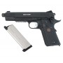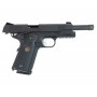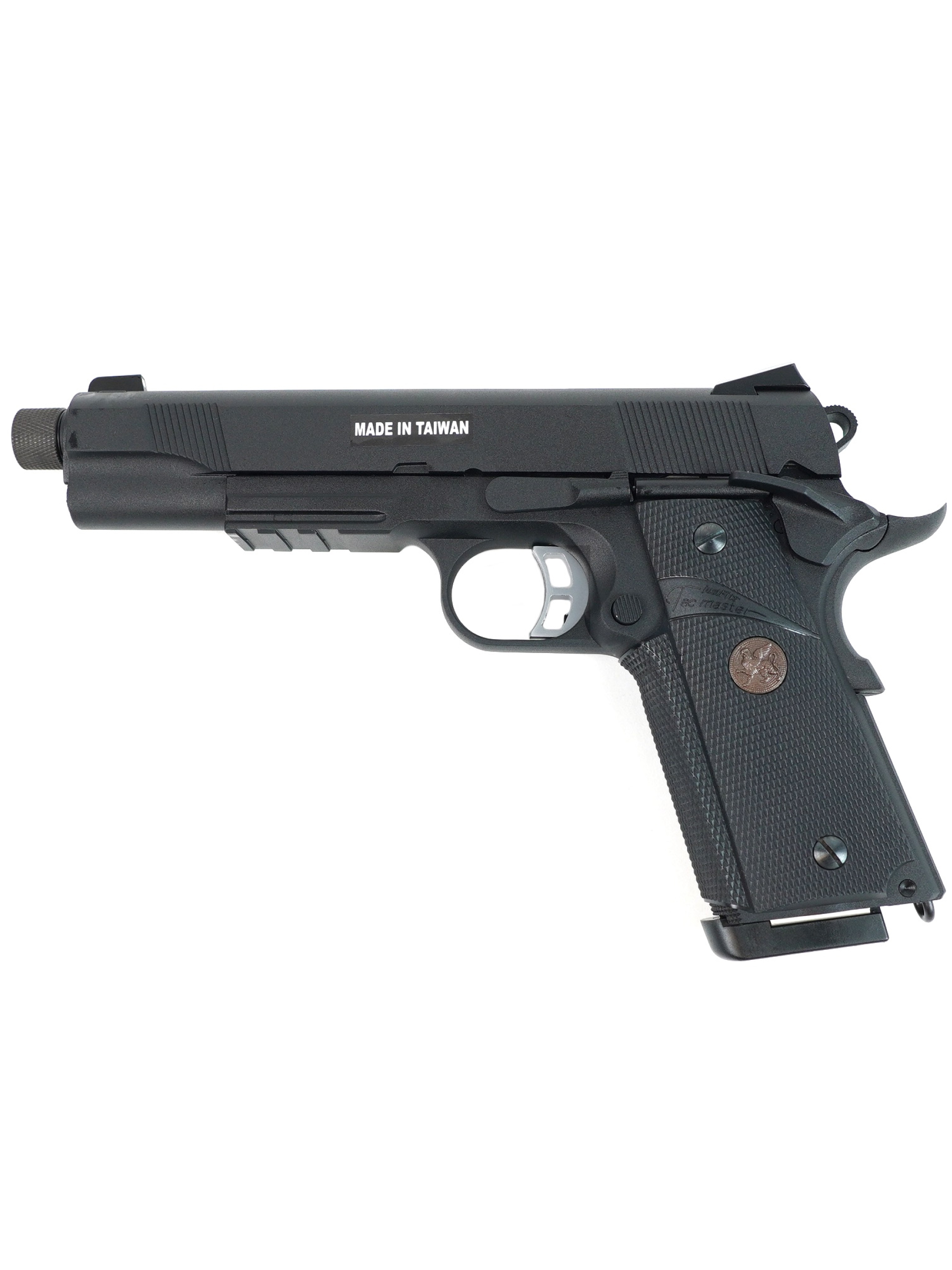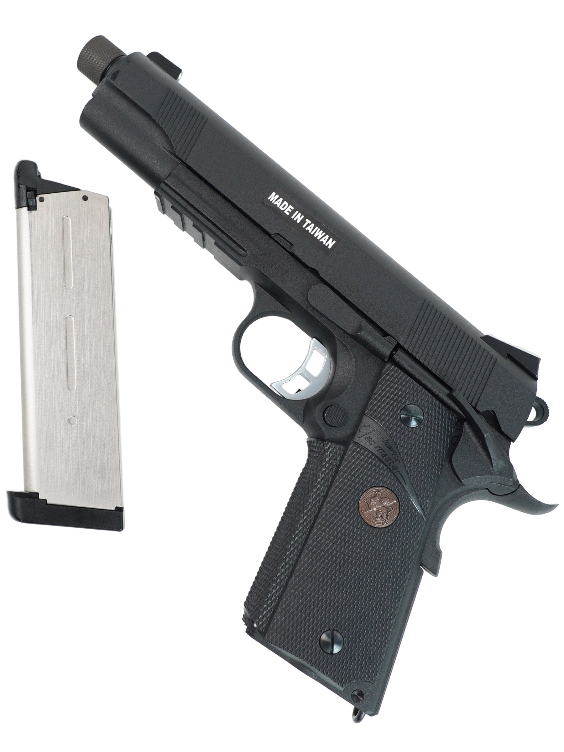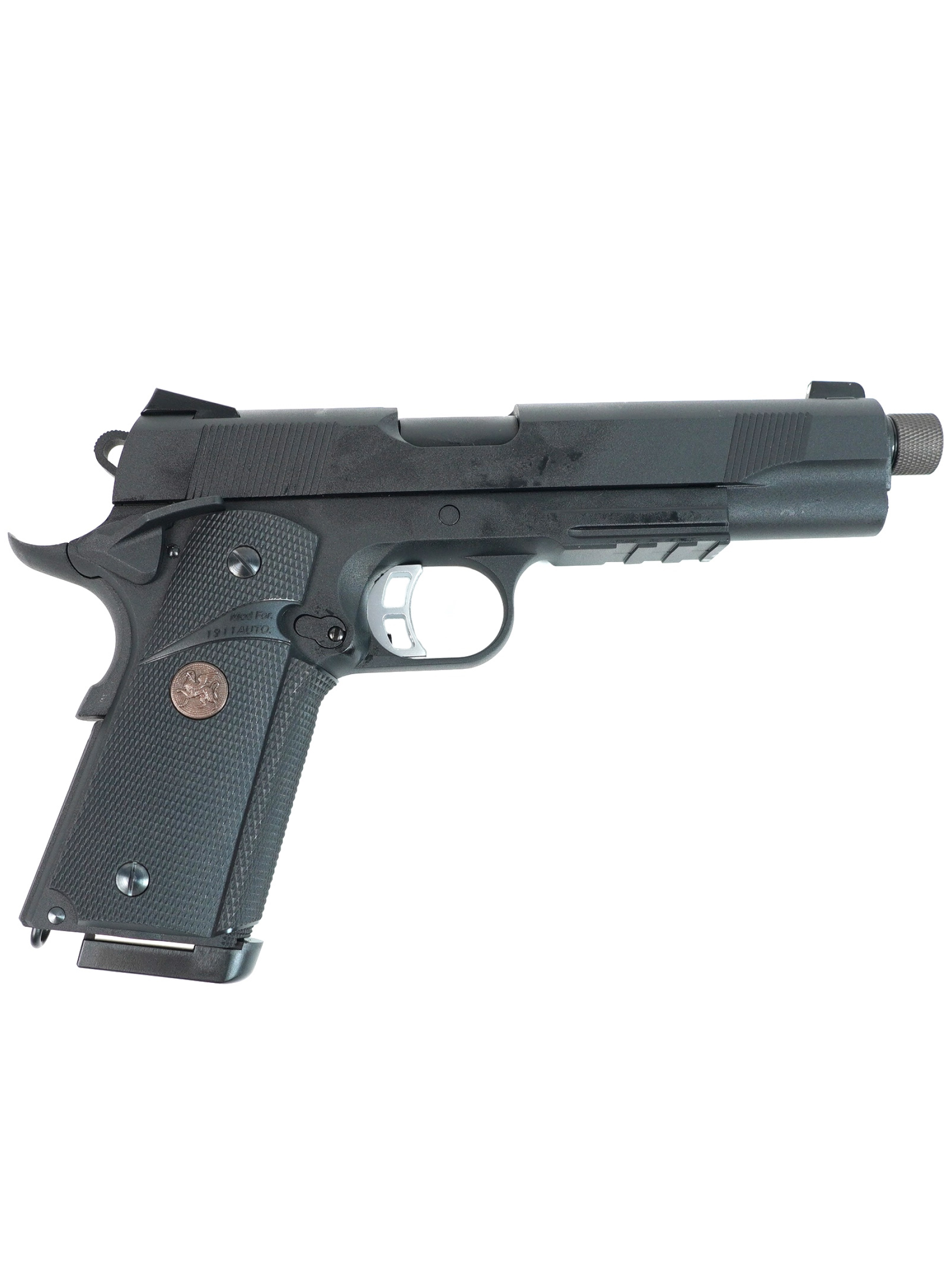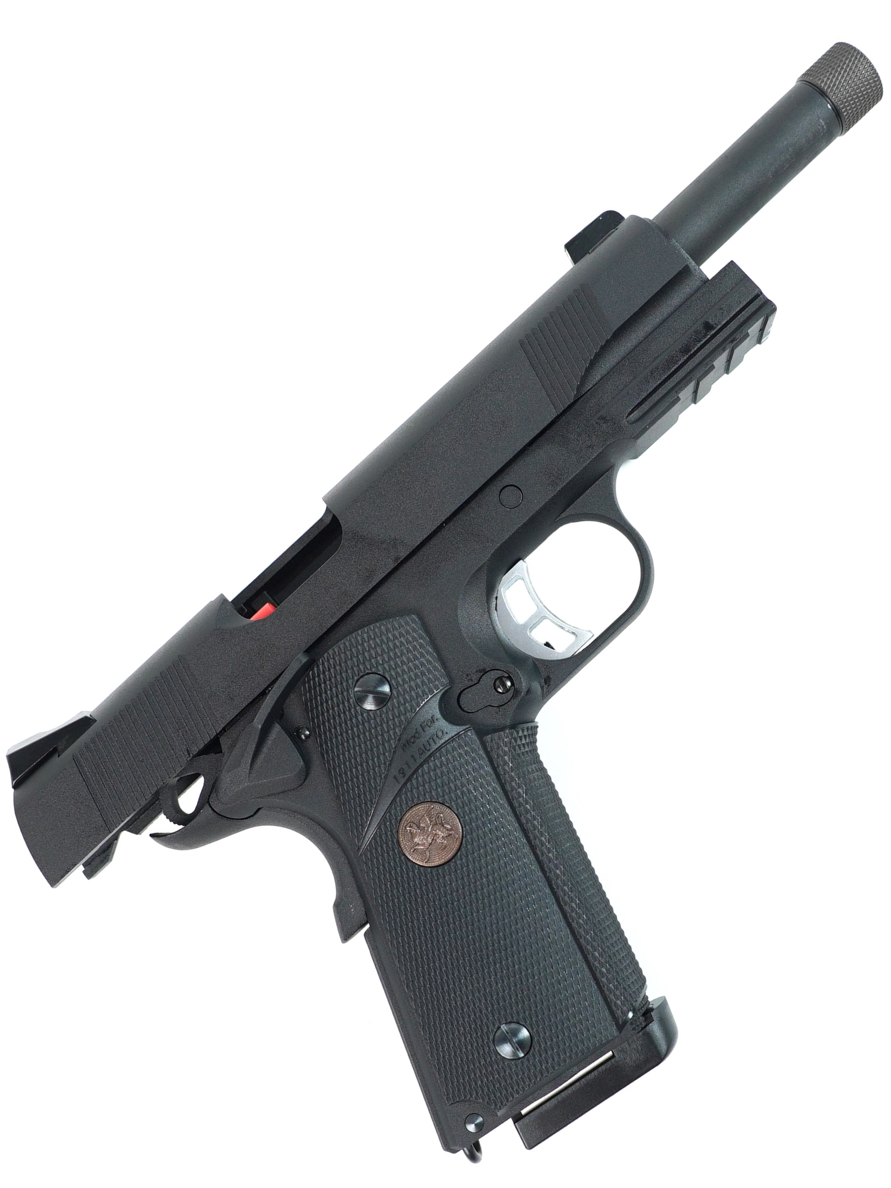 Страйкбольная модель KP-07 от фирмы KJWorks внешне копирует известный пистолет M45 MEU(SOC), разработанный для вооружения подразделений специальных операций США на базе пистолета Colt M1911A1. Предлагаемое исполнение TBC (Thread Barrel & Cap) отличается удлиненным стволом с резьбой М14- (CCW) на дульной части для установки имитатора глушителя, трассерной насадки или иных подобных аксессуаров. Штатно резьба закрыта заглушкой с сетчатым рифлением.
