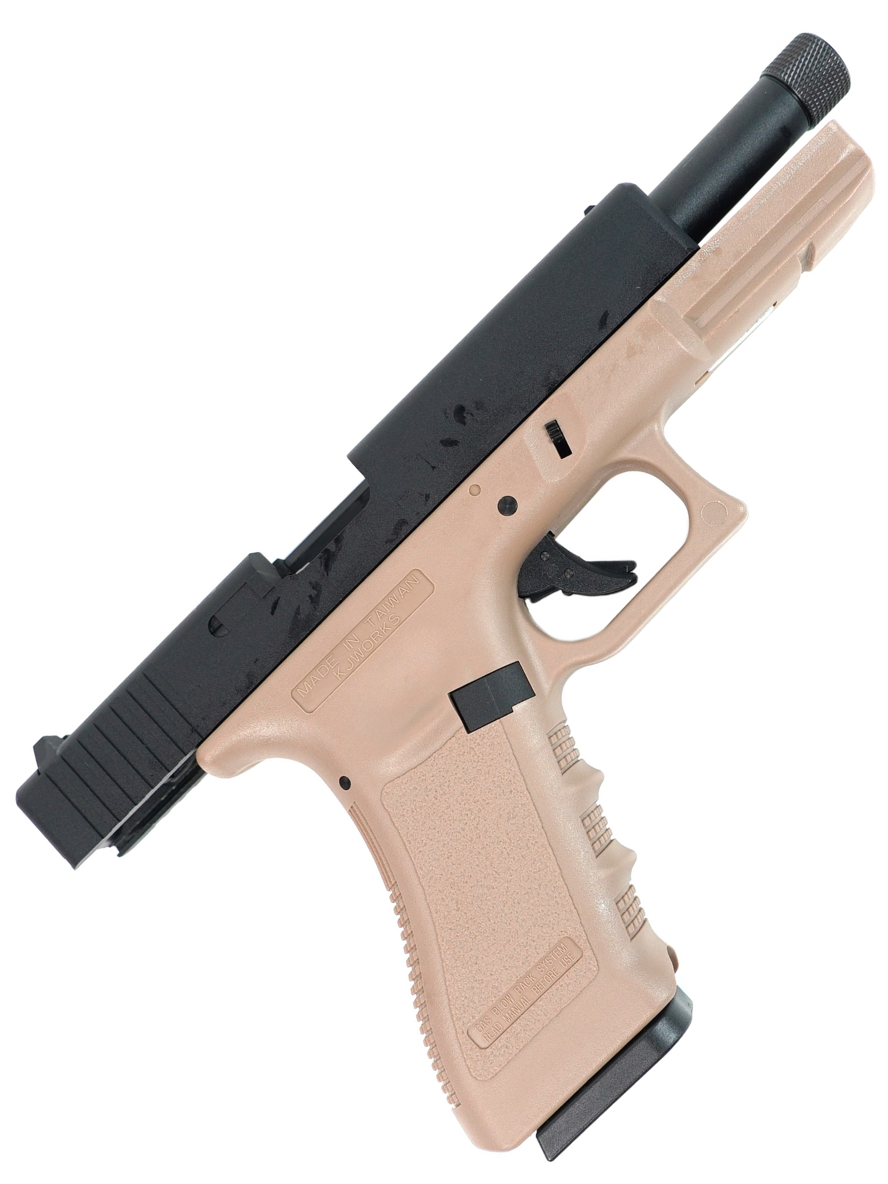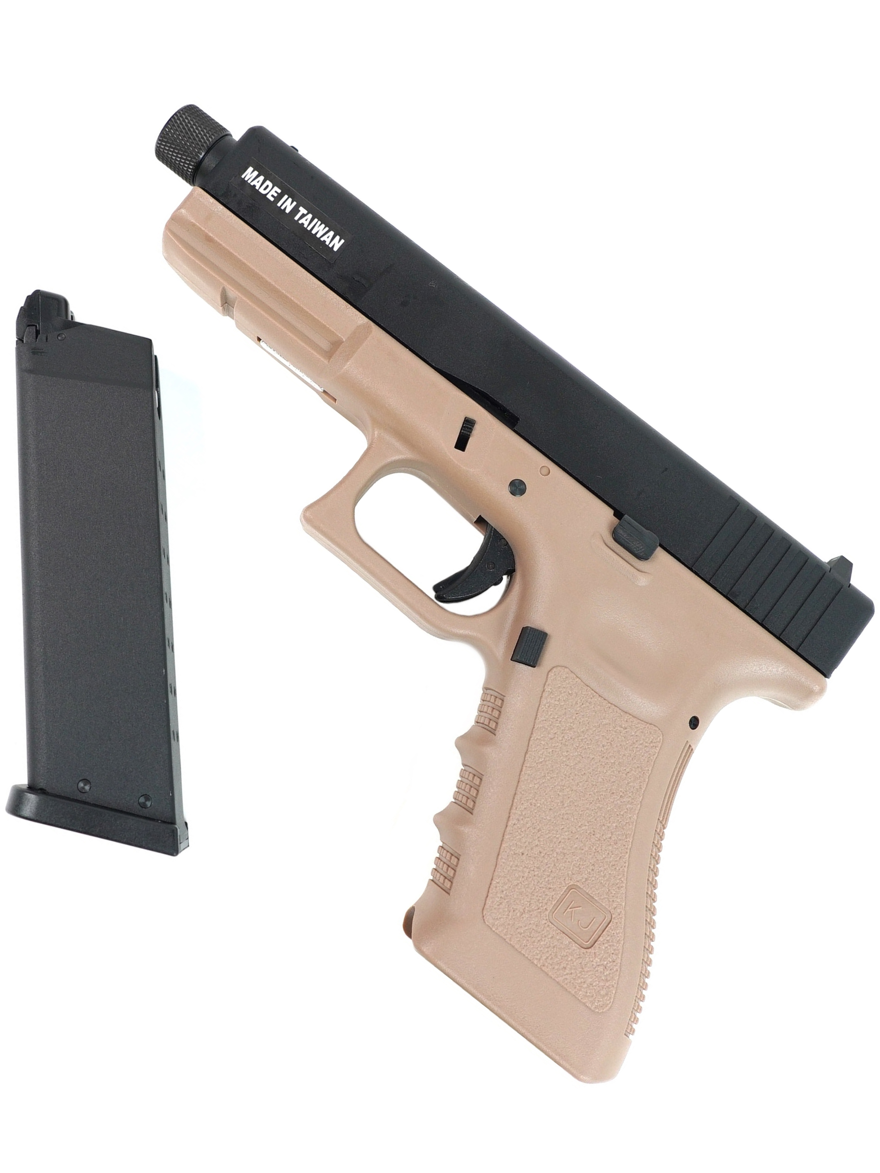 Корпус и затвор пистолета выполнены из металла, что обеспечивает высокую прочность и долговечность. Вес пистолета составляет 780 г. Главное отличие KJW KP-17 от базовой модели – это удлиненный ствол (110 мм) с резьбой под глушитель. Это позволяет устанавливать различные насадки, улучшая скрытность или видимость траектории полета шара. Общая длина пистолета составляет 205 мм.