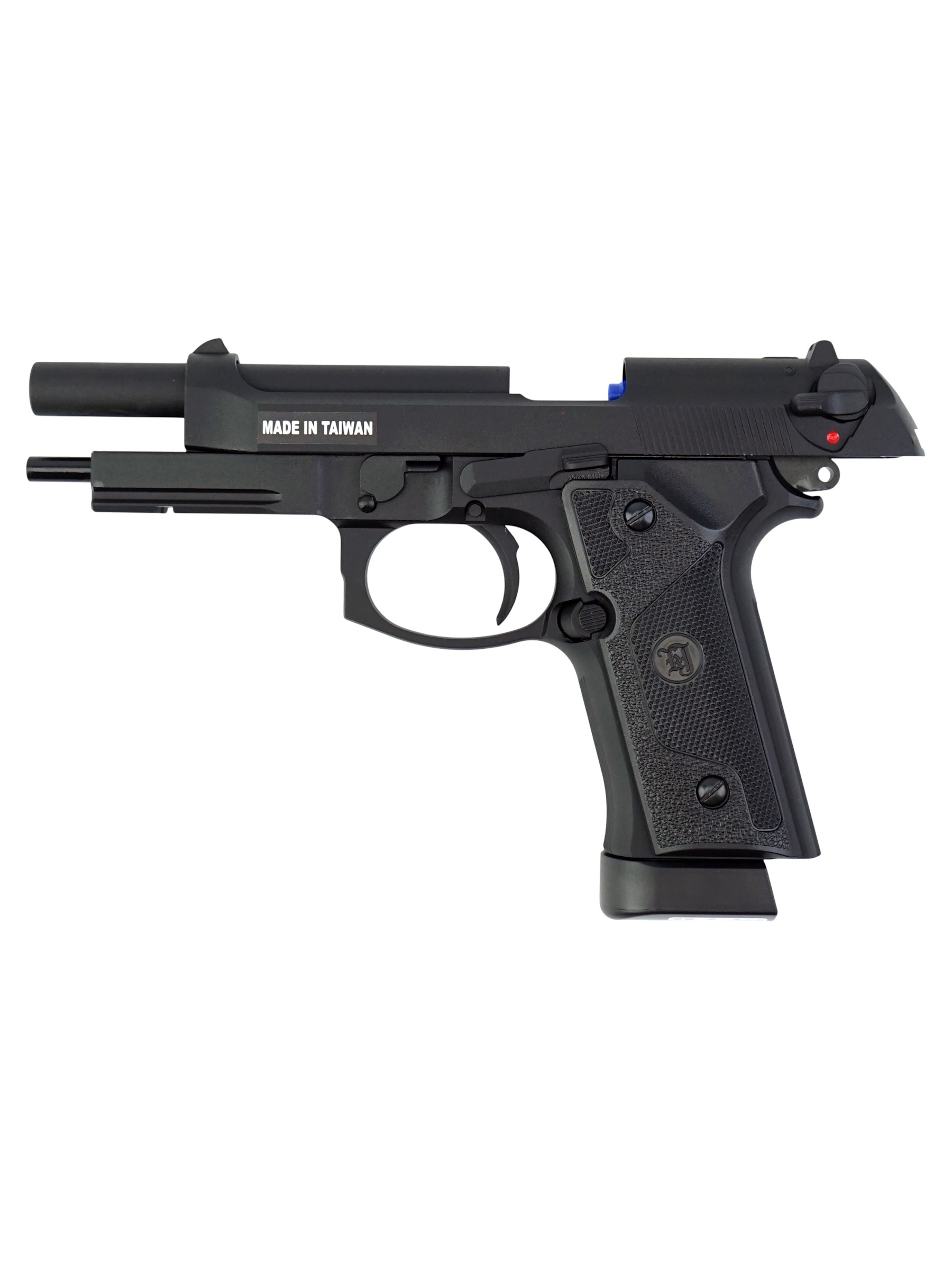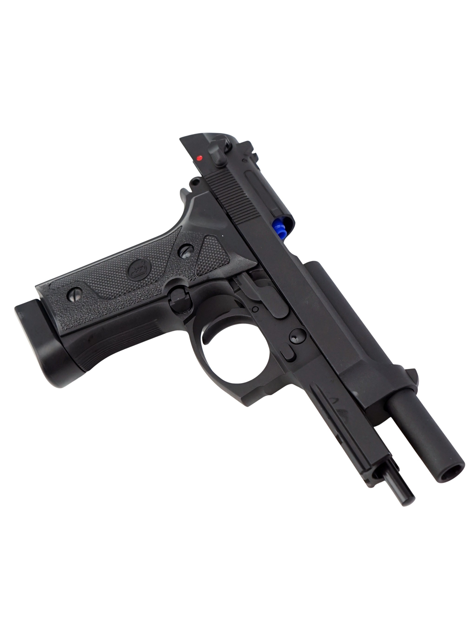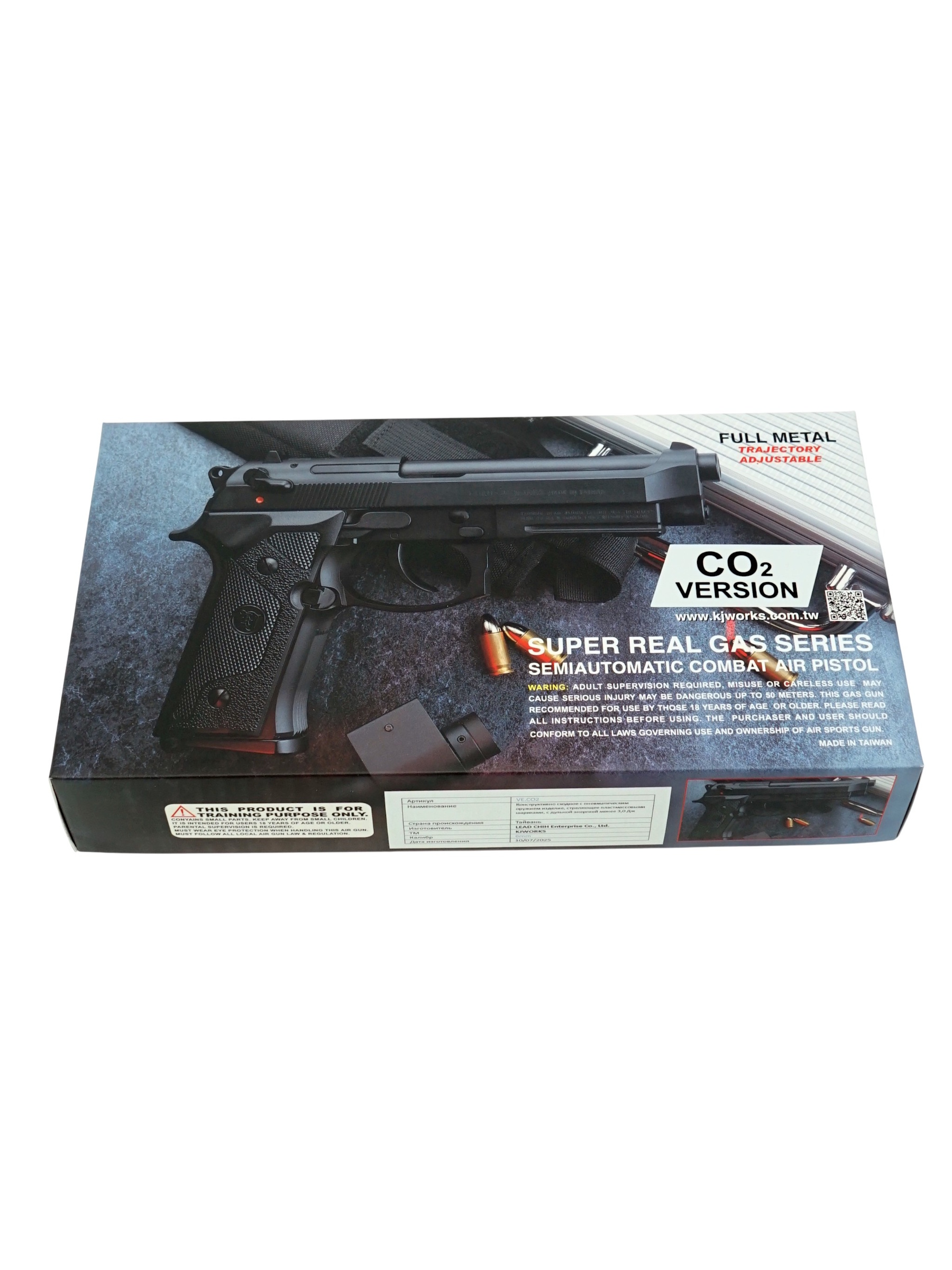 Страйкбольный пистолет M9 VE-FM от фирмы KJWorks внешне копирует одну из моделей семейства Beretta 92/M9. Предлагаемый вариант использует в качестве источника энергии грин газ. Затвор пистолета подвижный, при израсходовании всех шаров срабатывает затворная задержка; имеется блоубэк. По аналогии с прототипом реализована неполная разборка.