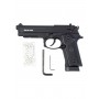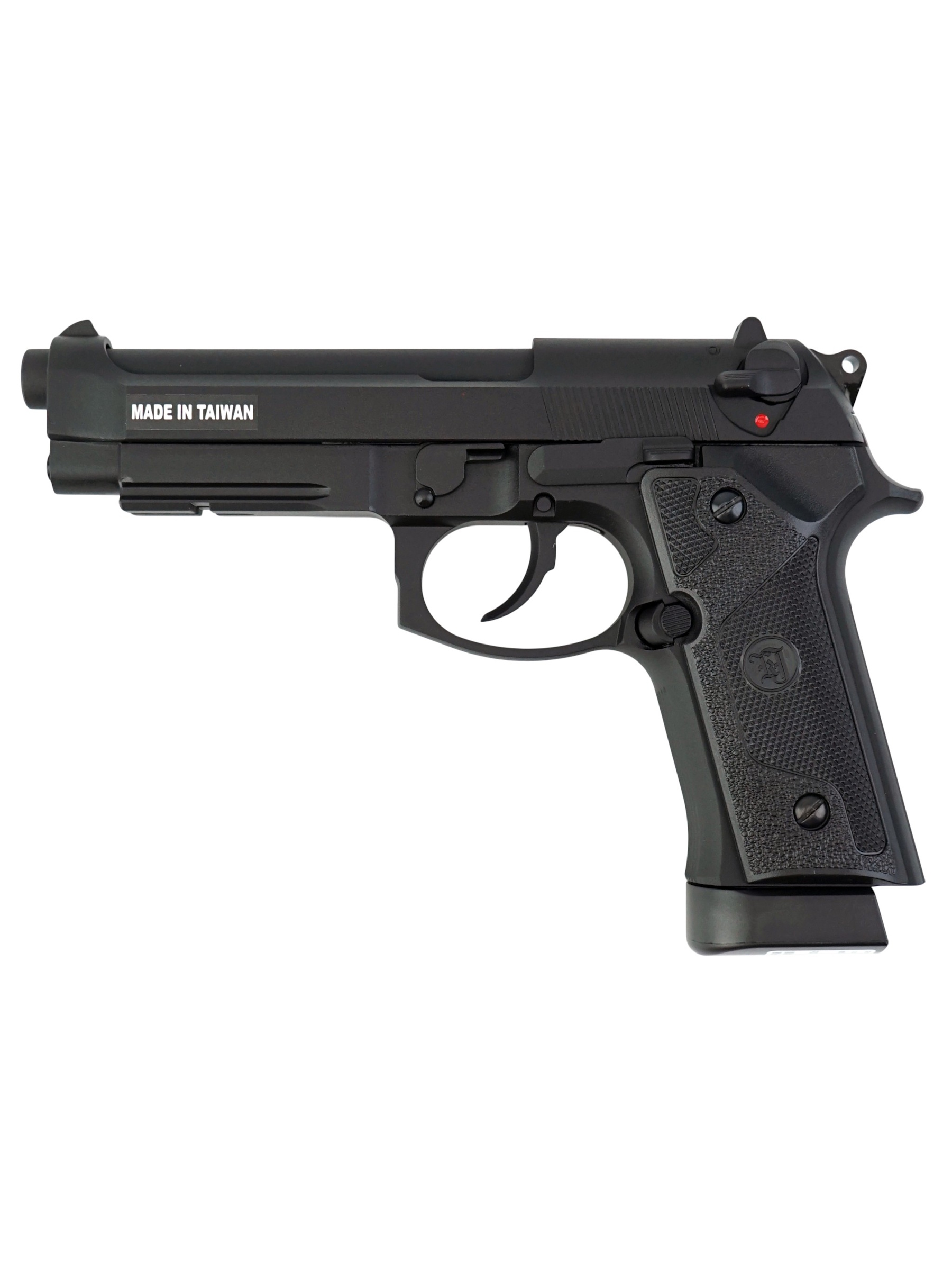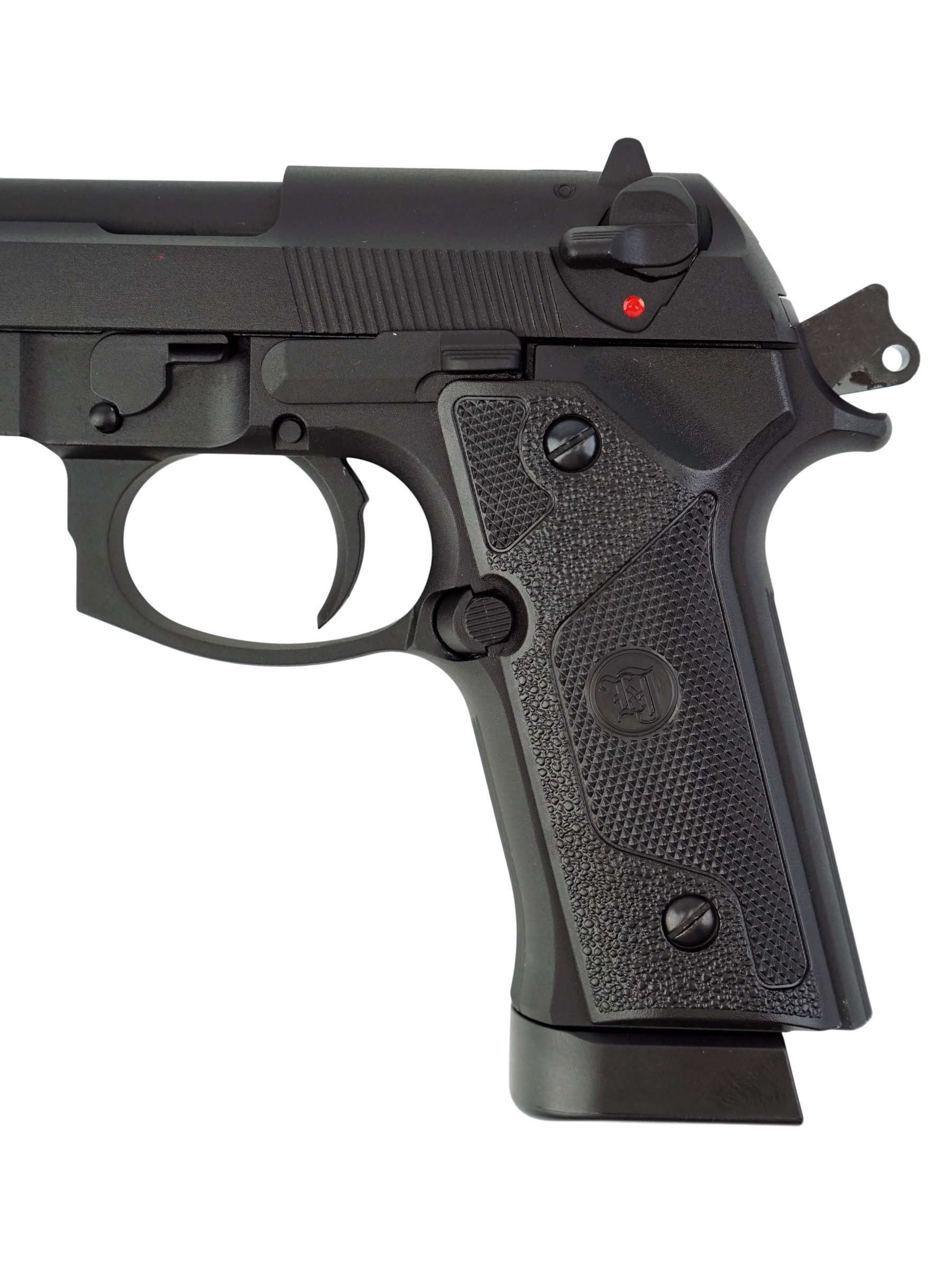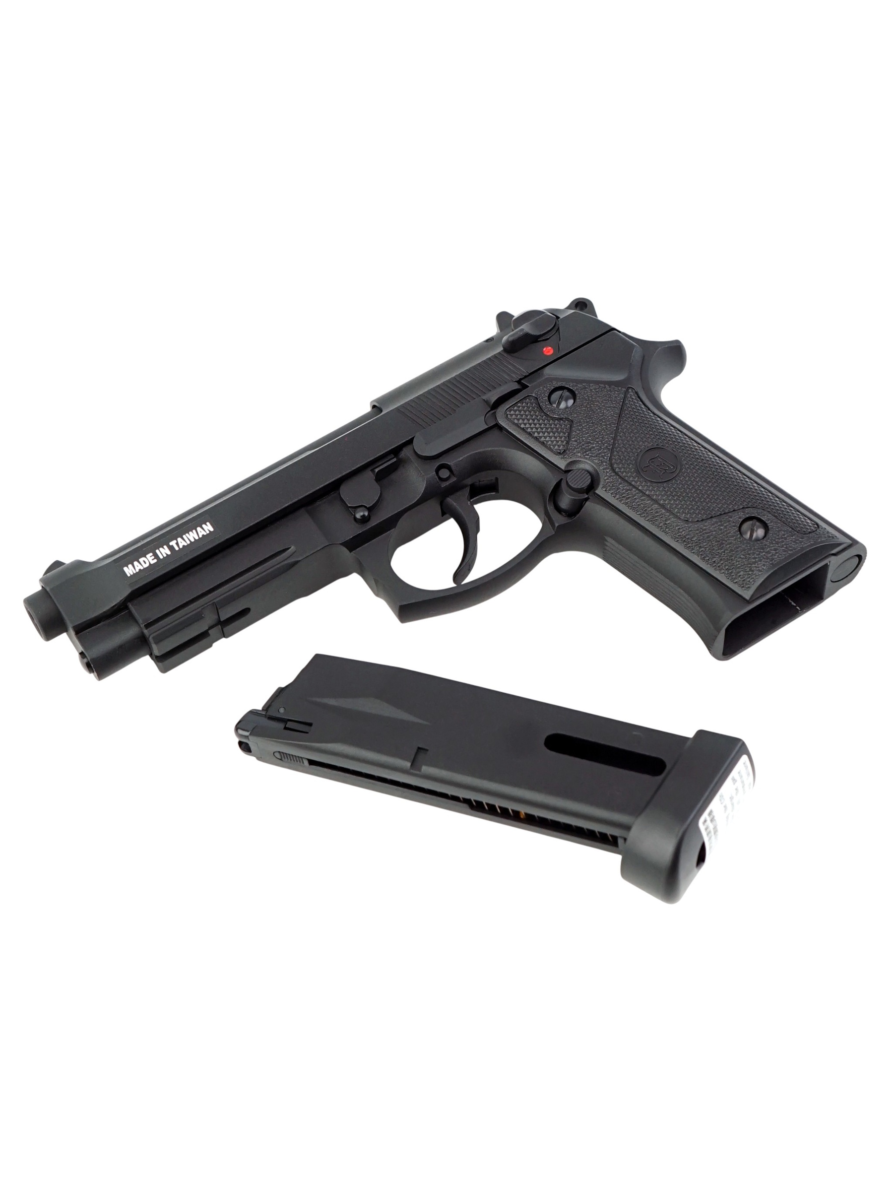 Страйкбольный пистолет M9 VE-FM от фирмы KJWorks внешне копирует одну из моделей семейства Beretta 92/M9. Предлагаемый вариант использует в качестве источника энергии грин газ. Затвор пистолета подвижный, при израсходовании всех шаров срабатывает затворная задержка; имеется блоубэк. По аналогии с прототипом реализована неполная разборка.