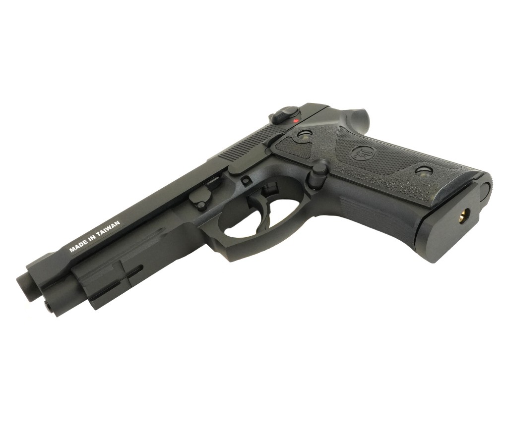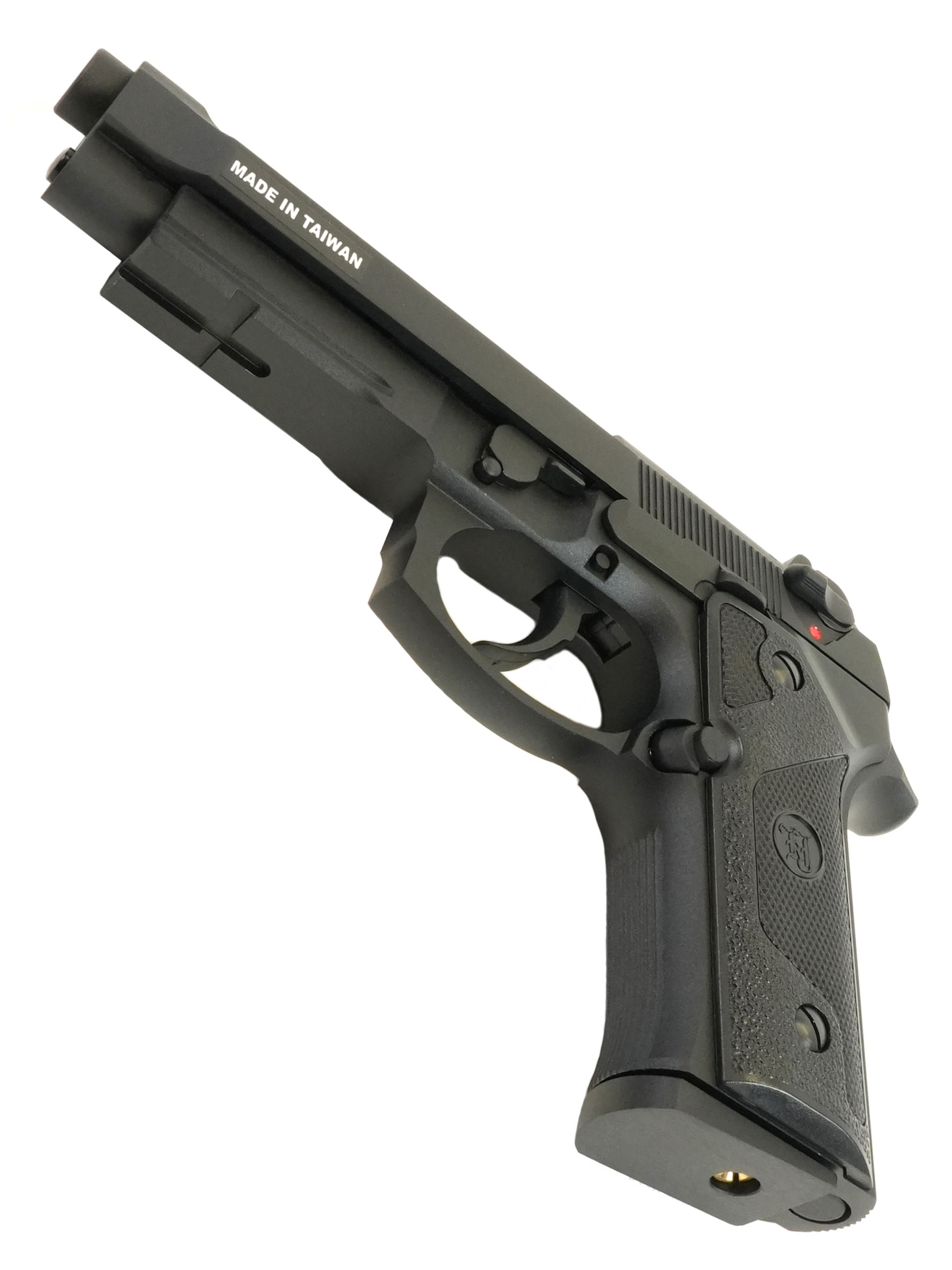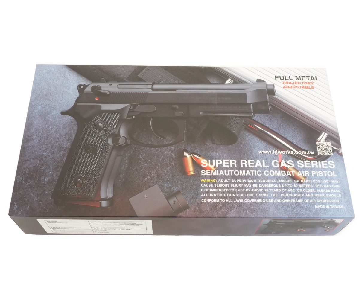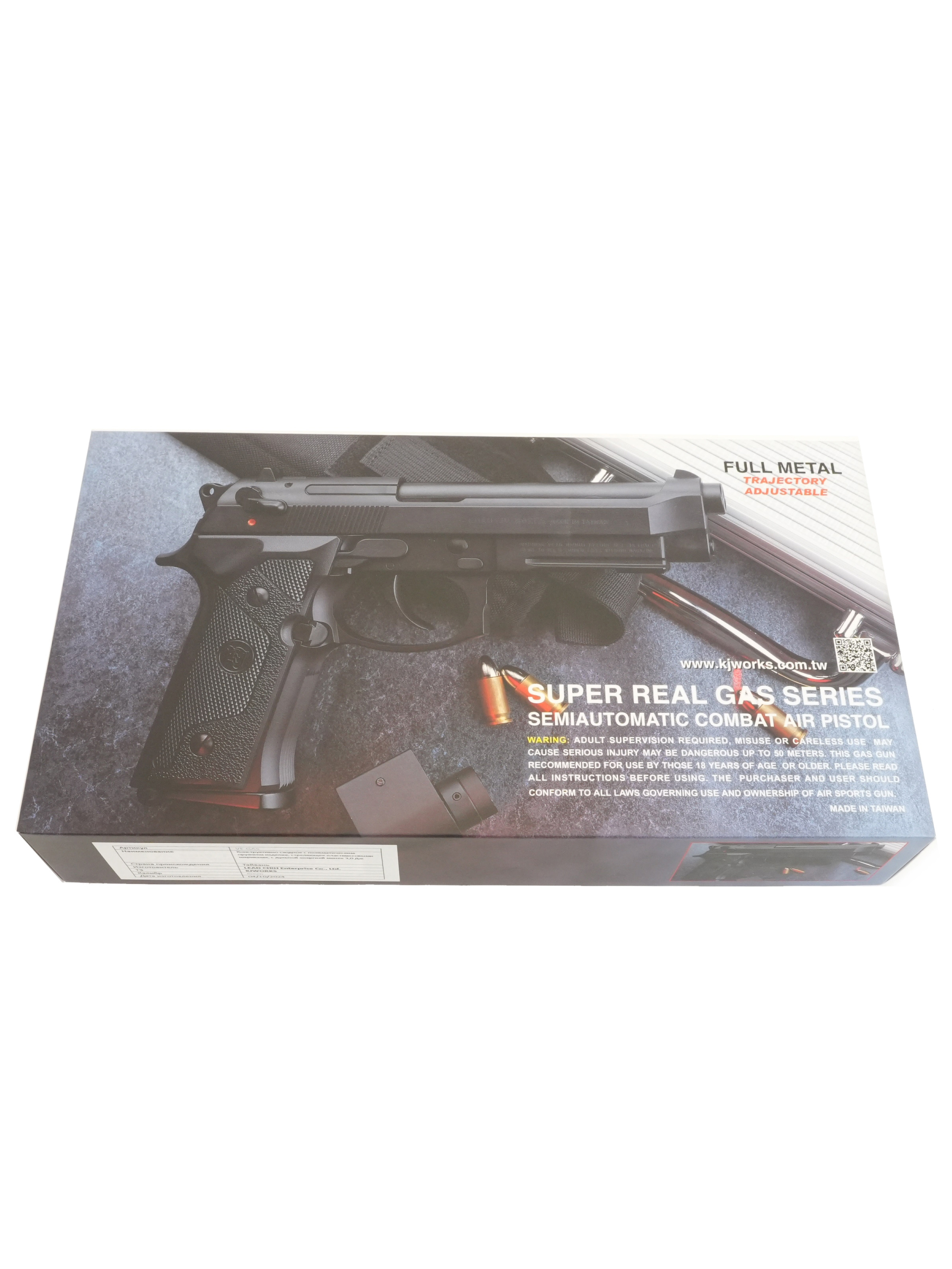 Страйкбольный пистолет M9 VE-FM от фирмы KJWorks внешне копирует одну из моделей семейства Beretta 92/M9. Предлагаемый вариант использует в качестве источника энергии грин газ. Затвор пистолета подвижный, при израсходовании всех шаров срабатывает затворная задержка; имеется блоубэк. По аналогии с прототипом реализована неполная разборка.