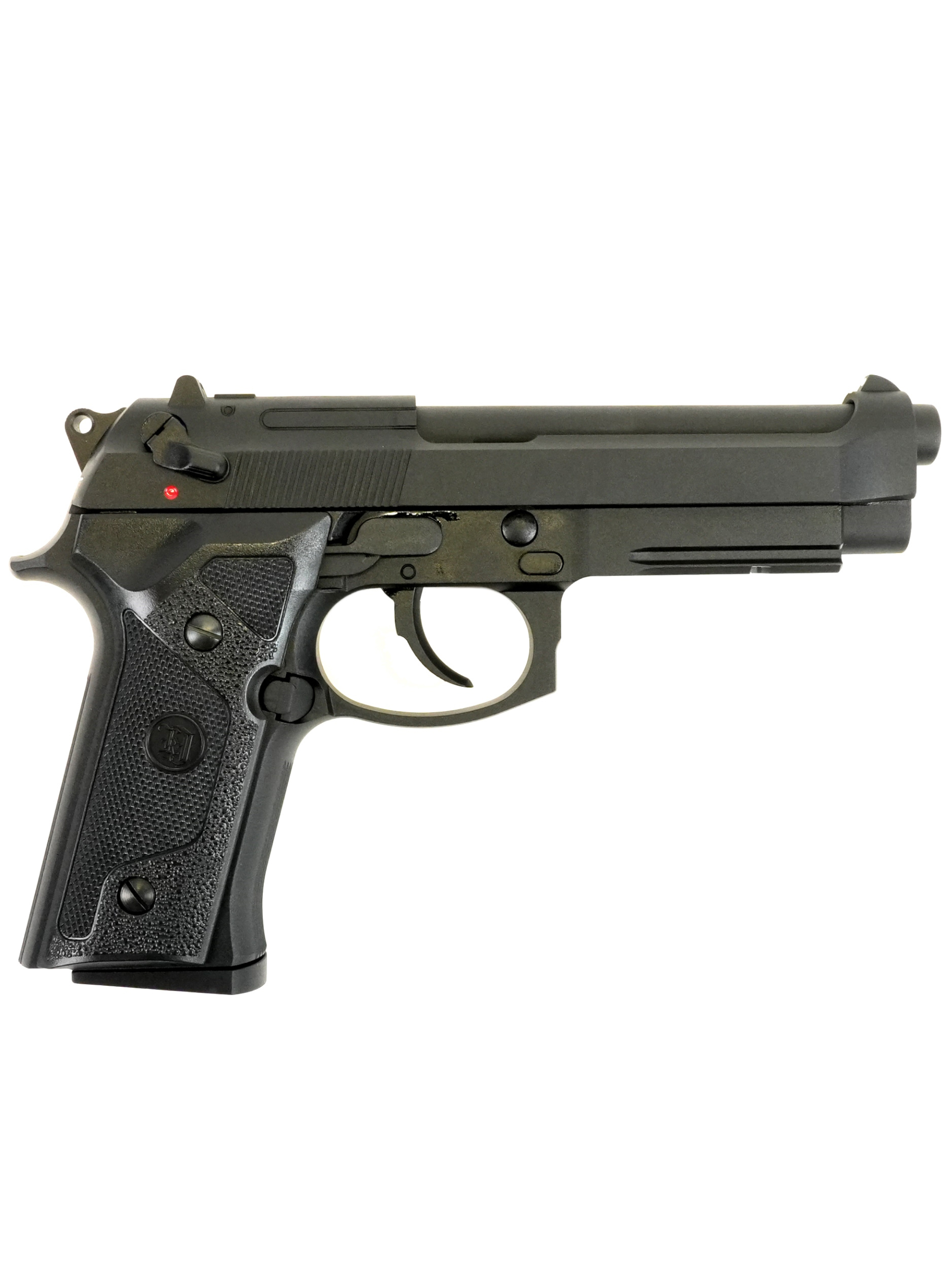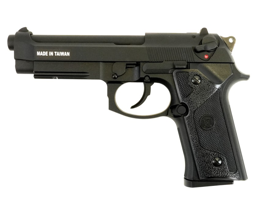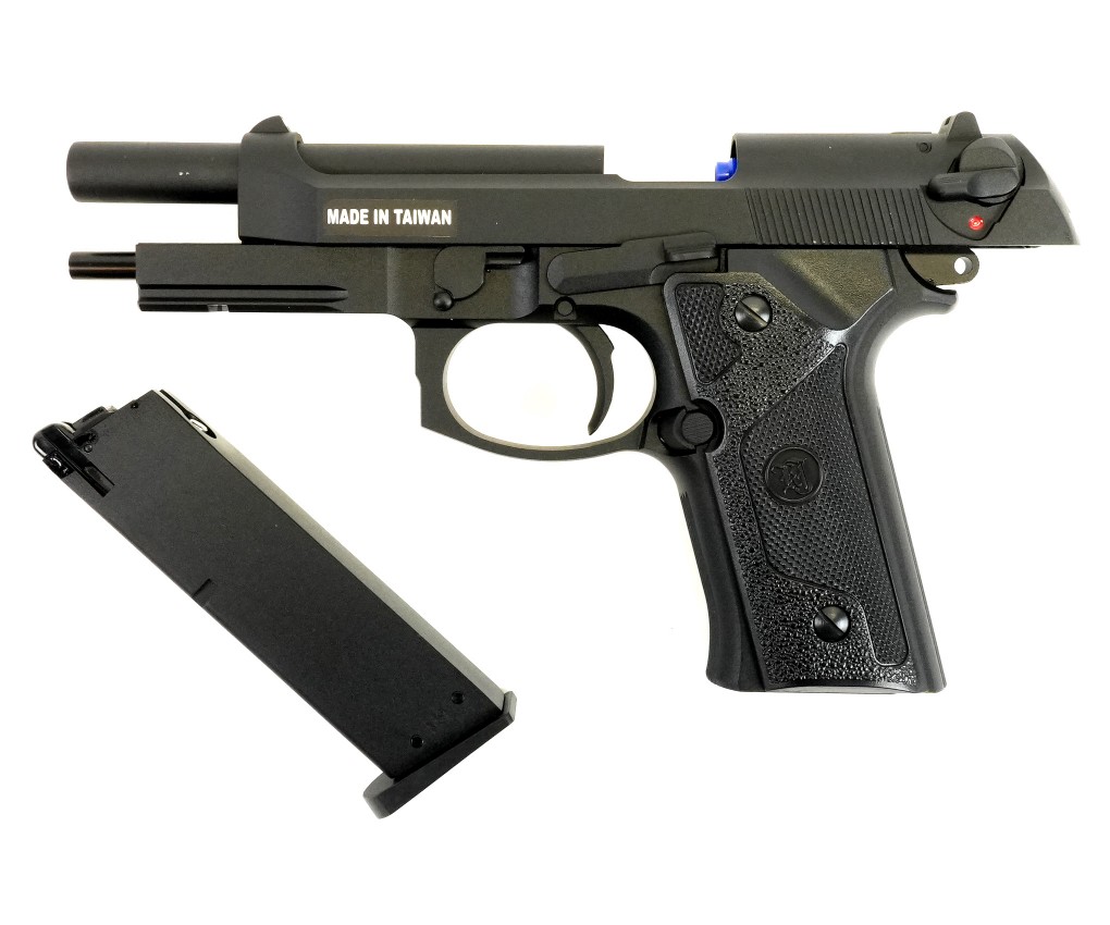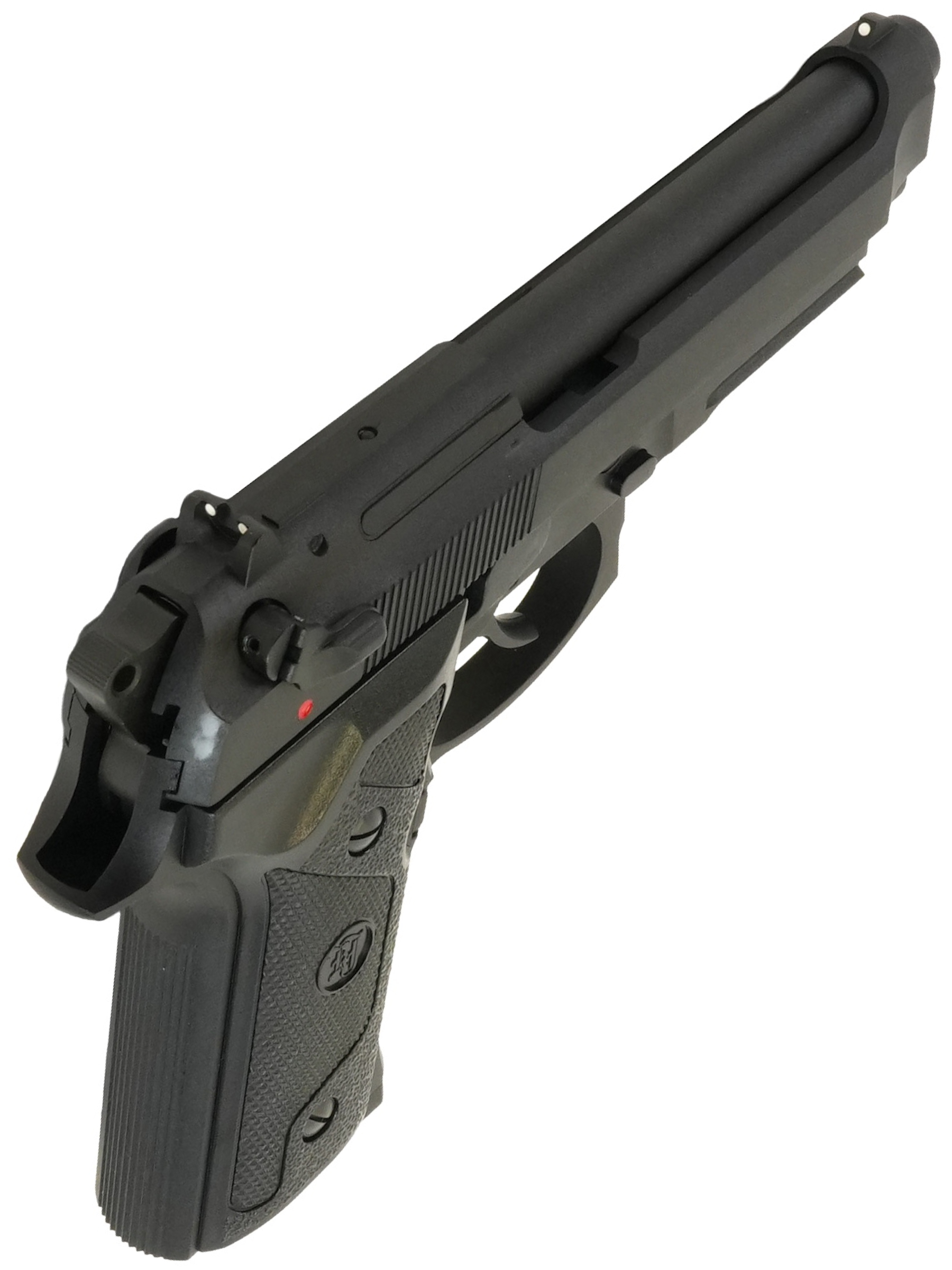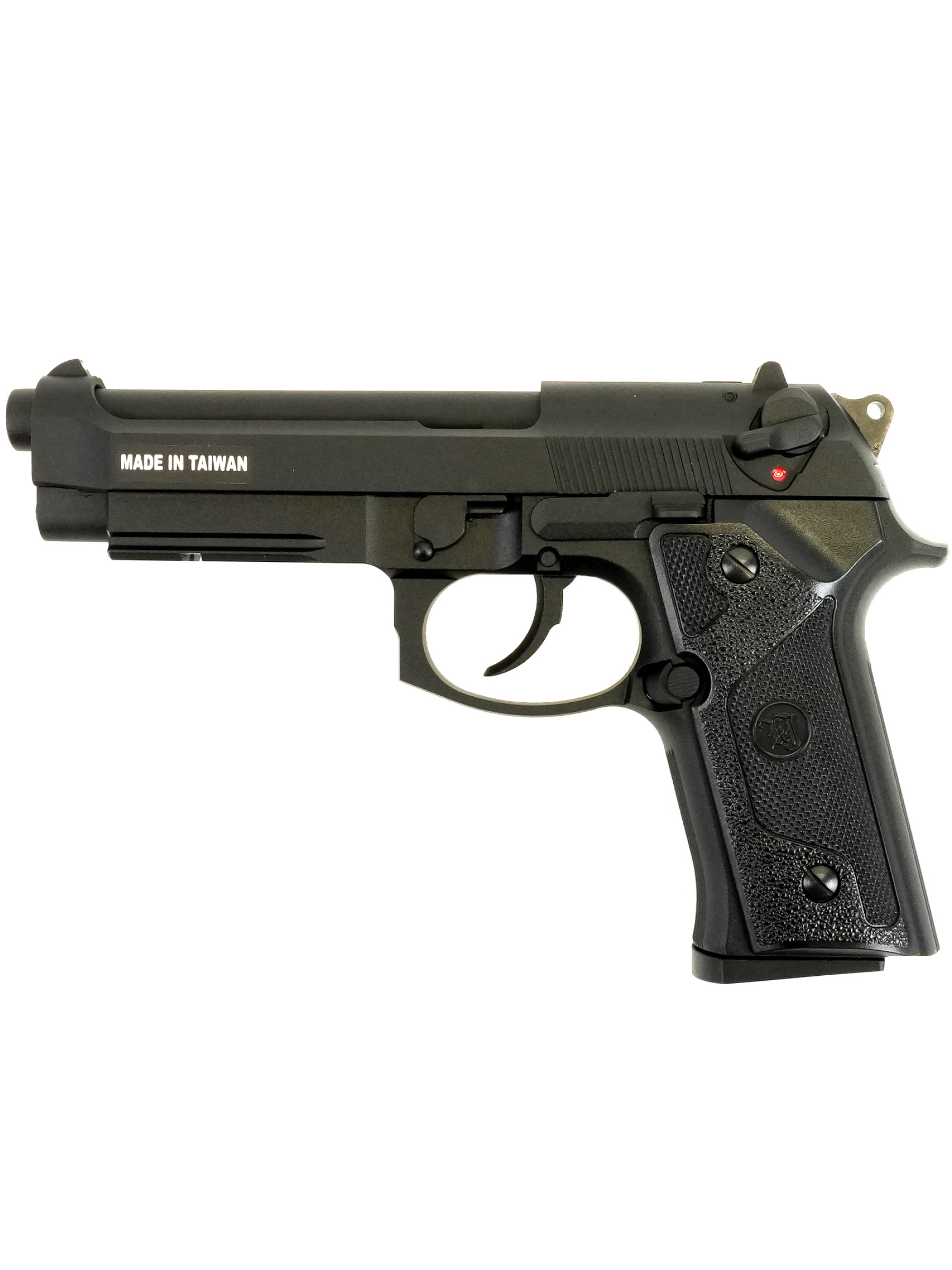 Страйкбольный пистолет M9 VE-FM от фирмы KJWorks внешне копирует одну из моделей семейства Beretta 92/M9. Предлагаемый вариант использует в качестве источника энергии грин газ. Затвор пистолета подвижный, при израсходовании всех шаров срабатывает затворная задержка; имеется блоубэк. По аналогии с прототипом реализована неполная разборка.