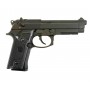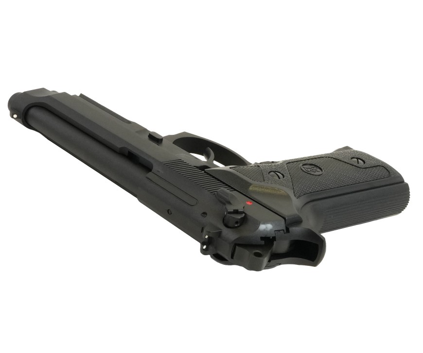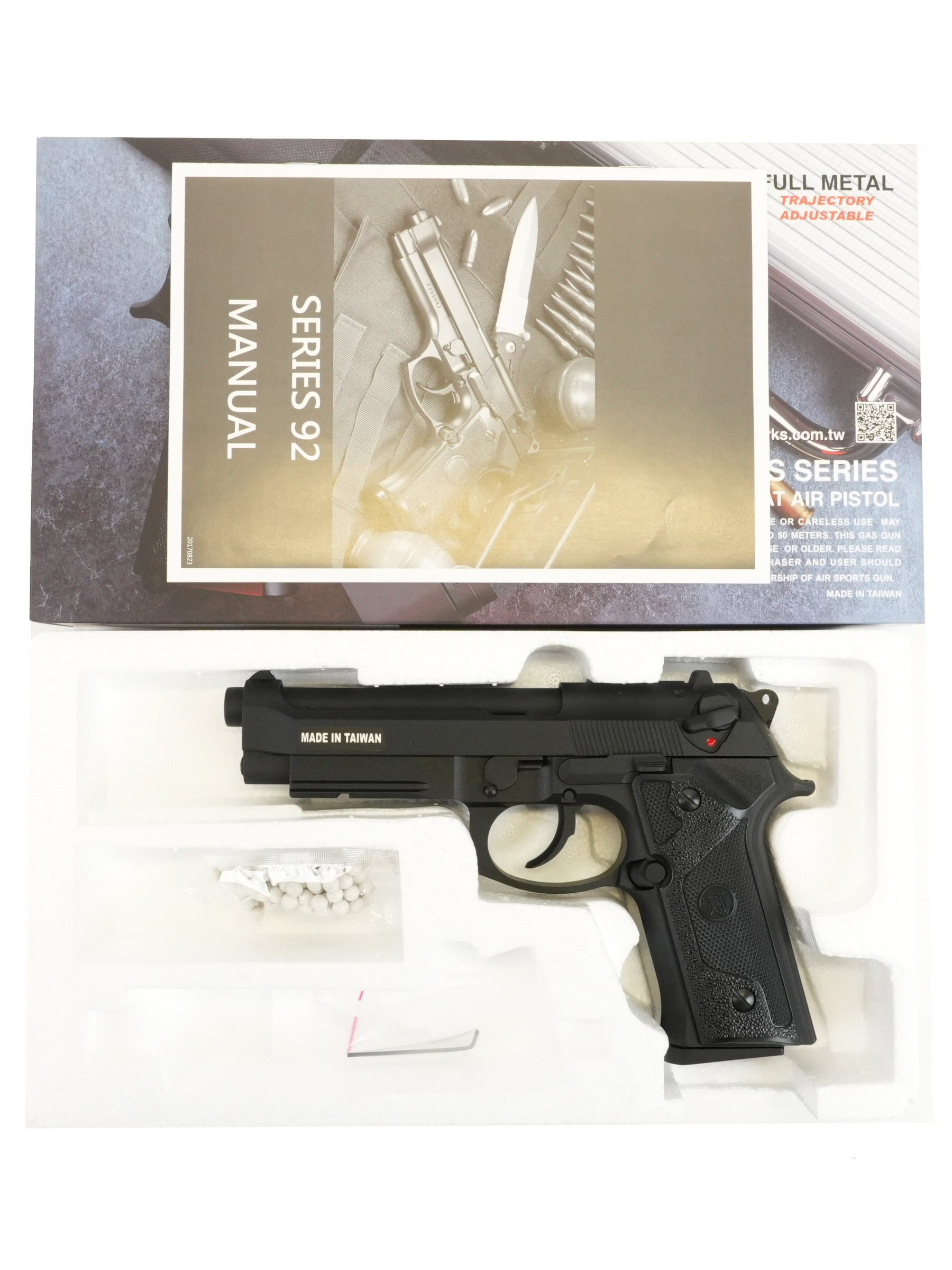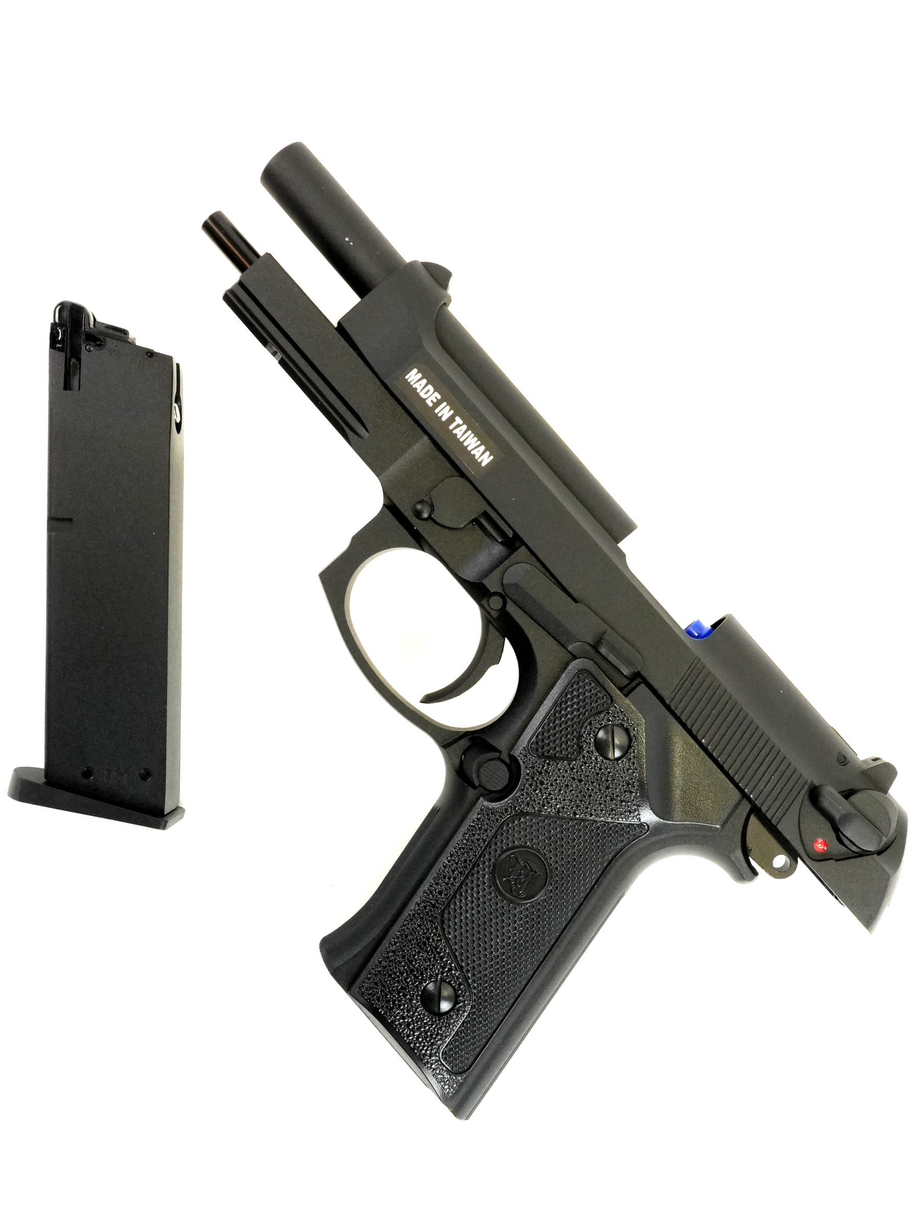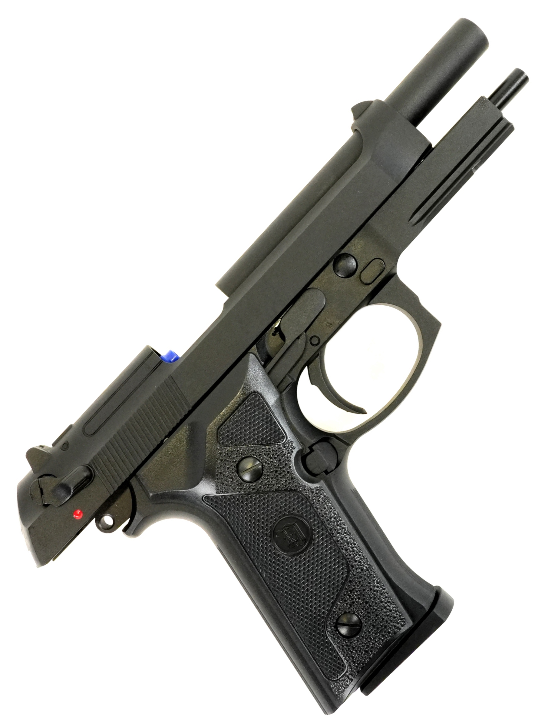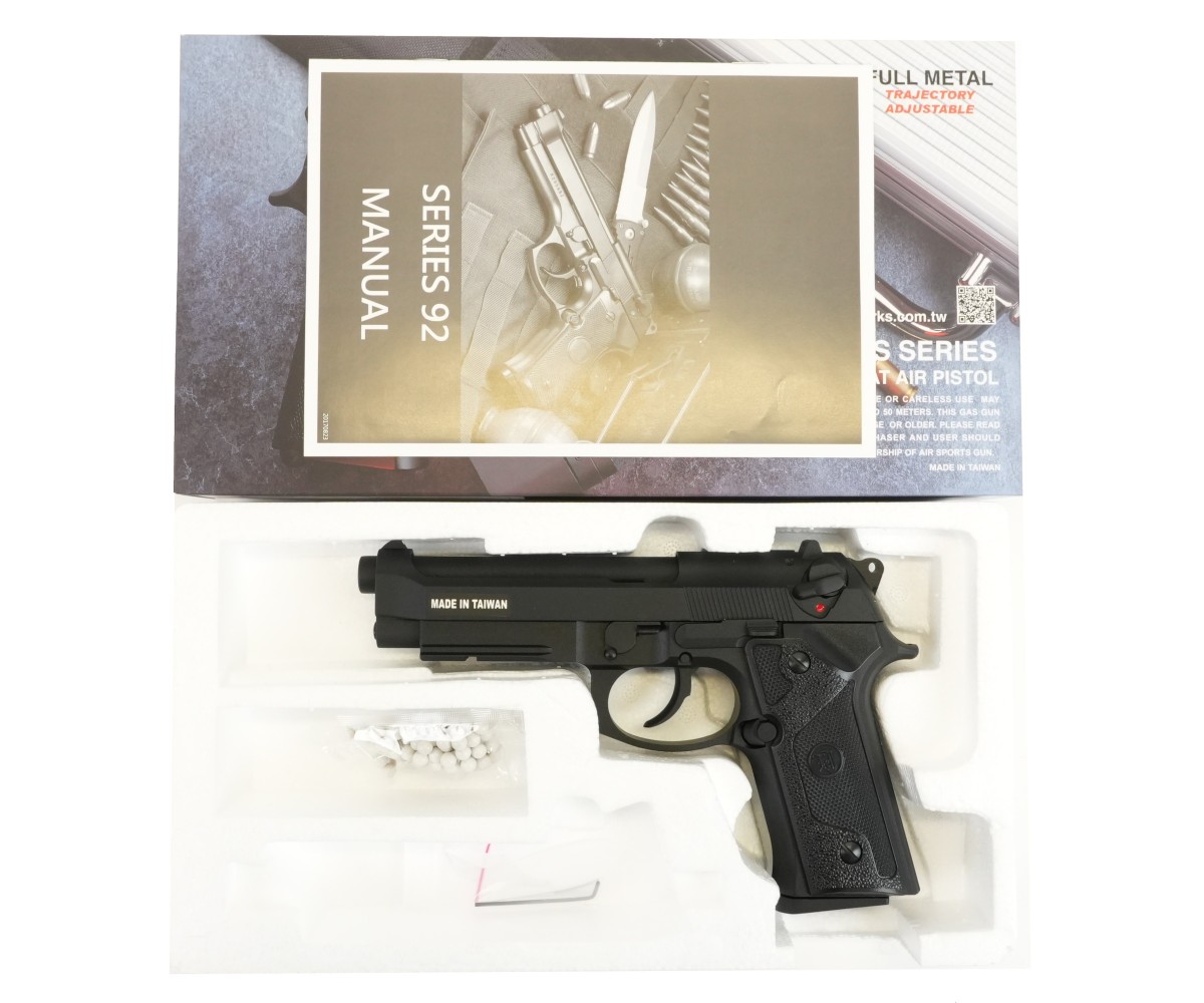 Страйкбольный пистолет M9 VE-FM от фирмы KJWorks внешне копирует одну из моделей семейства Beretta 92/M9. Предлагаемый вариант использует в качестве источника энергии грин газ. Затвор пистолета подвижный, при израсходовании всех шаров срабатывает затворная задержка; имеется блоубэк. По аналогии с прототипом реализована неполная разборка.