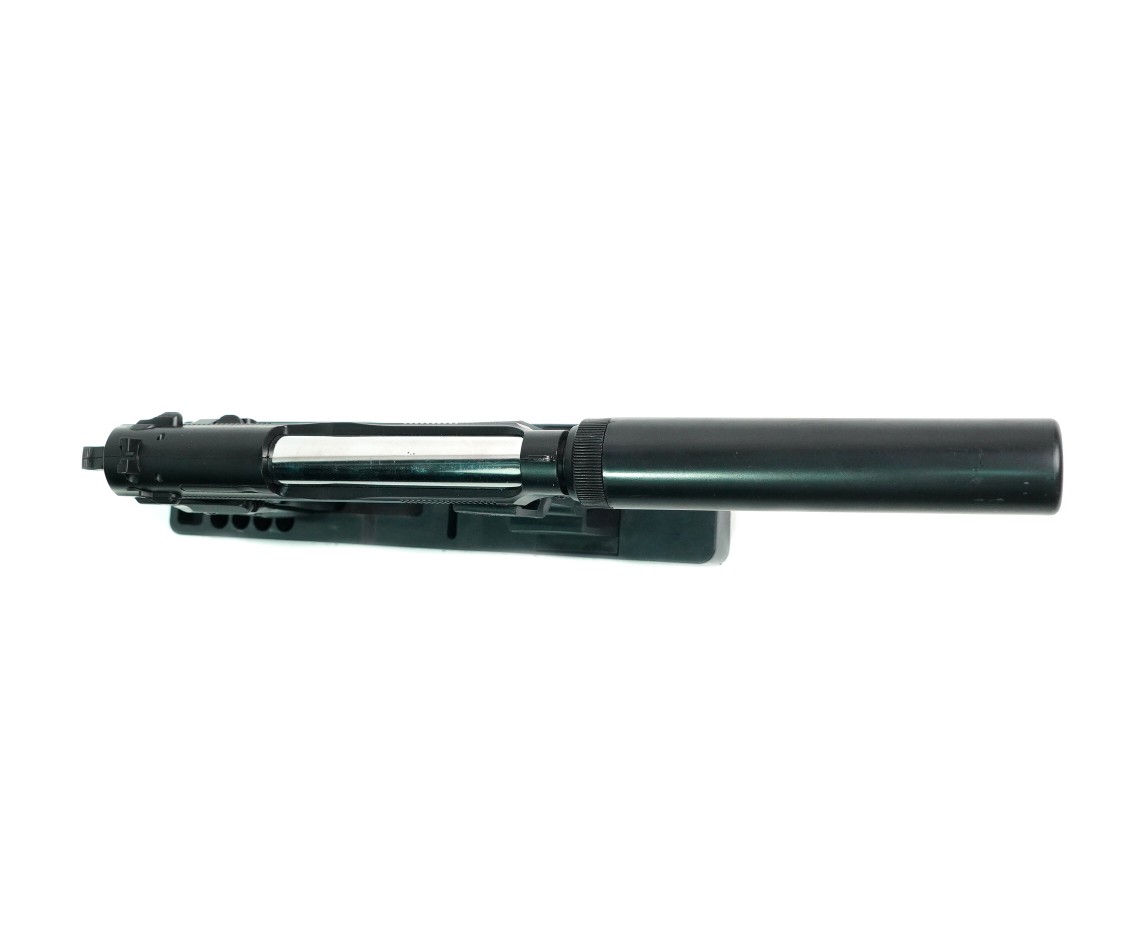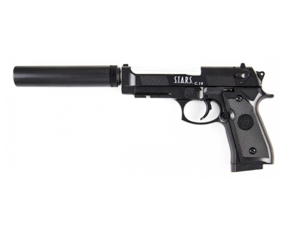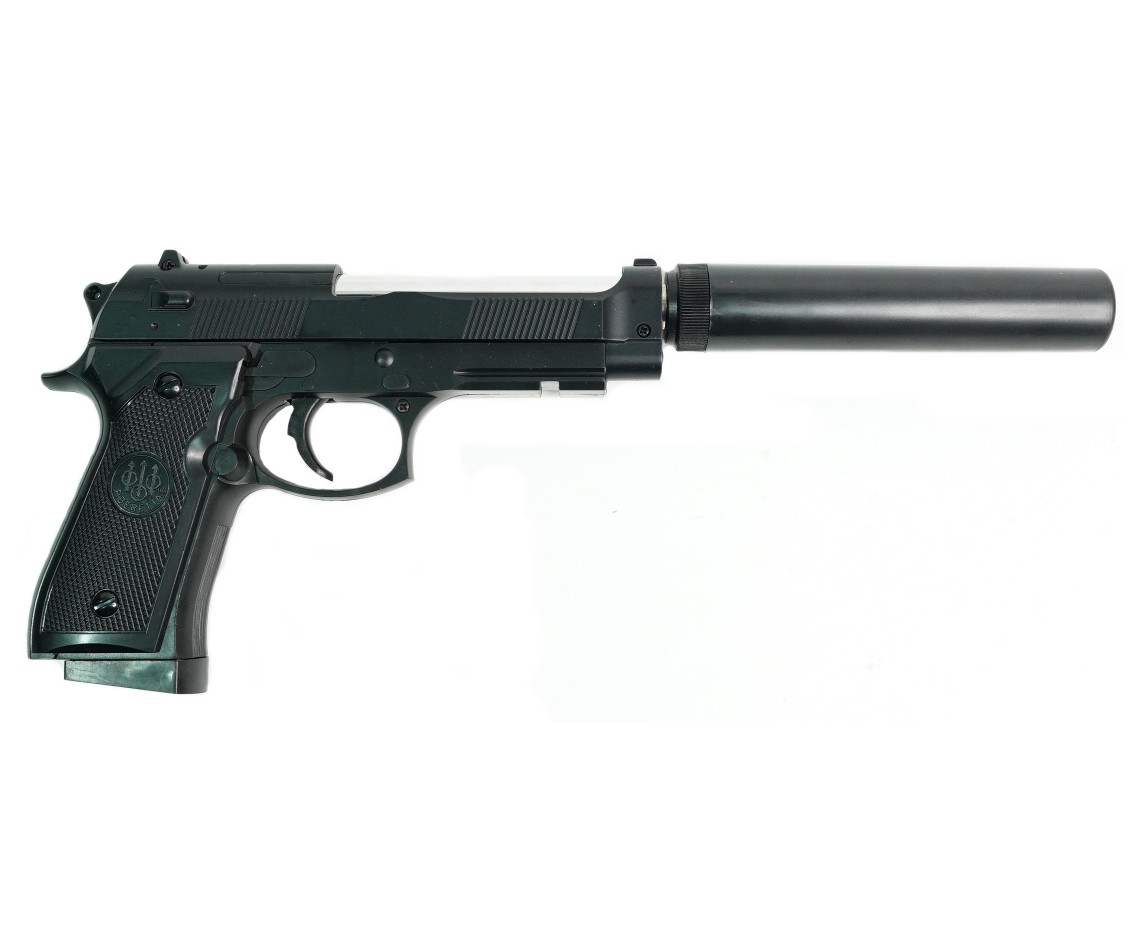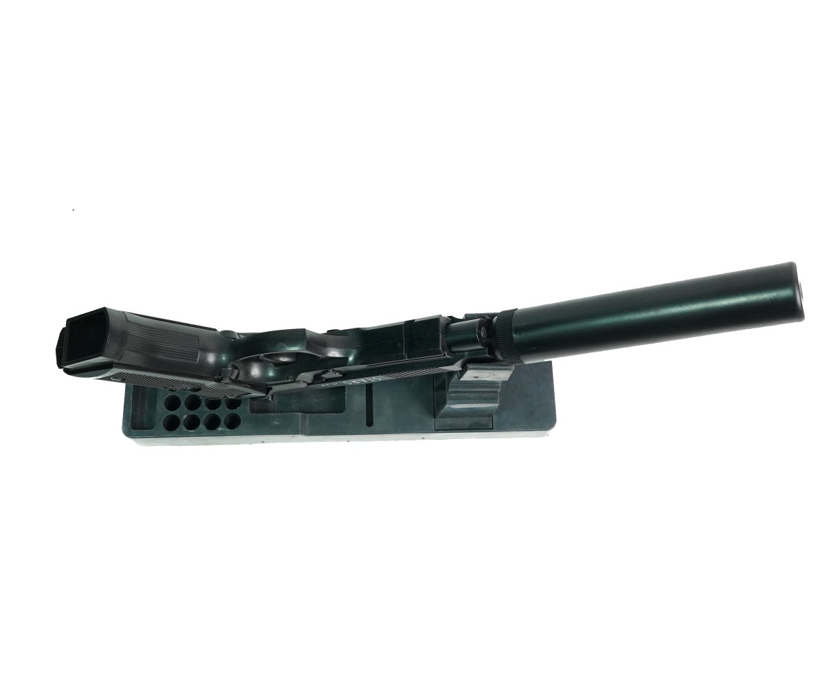 Главная особенность этой модели – имитация глушителя, придающая пистолету более агрессивный и тактический вид. С глушителем длина пистолета составляет 320 мм, без него – 190 мм. Корпус изготовлен из комбинации металла и ABS-пластика, обеспечивая прочность и реалистичный вес. Черный цвет придает пистолету строгий и профессиональный вид. Несмотря на отсутствие Blowback и одиночный режим стрельбы, пистолет обладает достойной точностью и надежностью. Наличие планки Weaver / Picatinny позволяет установить дополнительные аксессуары, такие как фонарик или лазерный целеуказатель.