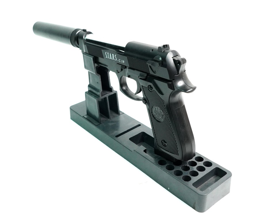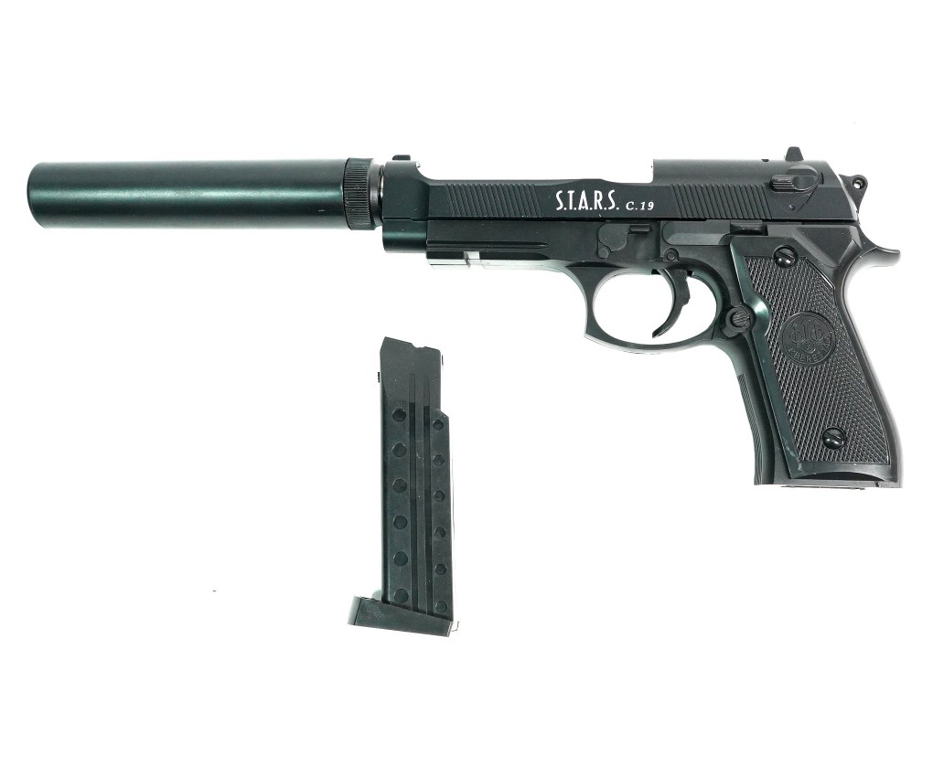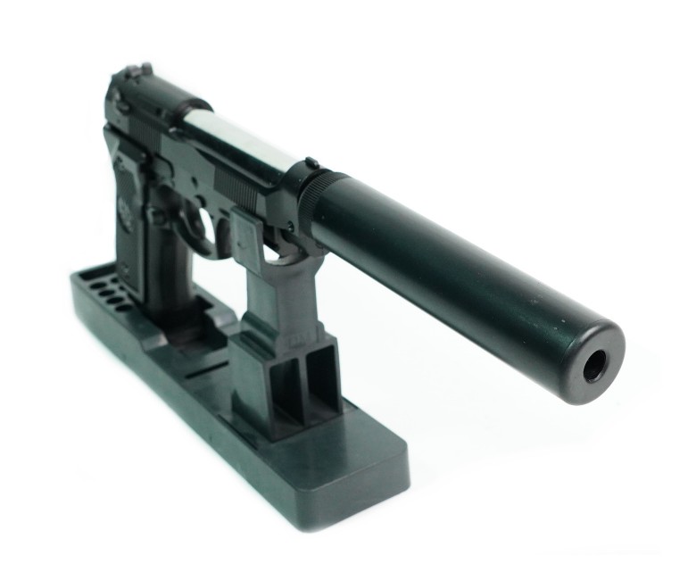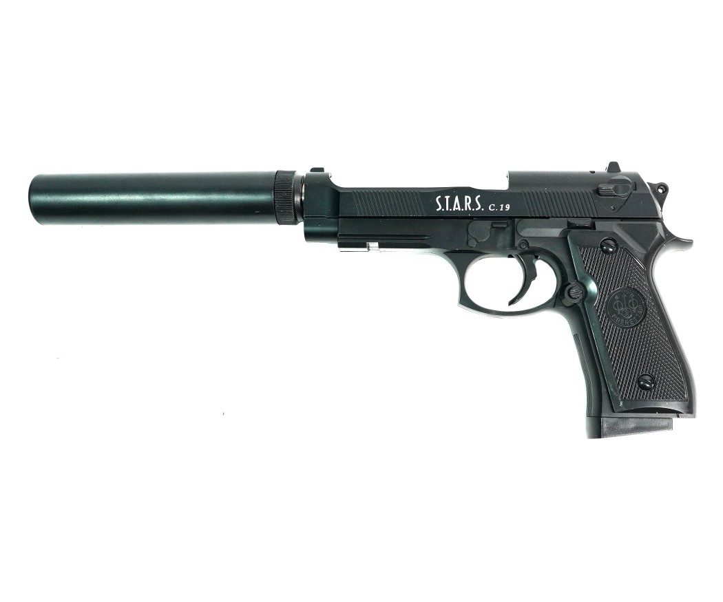 Главная особенность этой модели – имитация глушителя, придающая пистолету более агрессивный и тактический вид. С глушителем длина пистолета составляет 320 мм, без него – 190 мм. Корпус изготовлен из комбинации металла и ABS-пластика, обеспечивая прочность и реалистичный вес. Черный цвет придает пистолету строгий и профессиональный вид. Несмотря на отсутствие Blowback и одиночный режим стрельбы, пистолет обладает достойной точностью и надежностью. Наличие планки Weaver / Picatinny позволяет установить дополнительные аксессуары, такие как фонарик или лазерный целеуказатель.