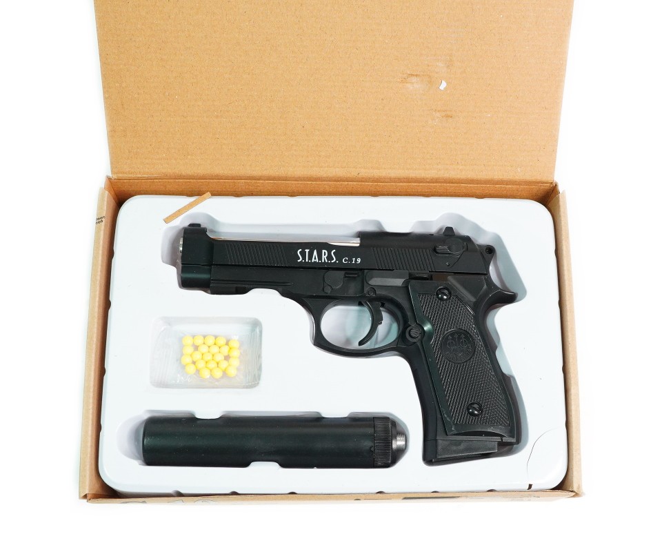Пистолет Shantou C.19+ работает по спринговому принципу, требуя ручного взведения перед каждым выстрелом. Пружинный механизм обеспечивает дульную энергию в 0,5 Дж, разгоняя шарики калибра 6 мм до скорости 60-69 м/с. Магазин вмещает 12 шариков, позволяя сделать несколько прицельных выстрелов.