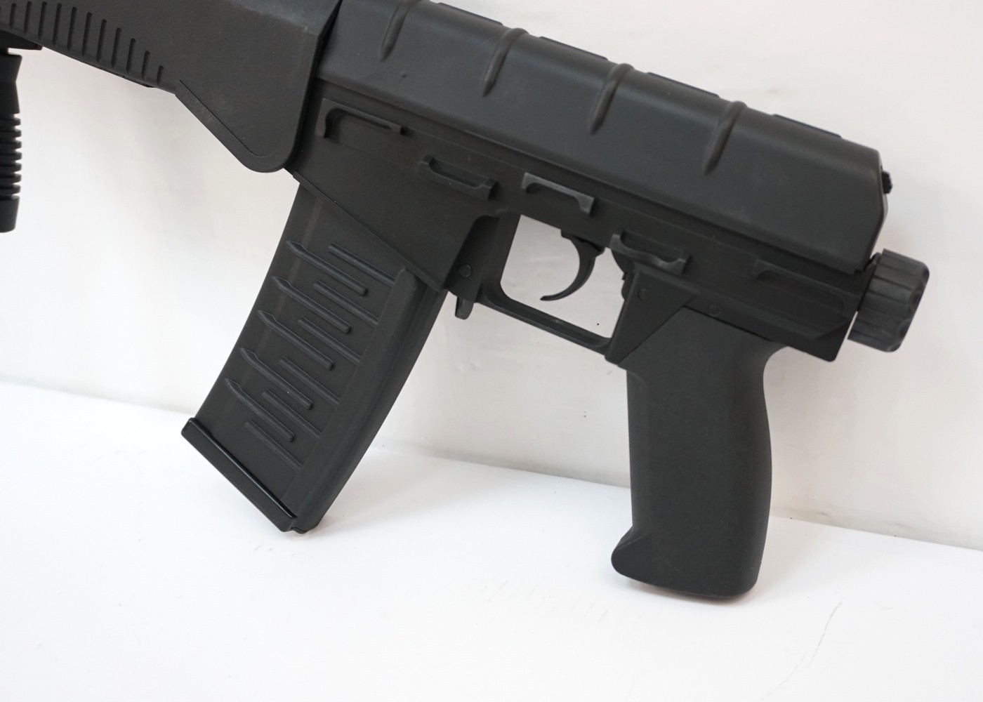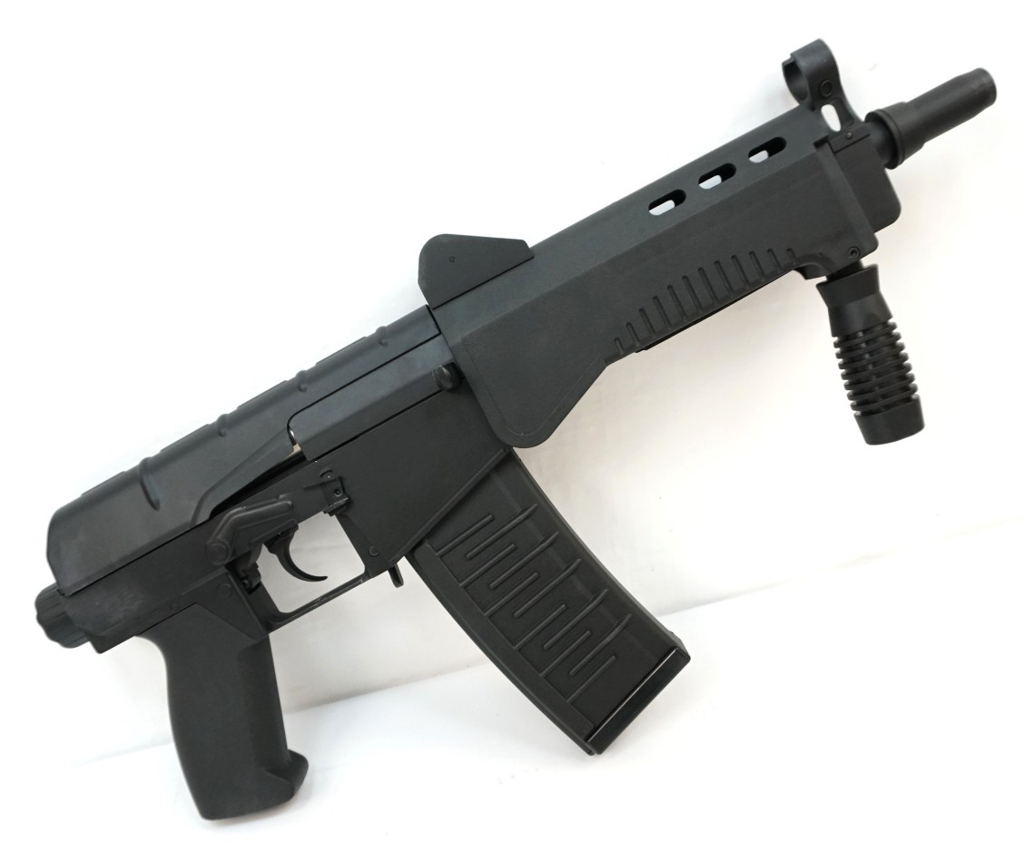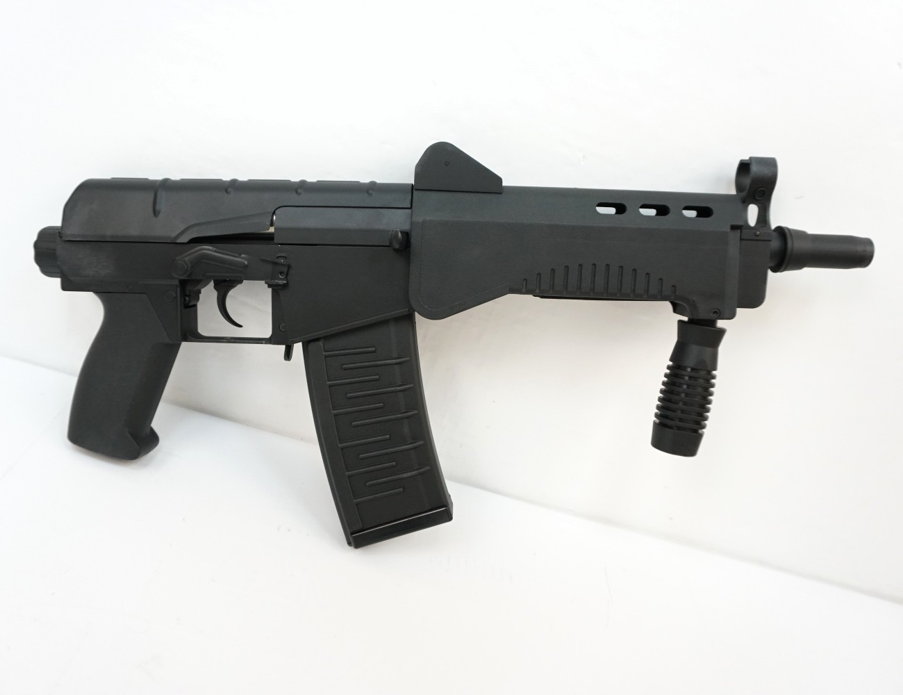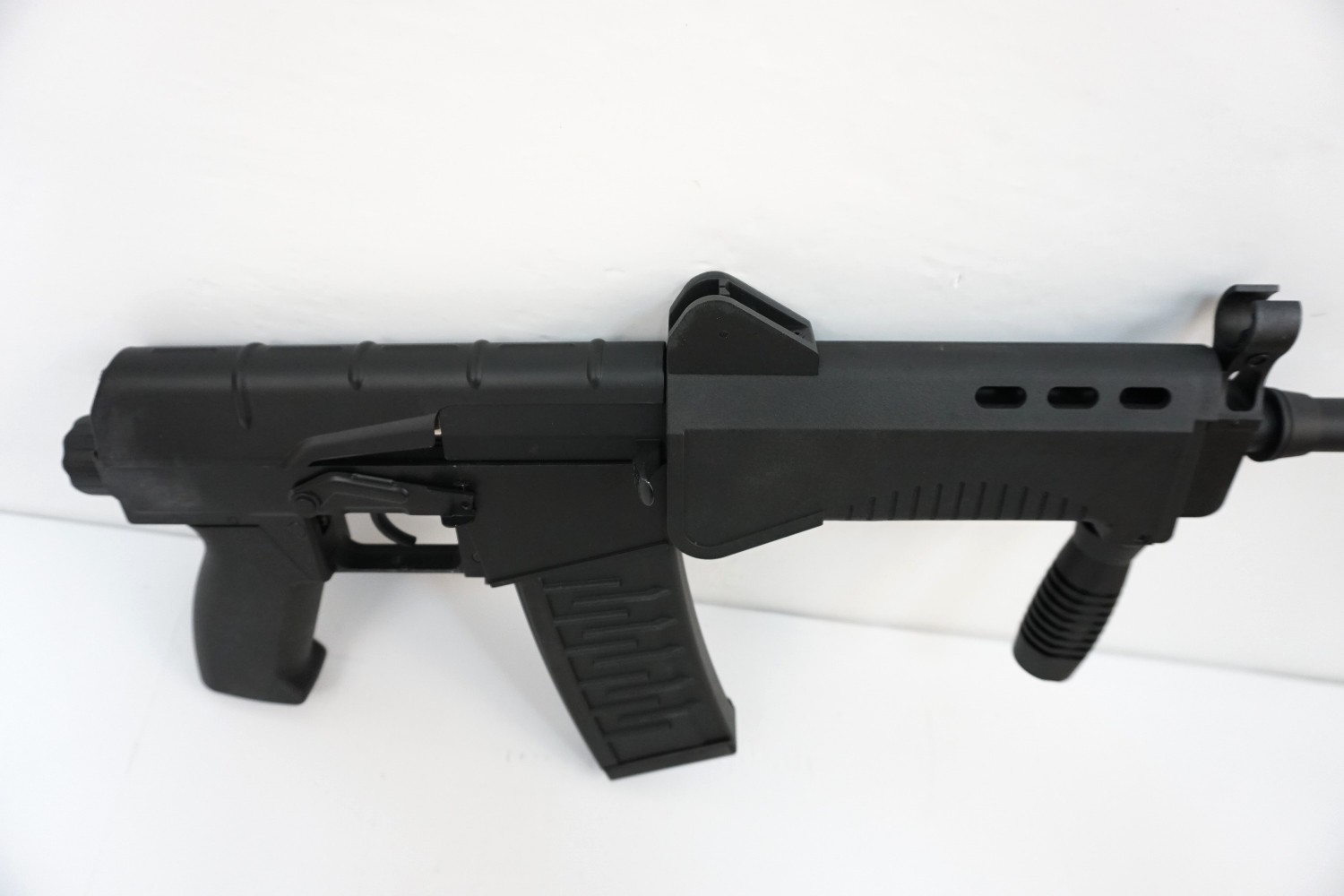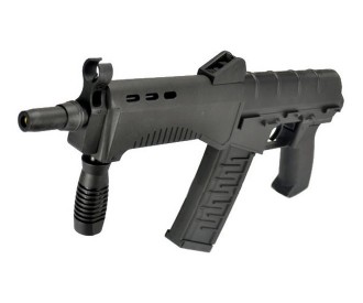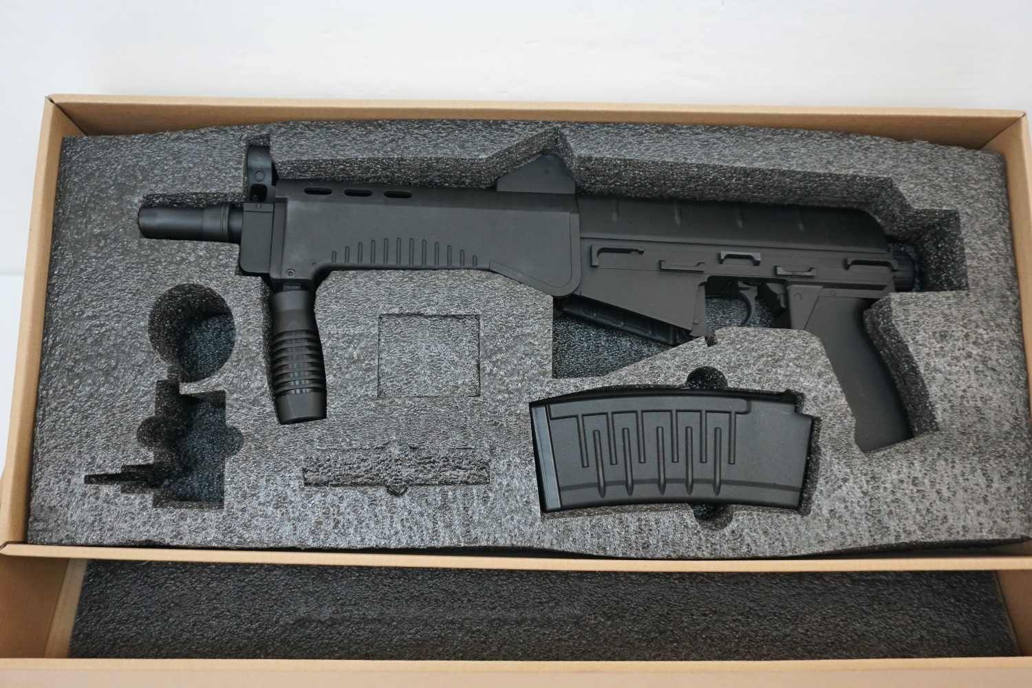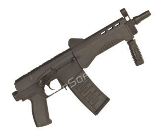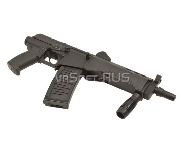 Особенностью автомата является складной рамочный приклад, складываемый влево, а также цевье с дополнительной рукояткой складного типа. Ответственные элементы автомата изготовлены из металлического сплава, корпус из ABS пластика. С левой стороны корпуса установлен прилив для крепления оптики. Изделие обладает небольшим весом – 2,7 кг и укороченной длиной всего 49 см. В комплекте поставляется привод, магазин и паспорт.