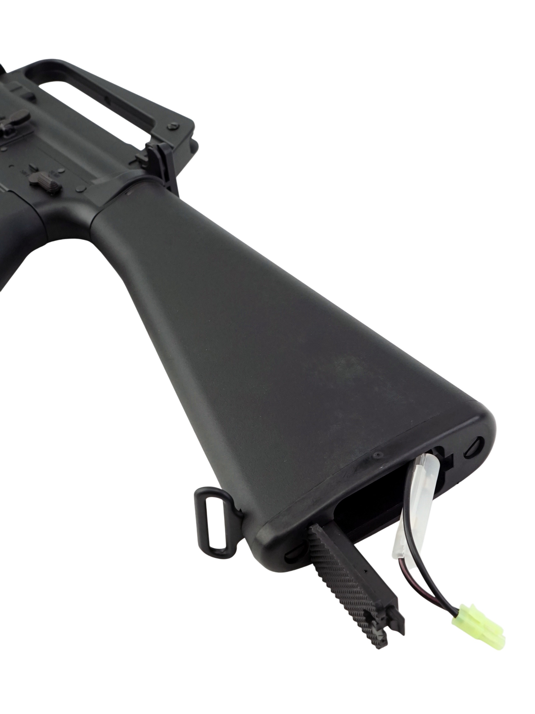 Страйкбольный автомат Cyma M16A1 Vietnam Ver. (CM.009A1) – это версия популярной у игроков винтовки М16А1, которой были вооружены американские солдаты во время Вьетнамской войны, разработка проверенного производителя. Изделие относится к электропневматике, и работает от аккумулятора NiMH 8,4 V емкостью 1100mAh. Отсек для аккумулятора располагается в рукоятке. Конструкция ствольной коробки состоит из двух частей: нижнего и верхнего ресивера, соединенных двумя штифтами. Качество соединения отличное, люфты отсутствуют. Гирбокс версии 2 алюминиевый.