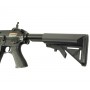 Автомат Цима М4 Сайлент Армс отличается облегченным весом за счет использования пластика – вес оружия всего 1,9 кг. Выдвижной приклад позволяет настроить длину автомата каждому игроку индивидуально, и добиться наиболее удобного упора в плечо при стрельбе. Цевье Сайлент Армс полностью покрывает внешний ствол автомата, и оборудовано рис-планками для установки разнообразного обвеса. На таком цевье можно закрепить дополнительные стрелковые приспособления.