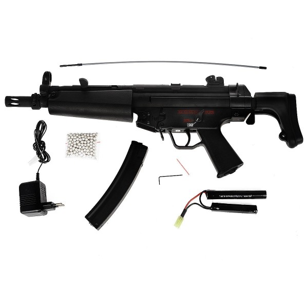 За счет телескопического приклада привод компактный, и очень удобен в ближнем бою и для маневров внутри зданий. Основной материал изготовления привода – сплав на основе алюминия, приклад и цевье здесь пластиковые. Вес – 3,2 кг, длина – 75 см. В комплект изделия входят магазин, аккумулятор, ЗУ, шарики, шомпол и инструкция.